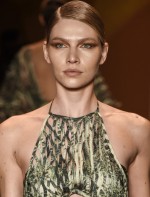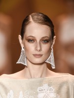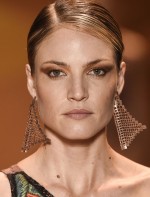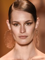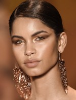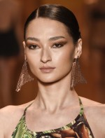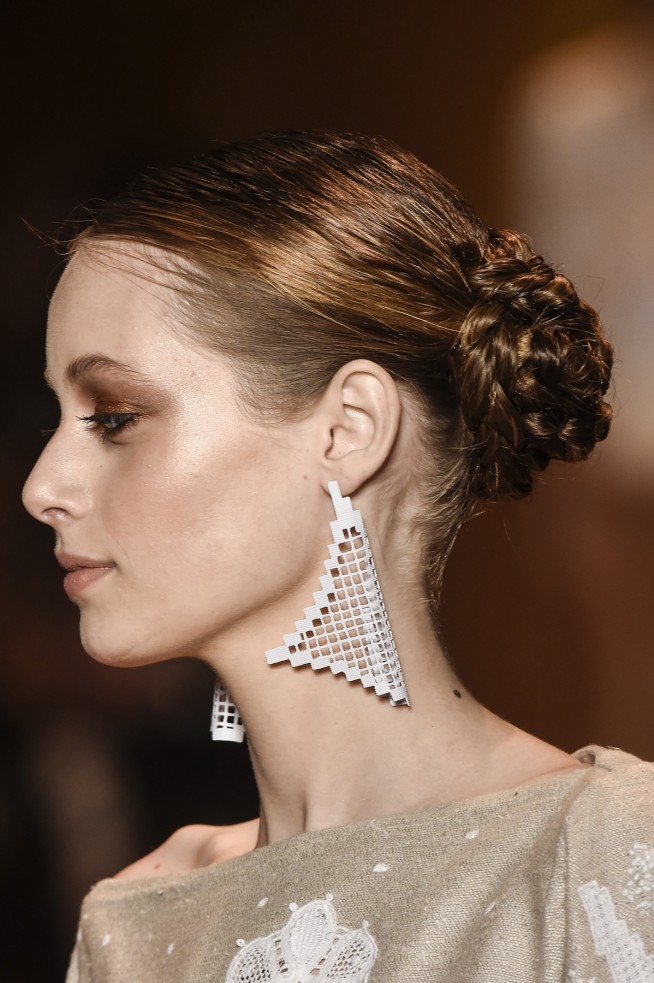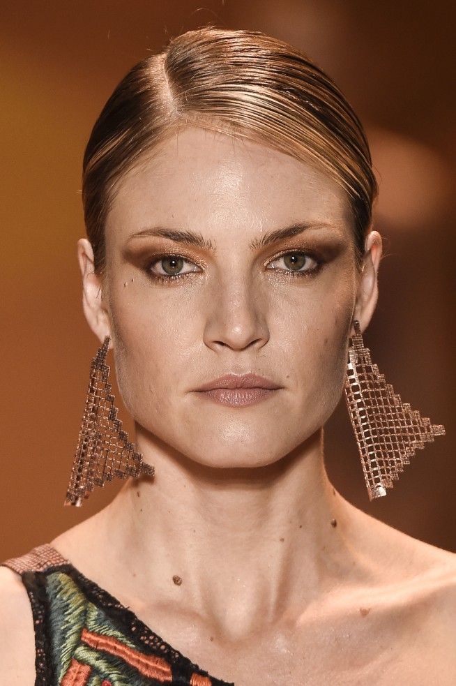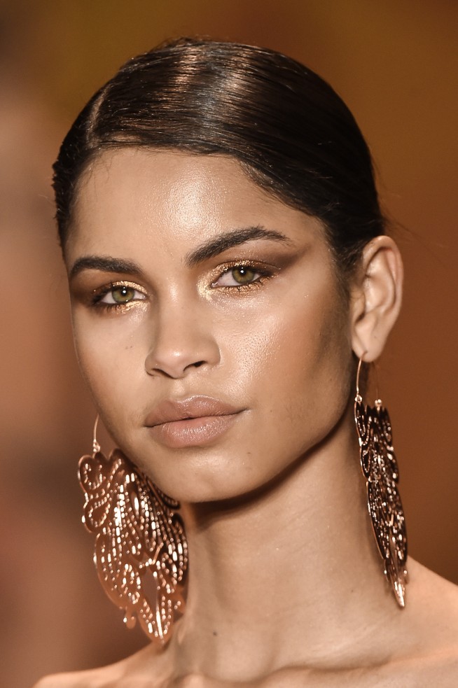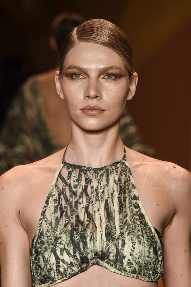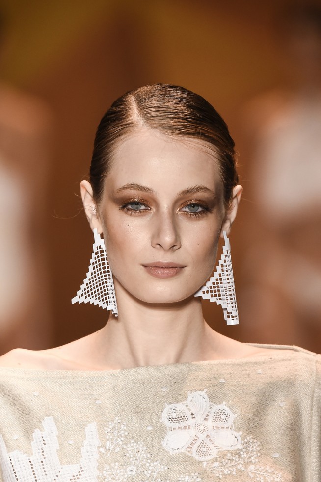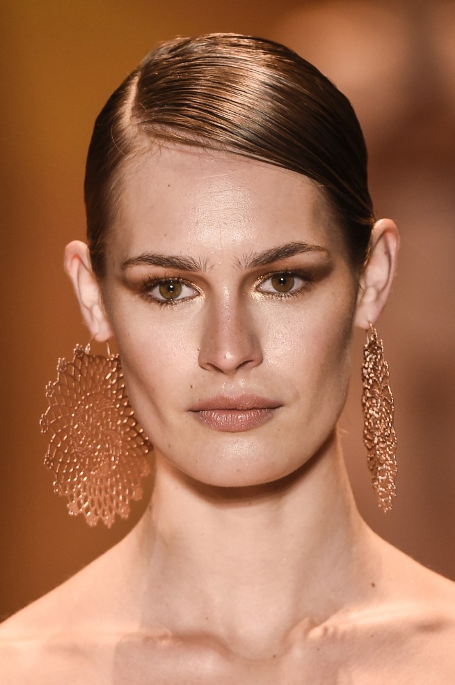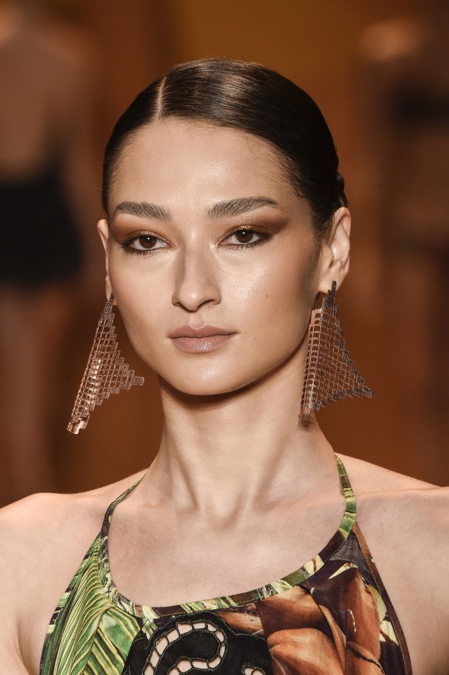 A maquiagem com sombra dourada e o coque disciplinado na frente completam o visual elegante e fresco.