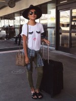 As t-shirts são sempre uma boa ideia na hora de escolher o look da viagem. Elas são confortáveis e não deixam o estilo de lado. O ar-condicionado do avião é bem gelado. Além de um tricô quentinho, vale levar uma pashmina! É quentinha e dá um toque sofisticado ao look.