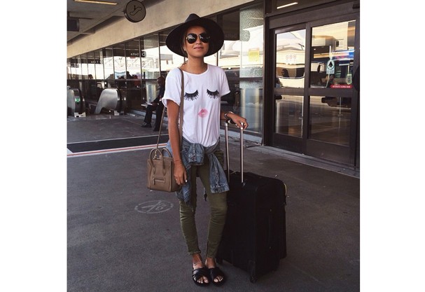 As t-shirts são sempre uma boa ideia na hora de escolher o look da viagem. Elas são confortáveis e não deixam o estilo de lado. O ar-condicionado do avião é bem gelado. Além de um tricô quentinho, vale levar uma pashmina! É quentinha e dá um toque sofisticado ao look.