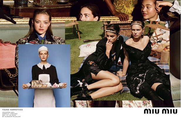 A irmã mais mova da maison italiana Prada, pegou o lado mais inglês do país e faz uma campanha que mostra muito artesanato, cores, irreverência, e mostra que a mova mulher Miu Miu faz releitura a regras fashions do passado. Muito tweed, camisolas, jaquetas, e chinelo de pelo, fazem parte do inverno da marca.