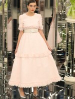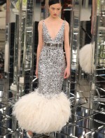 Para essa nova coleção a marca trás de volta o poder do tailleur para o verão, a cintura marcada, ombros e quadris levemente marcados. E também muito paetê e bordados prateados arrematados por camadas e plumas tom pastel na barra.