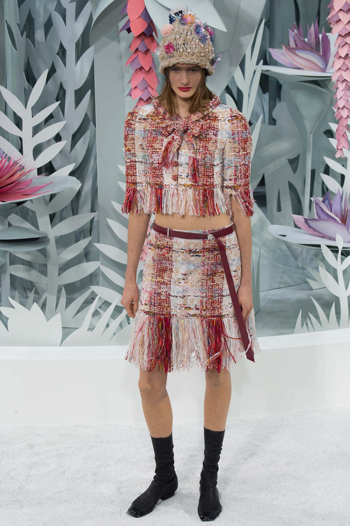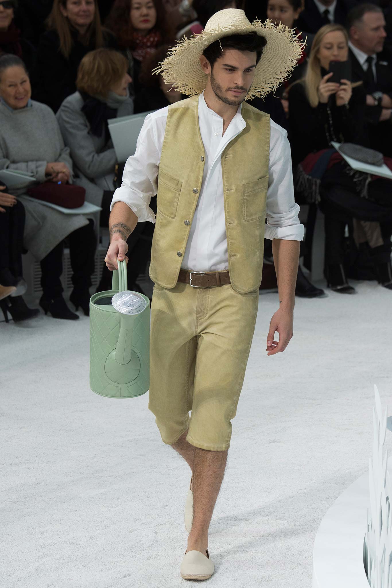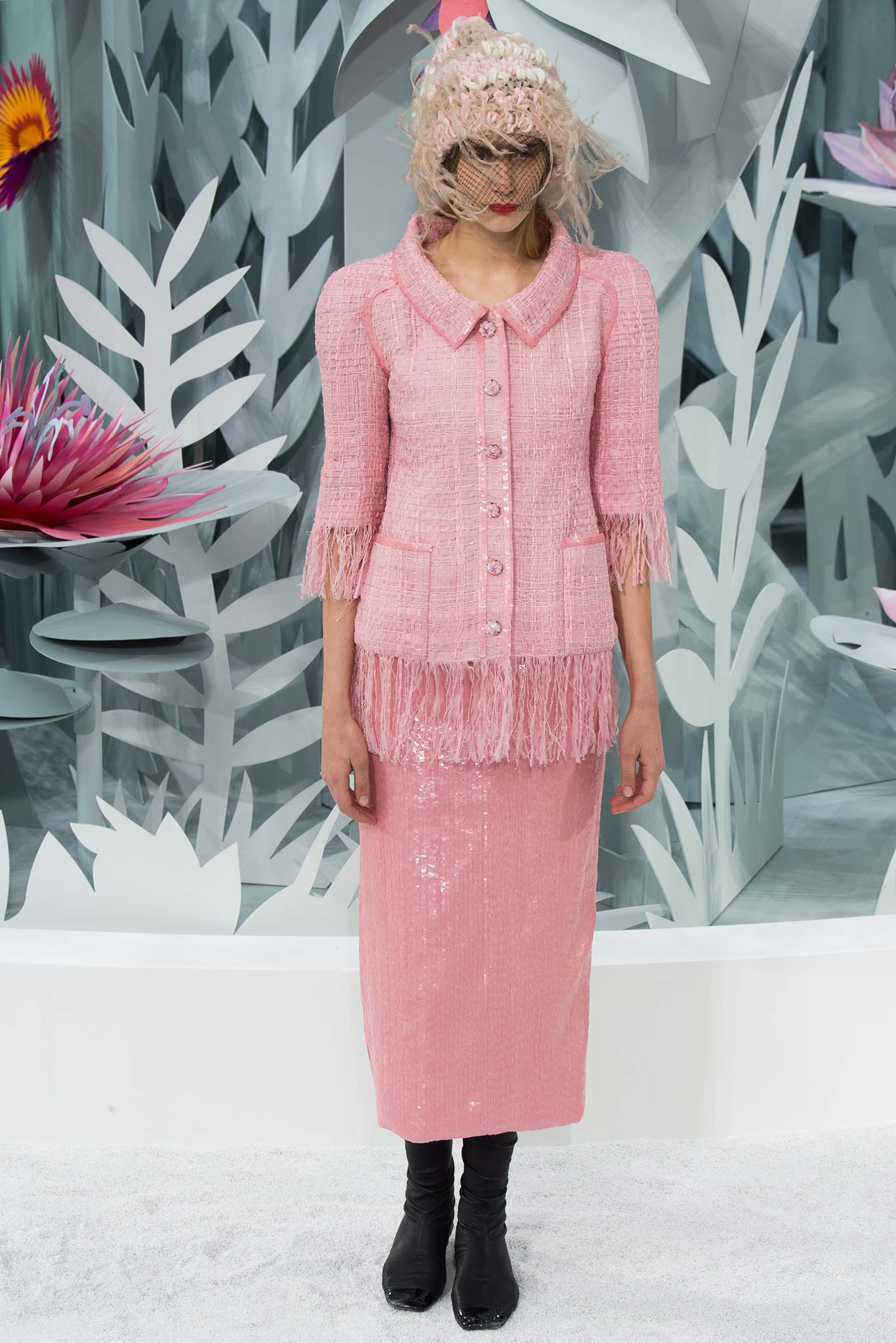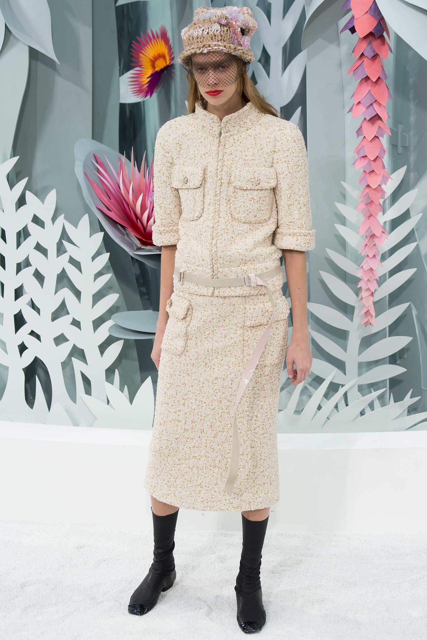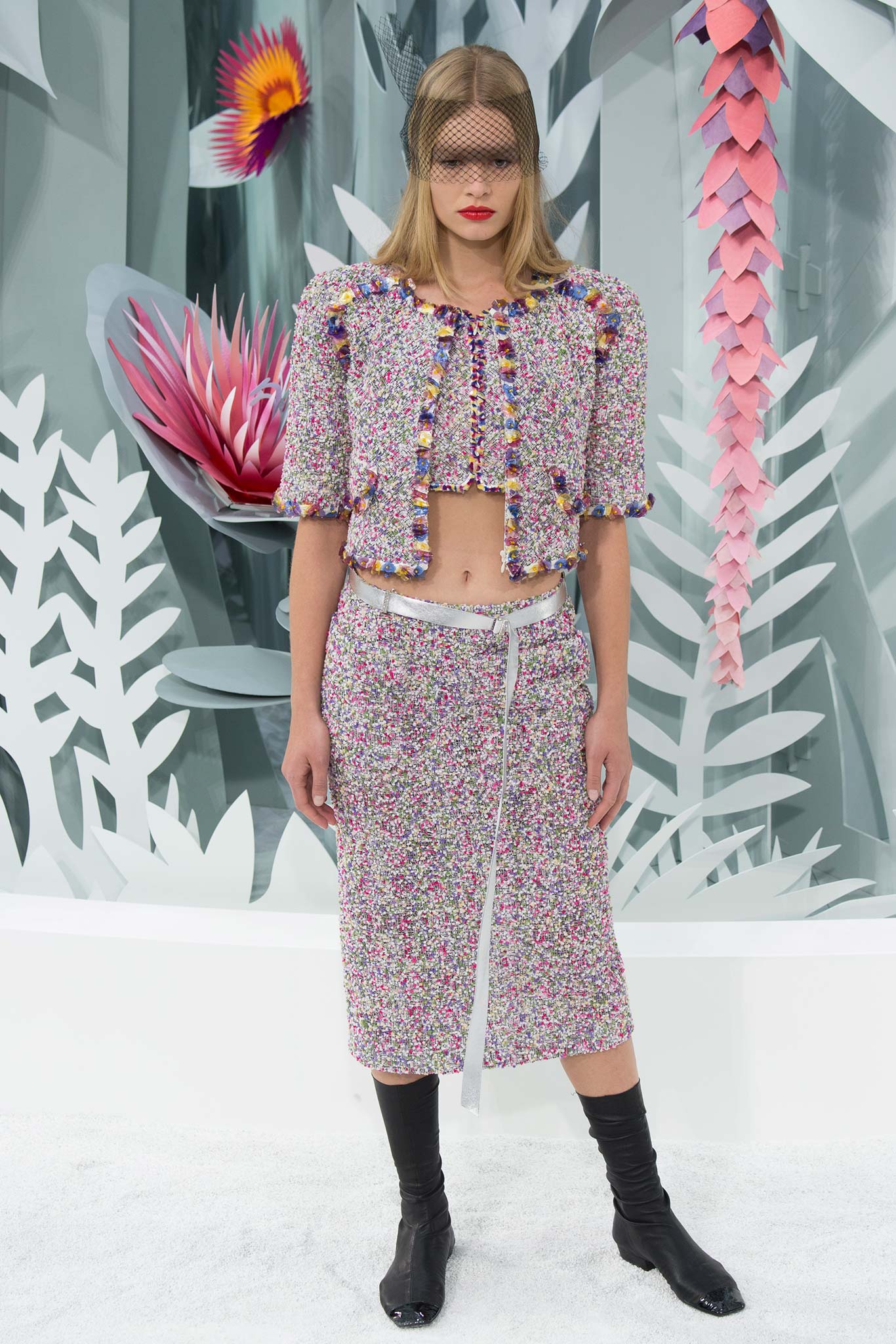 Com direito à um cenário em meio de flores, o desfile mais esperado da semana começa e as mesmas cores da decoração começam a florescer. Tons de rosa, amarelo, verde, laranja e azul invadem a passarela após um jardineiro entrar com seu regador e chapéu de palha. Looks em tweed colorido e p&b, saias, shorts e vestidos (reparem que não tinha nenhuma calça no desfile todo!) são combinados com o famoso jaquet em diferentes formatos. “Colorful and delicate” – “Colorida e delicada”, são as palavras que Karl usou para descrever sua coleção. Check it out: