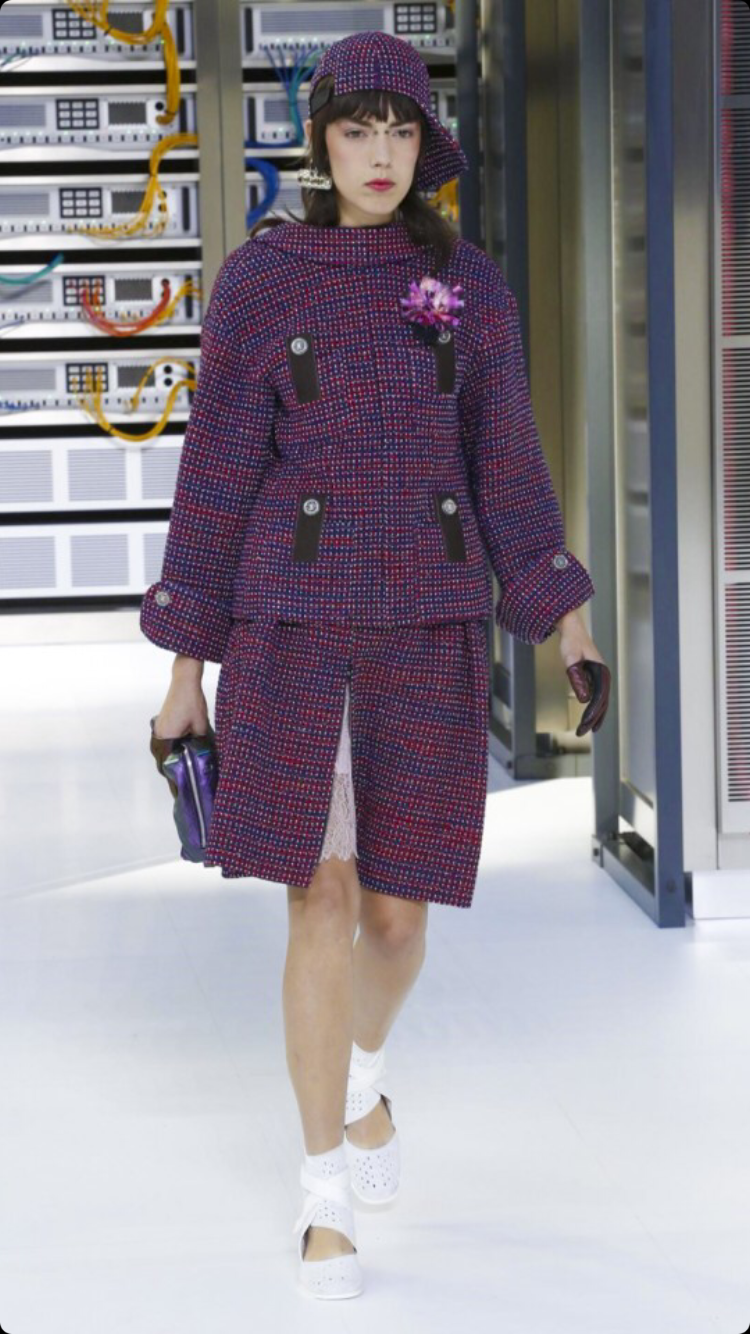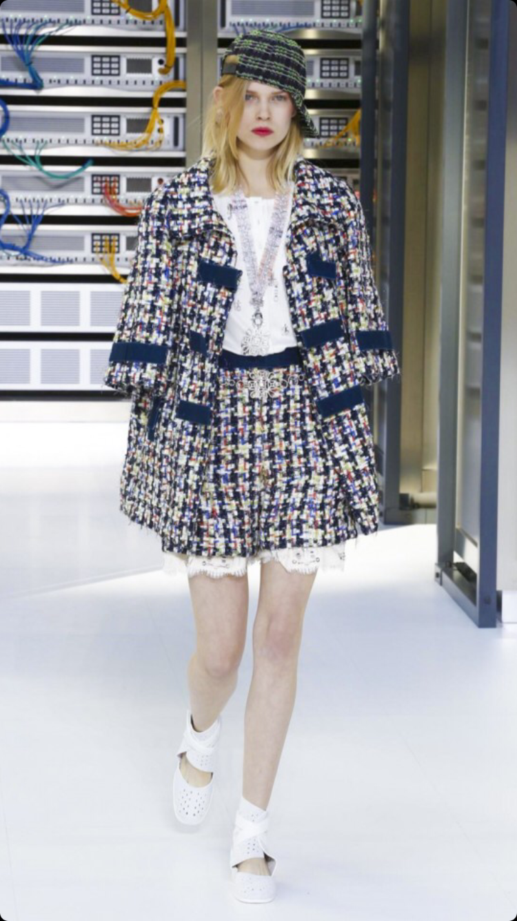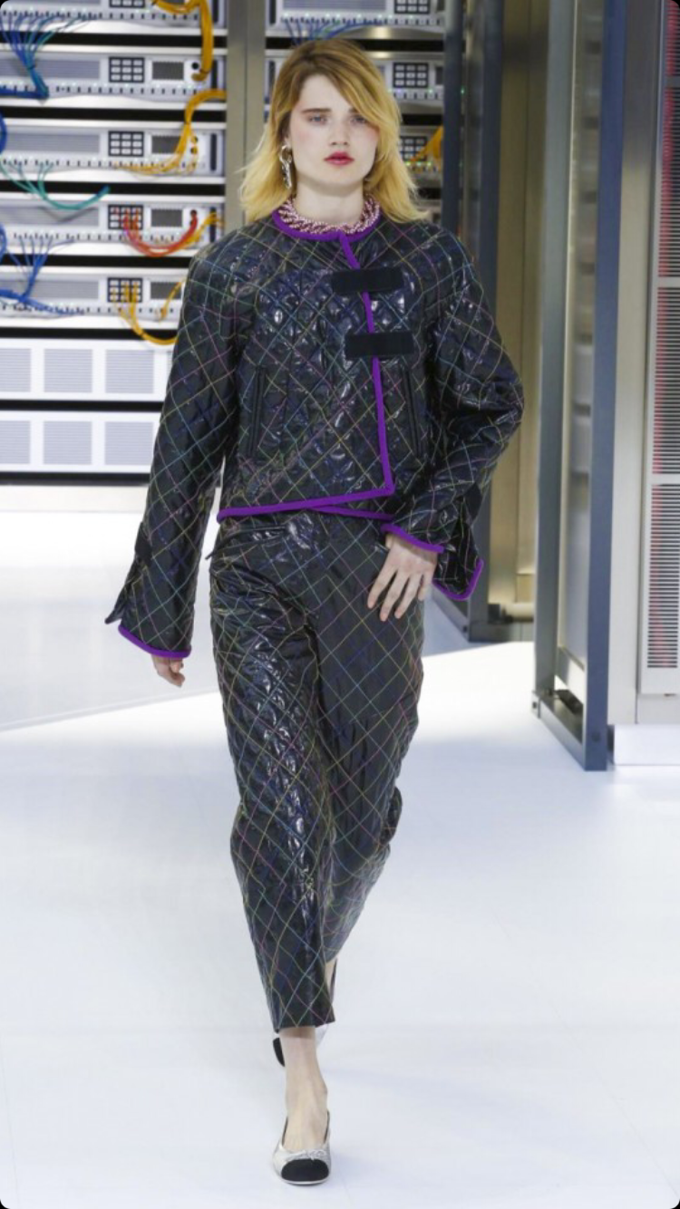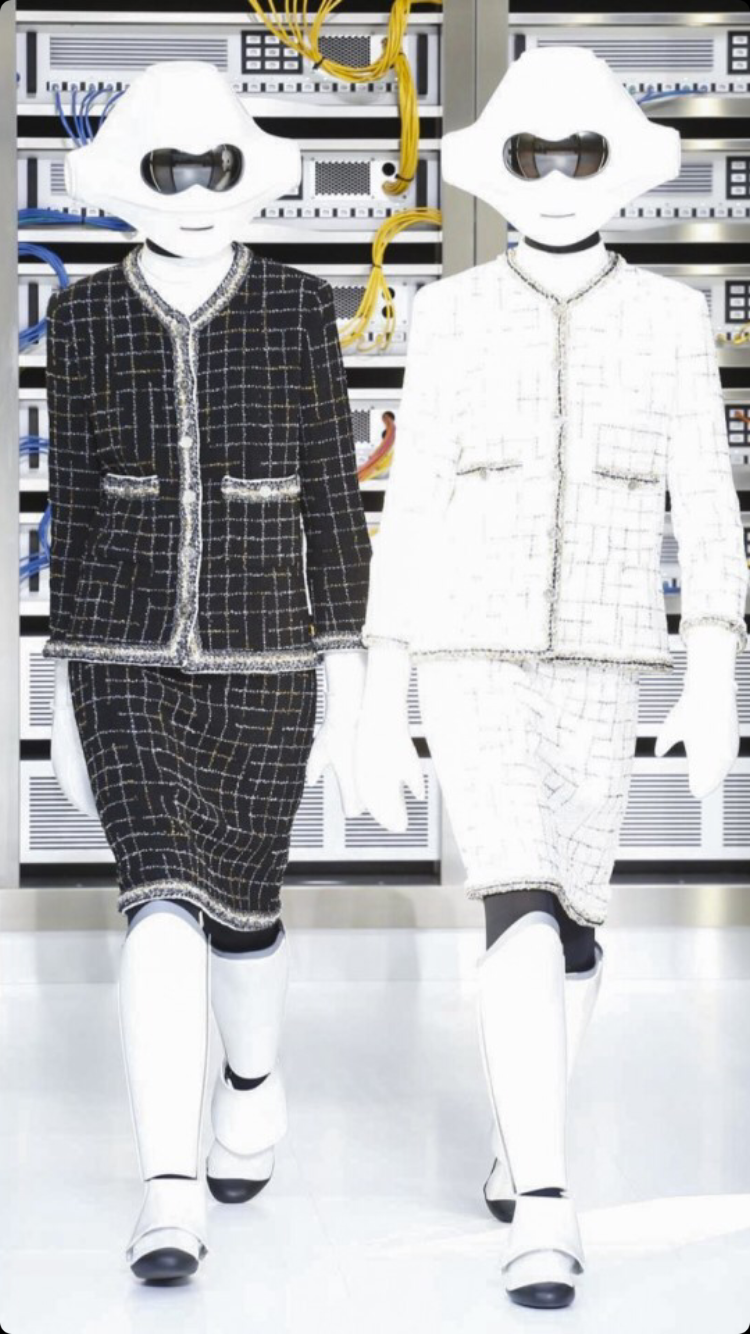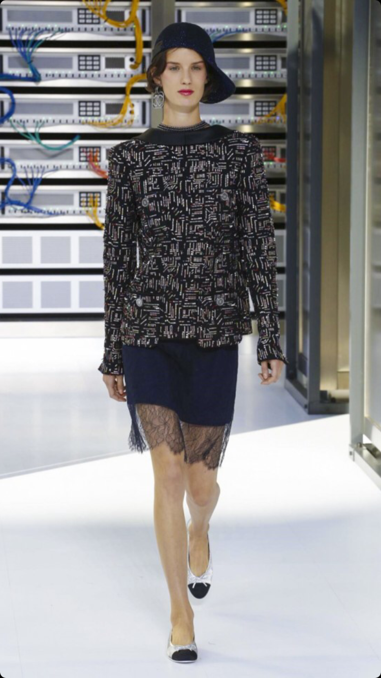 O tema do show esse ano foi computadores, cyber e o futuro. O desfile foi chamado de Data Center Chanel. O primeiro look que entrou na passarela foi usado por duas modelos com máscaras de robô, bem como sapato e luva. Parecia uma versão feminina do grupo eletrônico Daft Punk.