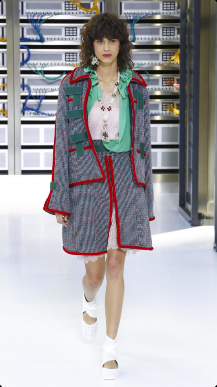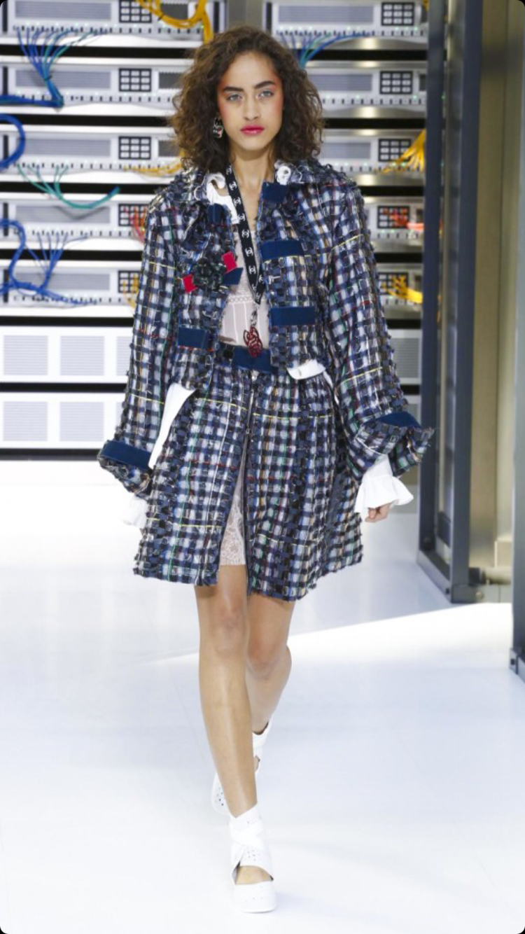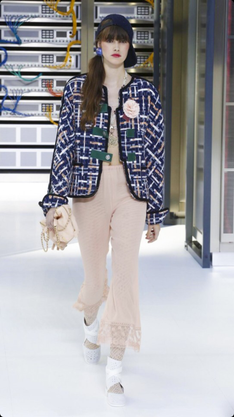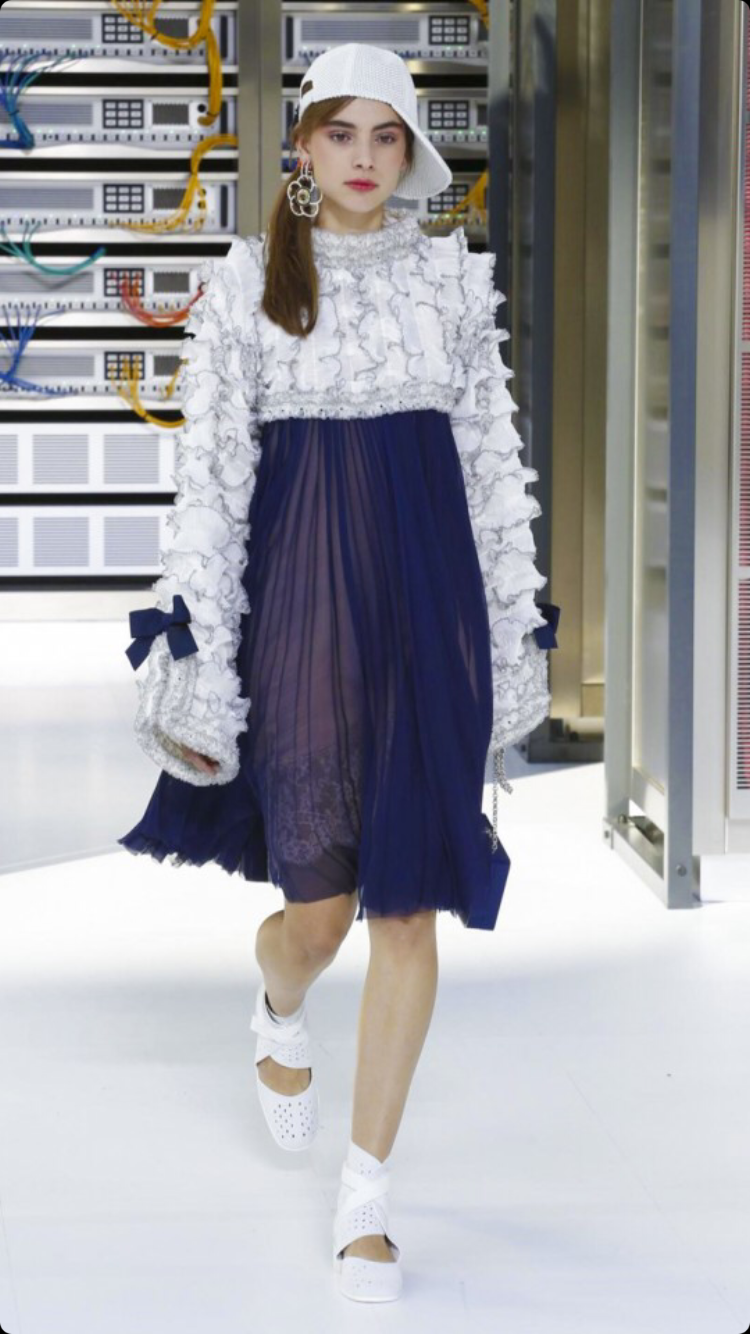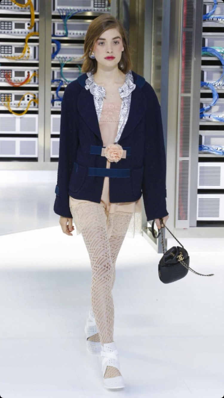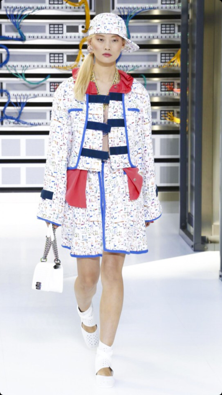 O tema do show esse ano foi computadores, cyber e o futuro. O desfile foi chamado de Data Center Chanel. O primeiro look que entrou na passarela foi usado por duas modelos com máscaras de robô, bem como sapato e luva. Parecia uma versão feminina do grupo eletrônico Daft Punk.