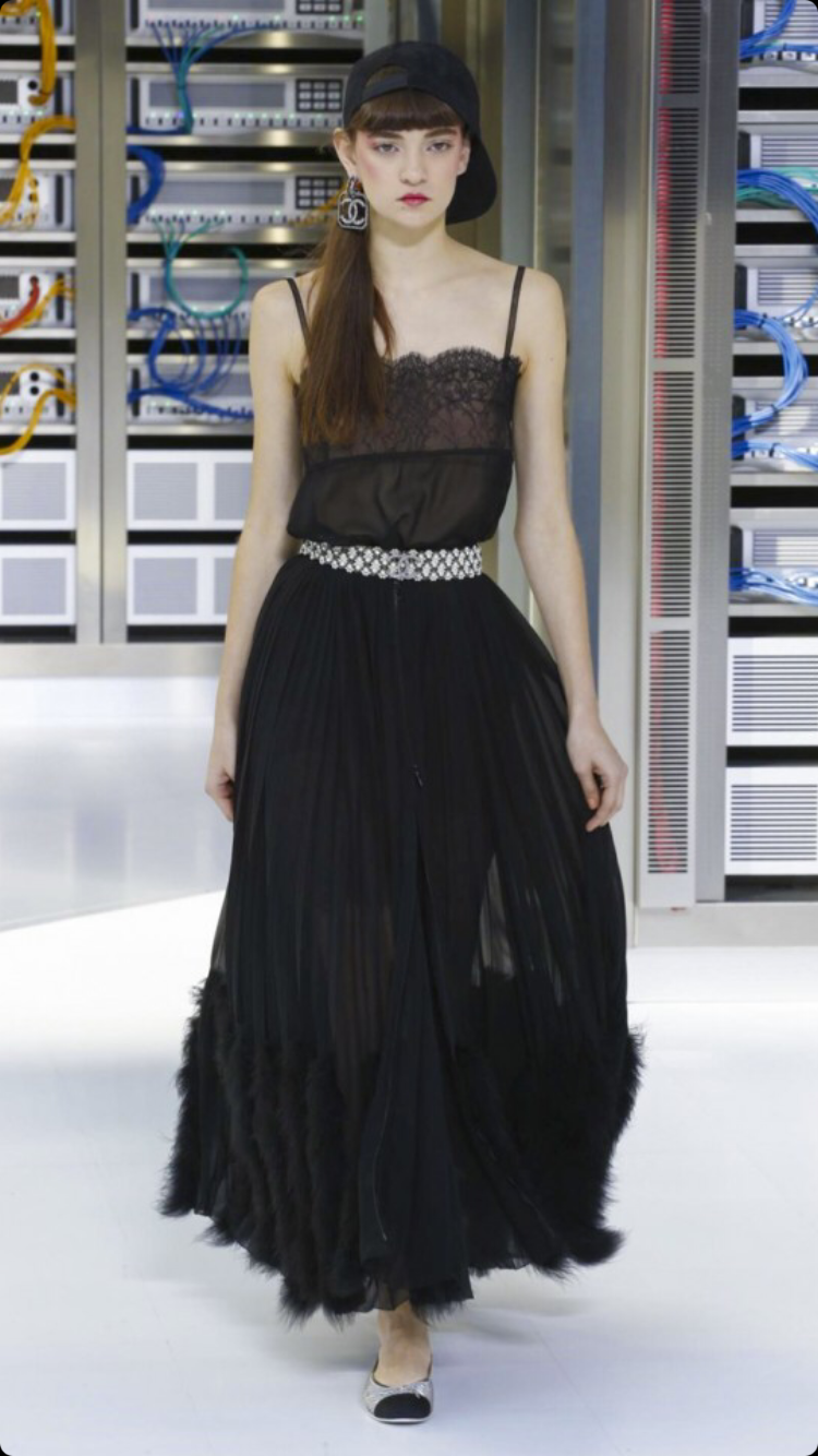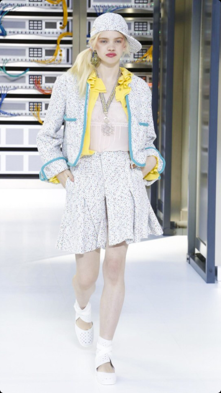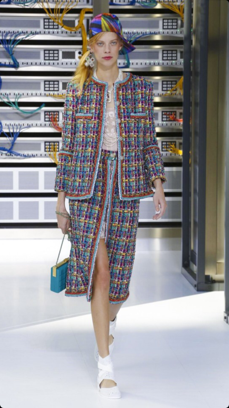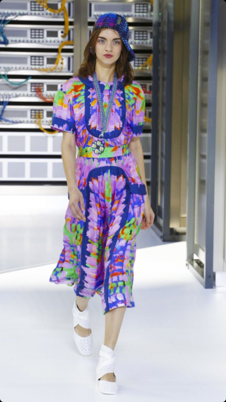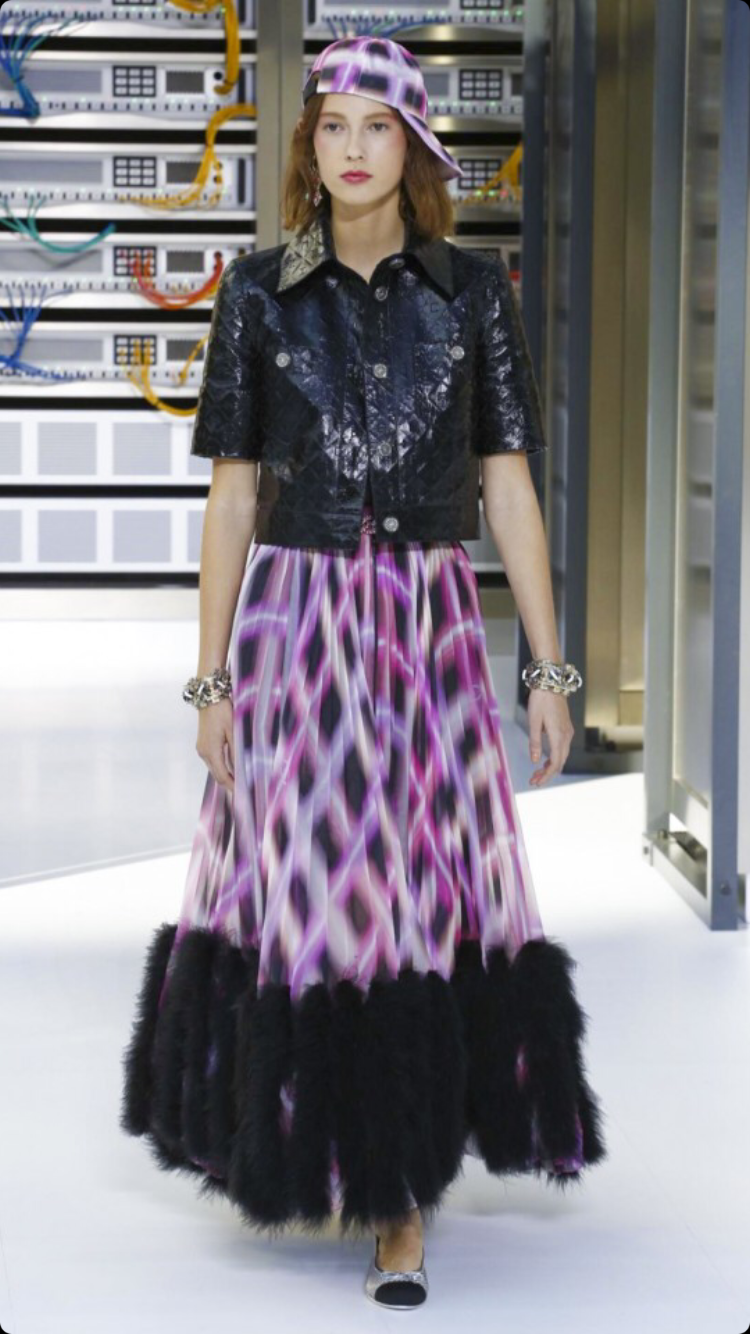 O tema do show esse ano foi computadores, cyber e o futuro. O desfile foi chamado de Data Center Chanel. O primeiro look que entrou na passarela foi usado por duas modelos com máscaras de robô, bem como sapato e luva. Parecia uma versão feminina do grupo eletrônico Daft Punk.