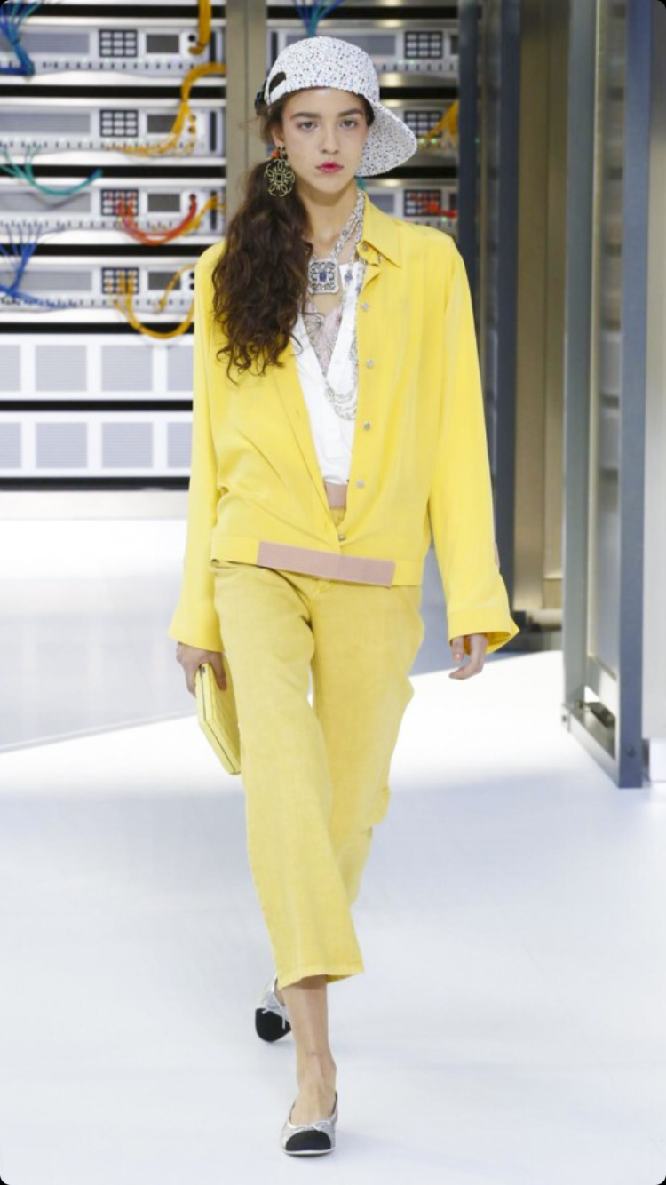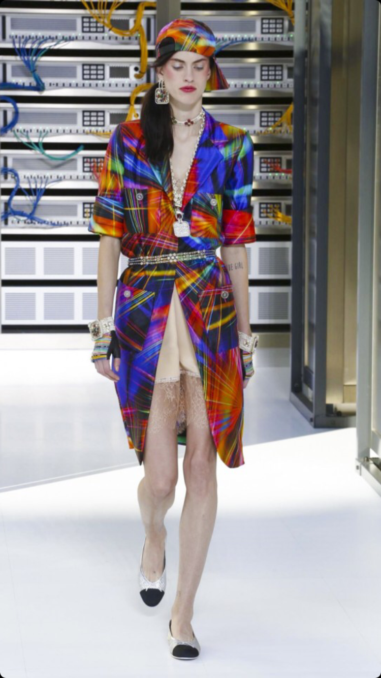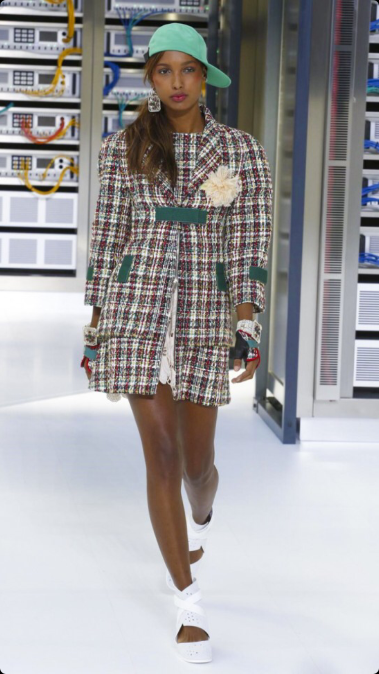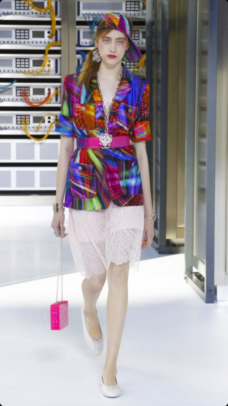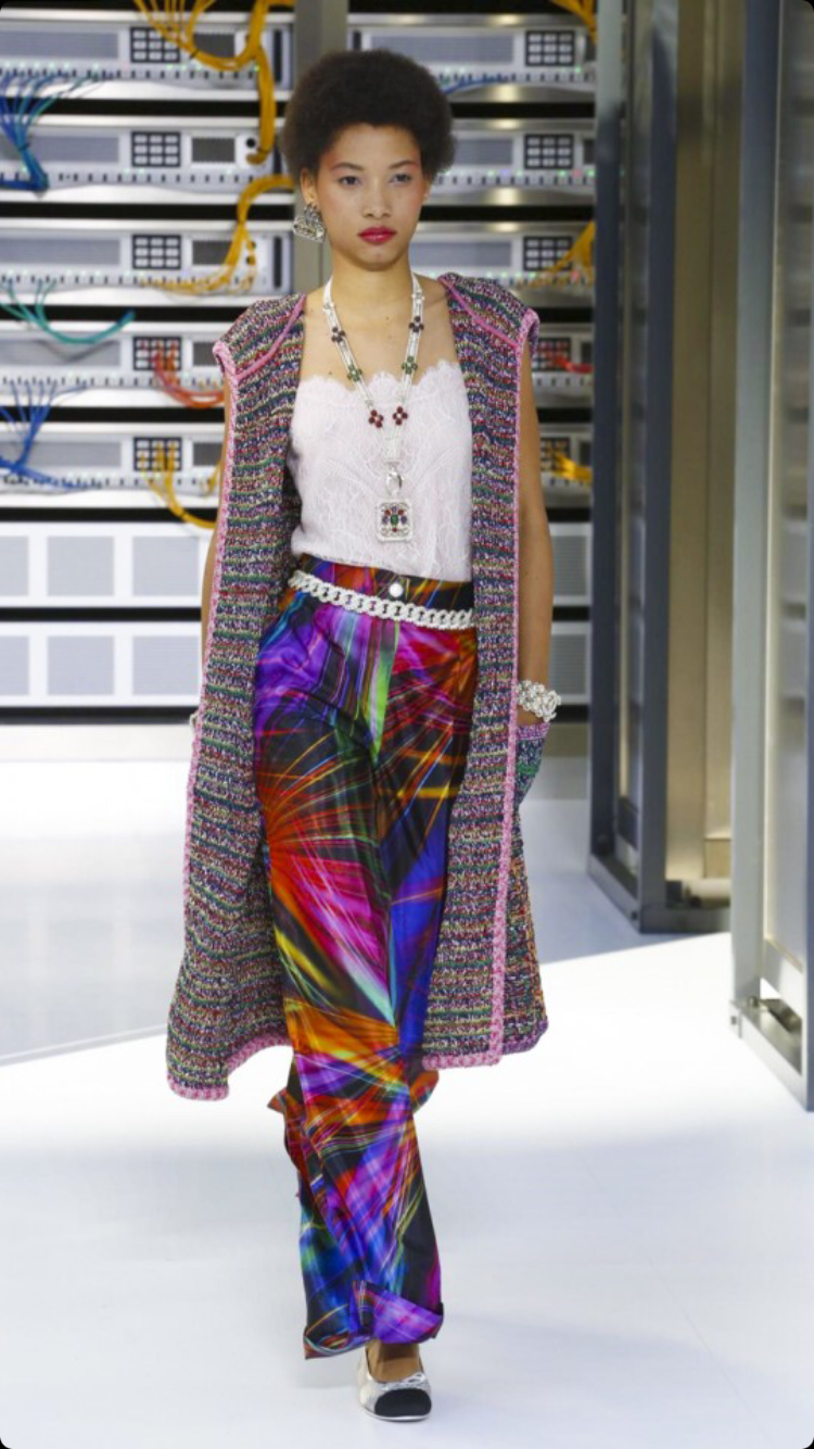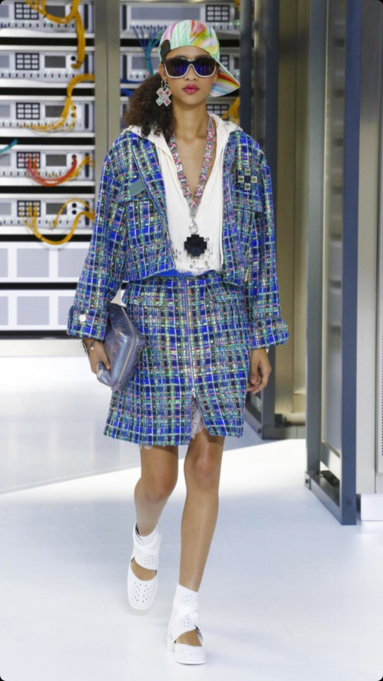 O tema do show esse ano foi computadores, cyber e o futuro. O desfile foi chamado de Data Center Chanel. O primeiro look que entrou na passarela foi usado por duas modelos com máscaras de robô, bem como sapato e luva. Parecia uma versão feminina do grupo eletrônico Daft Punk.