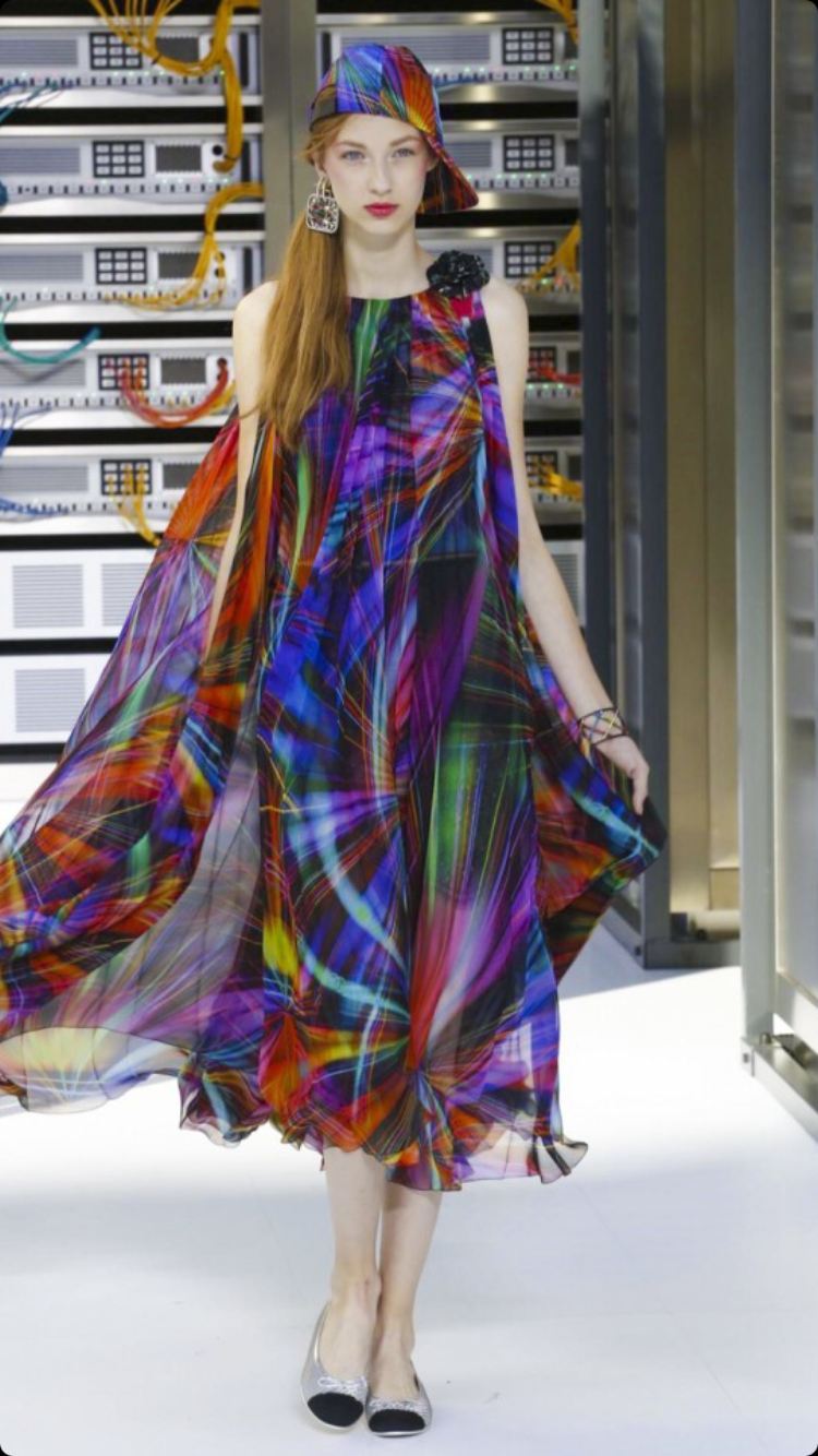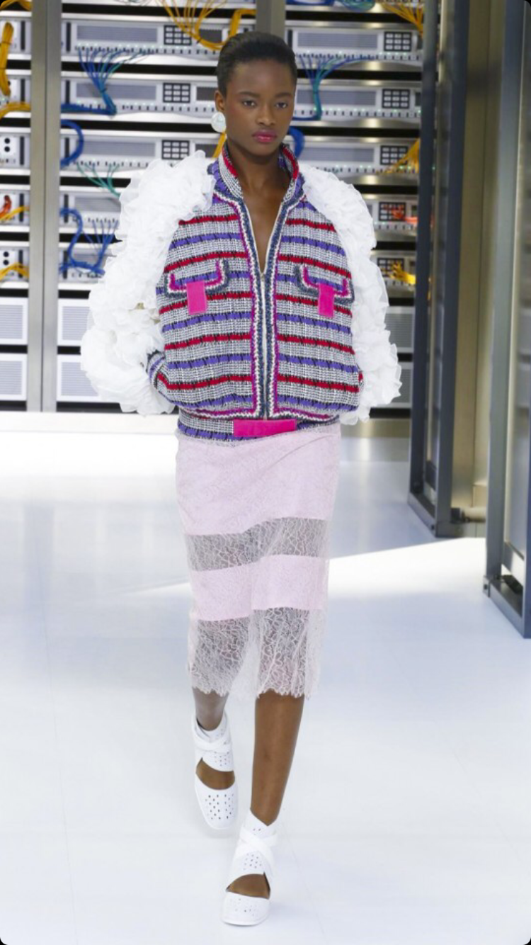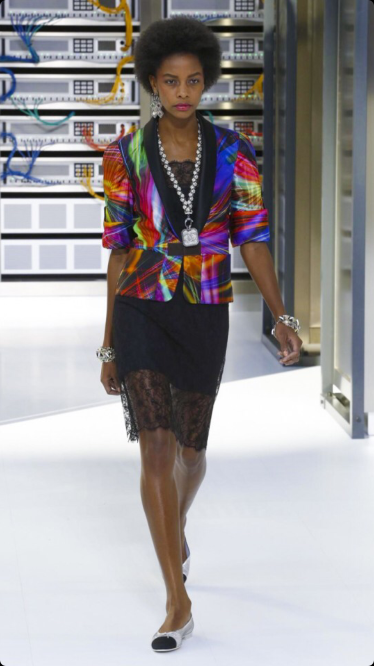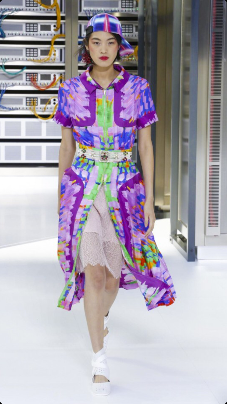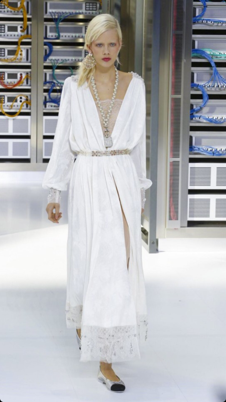 O tema do show esse ano foi computadores, cyber e o futuro. O desfile foi chamado de Data Center Chanel. O primeiro look que entrou na passarela foi usado por duas modelos com máscaras de robô, bem como sapato e luva. Parecia uma versão feminina do grupo eletrônico Daft Punk.