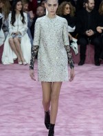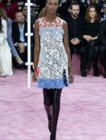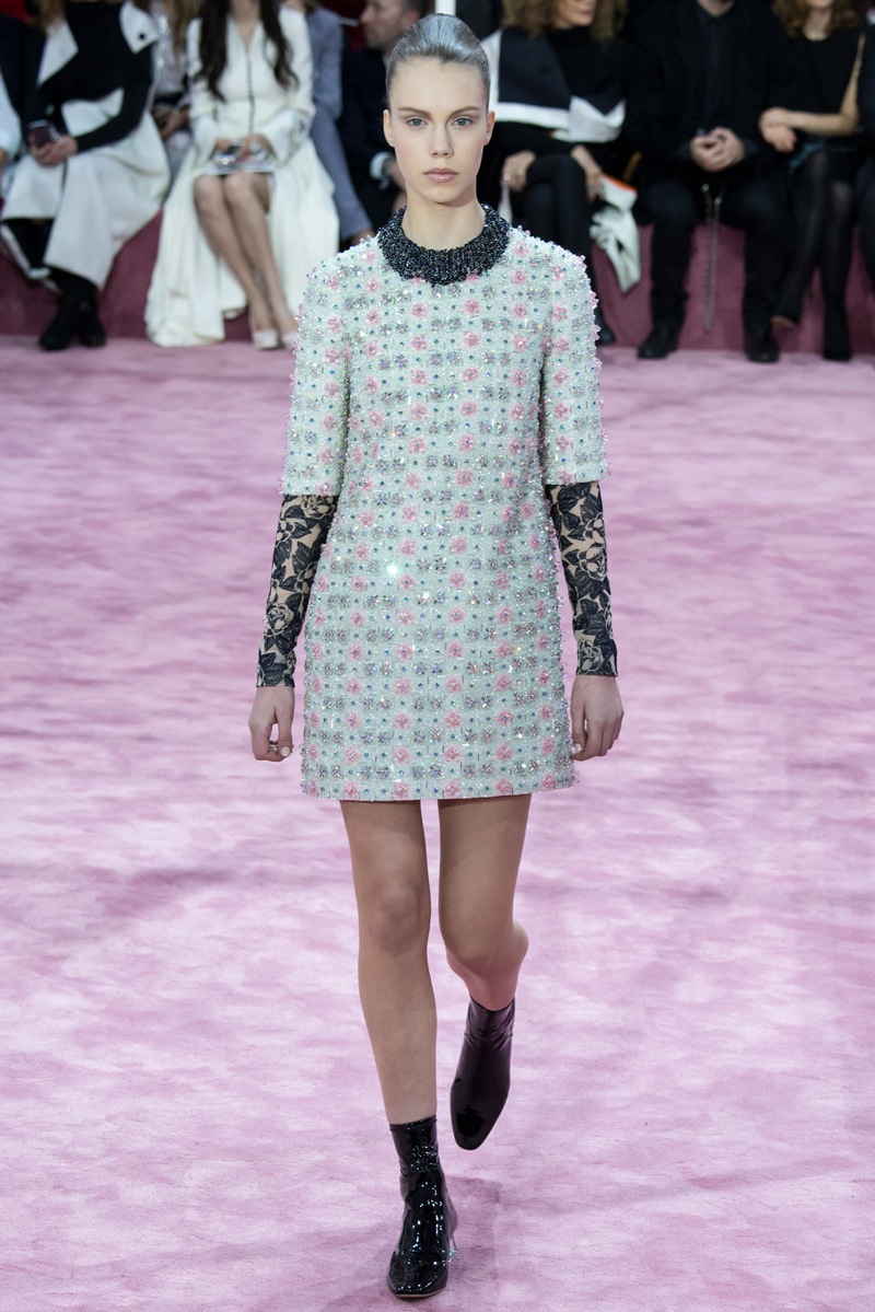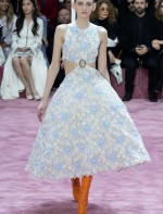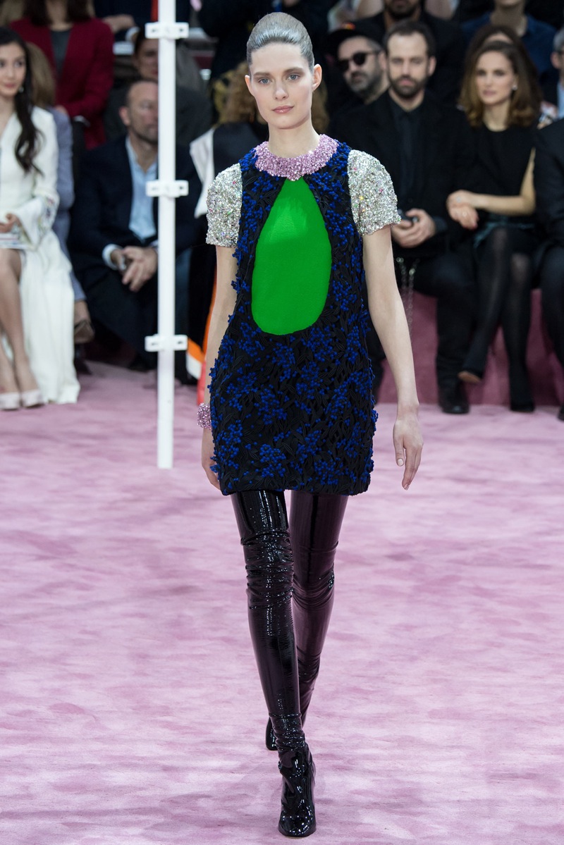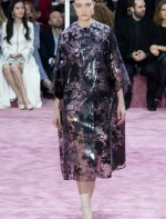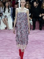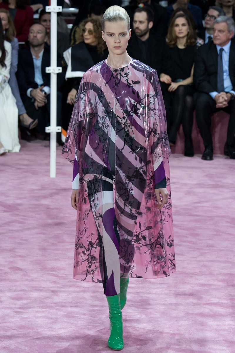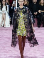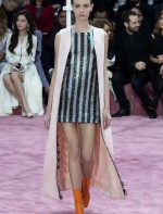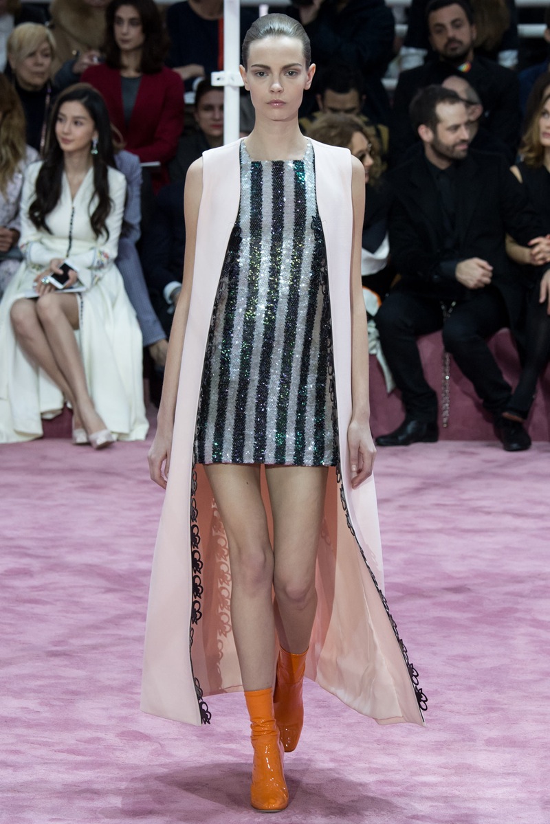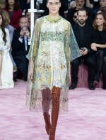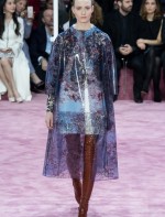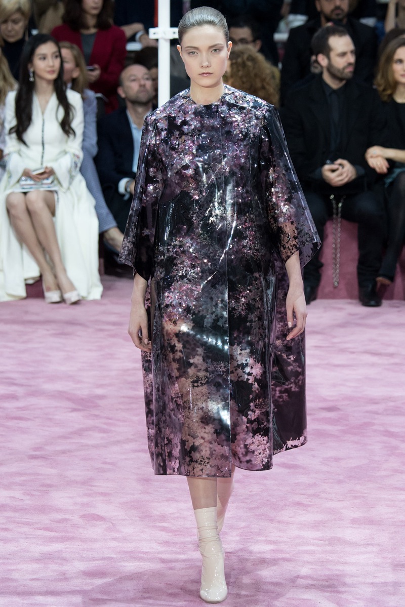 Alguém me explica o que são essas botas maravilhosas? Raf Simons só pode ser um gênio. Só ele mesmo para usar plástico na coleção Couture e fazer dar certo! Já no primeiro look do desfile Raf já nos deixa de boca aberta com seu casaco de vinil bordado ( não sei como também ) com uma pegada anos 50,60 e 70 ele mistura saias, vestidos e casacos compridos com listas, floral e muito brilho! Check it out: