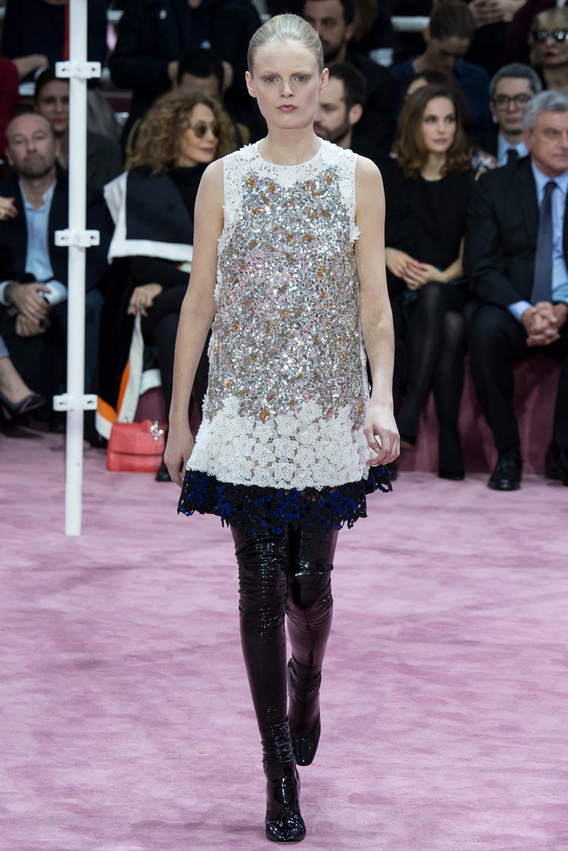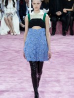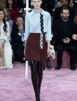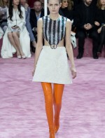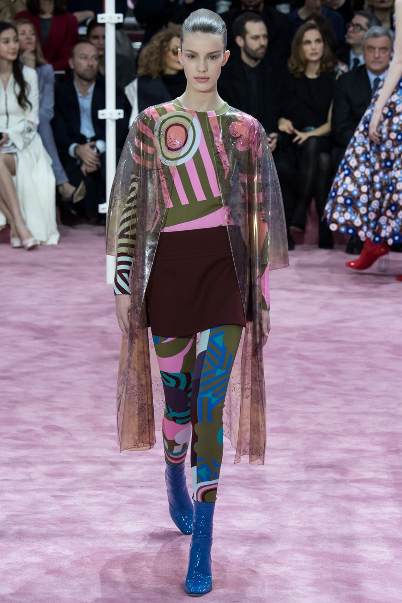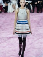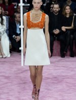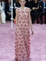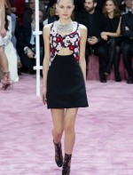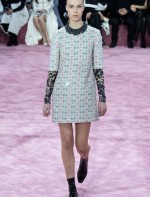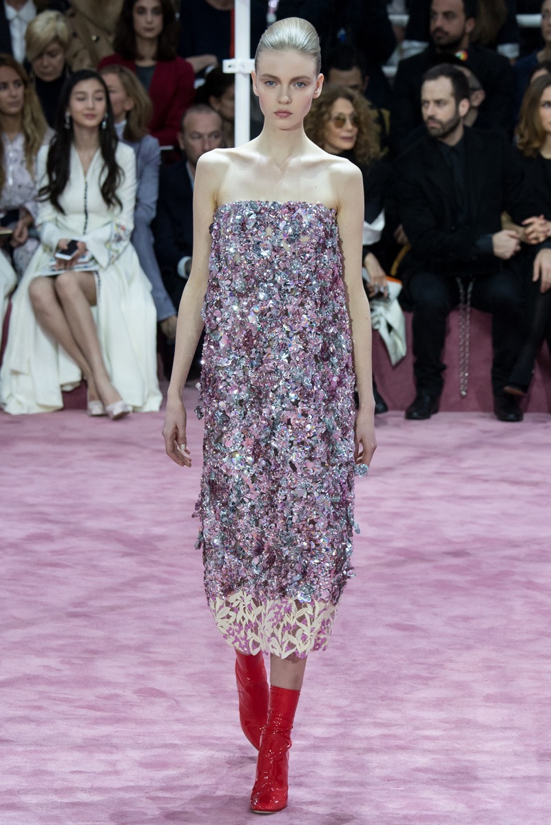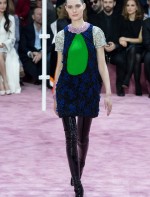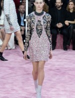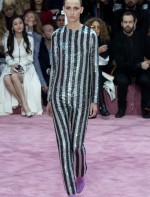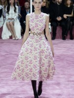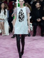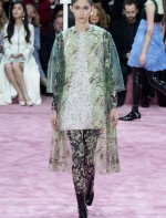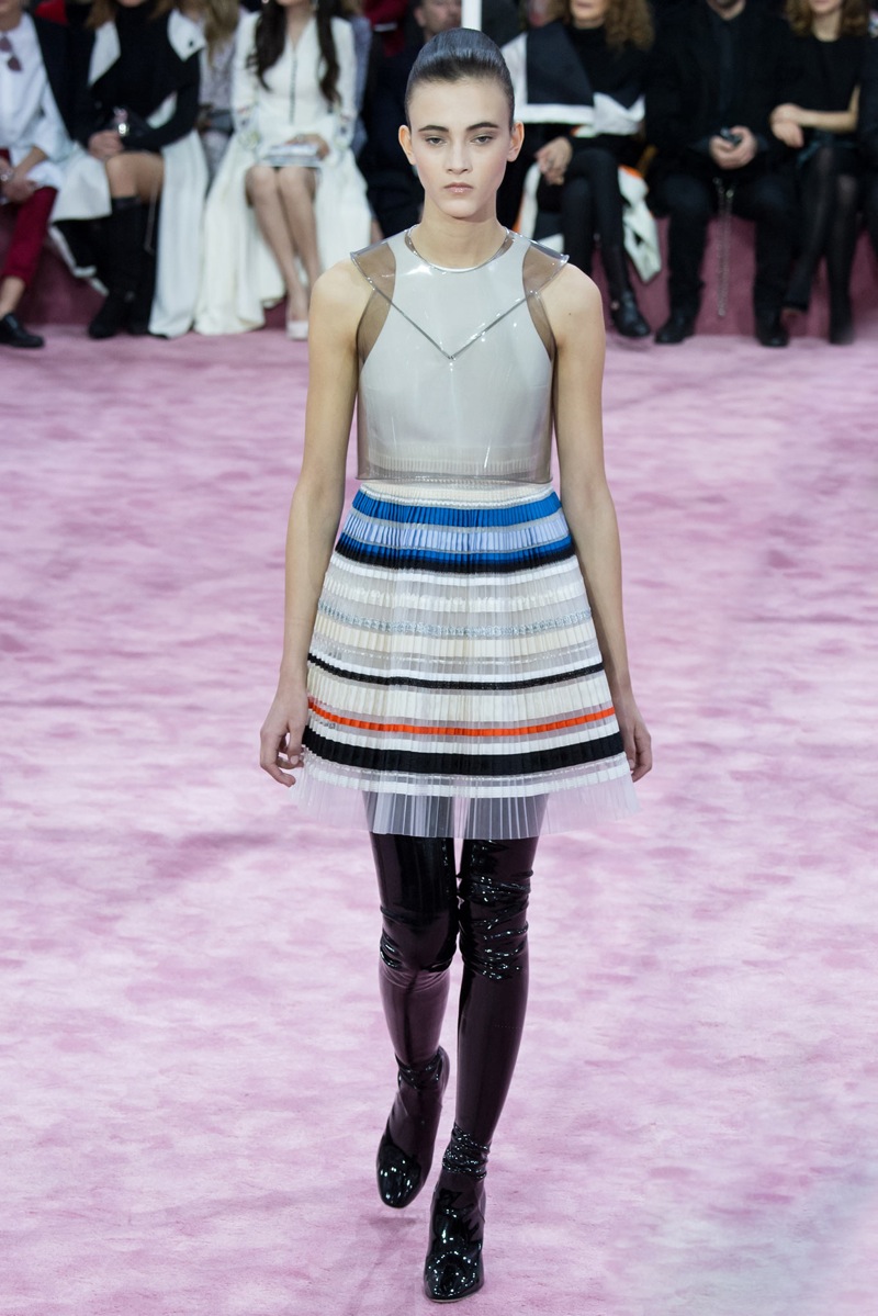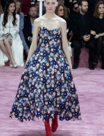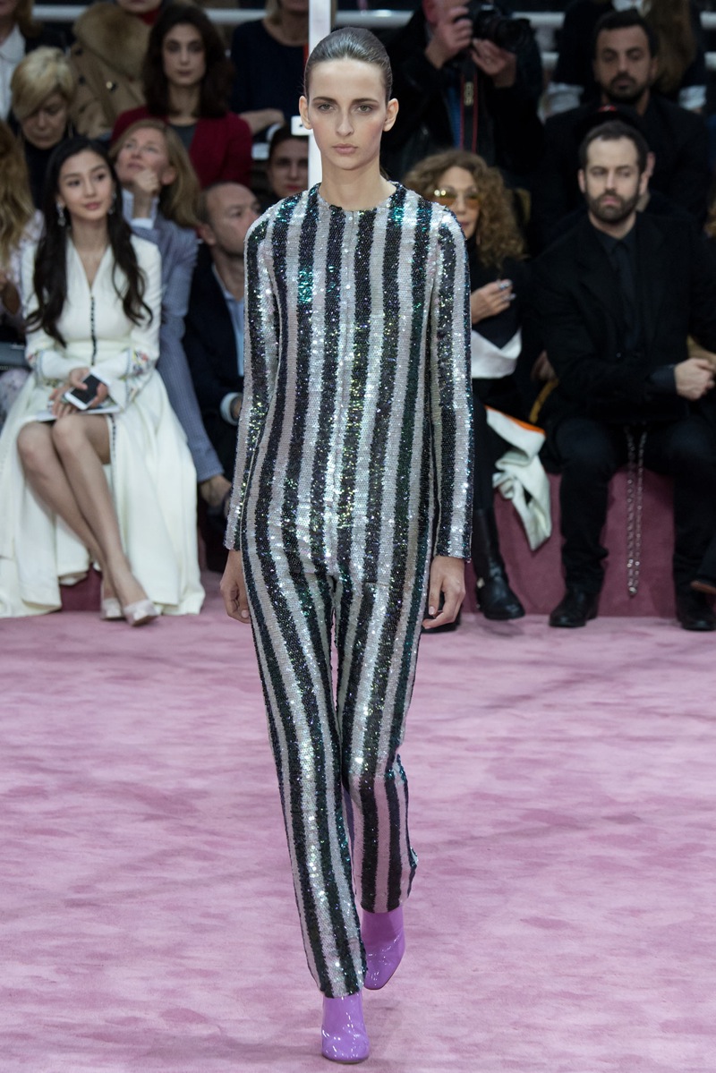 Alguém me explica o que são essas botas maravilhosas? Raf Simons só pode ser um gênio. Só ele mesmo para usar plástico na coleção Couture e fazer dar certo! Já no primeiro look do desfile Raf já nos deixa de boca aberta com seu casaco de vinil bordado ( não sei como também ) com uma pegada anos 50,60 e 70 ele mistura saias, vestidos e casacos compridos com listas, floral e muito brilho! Check it out:
