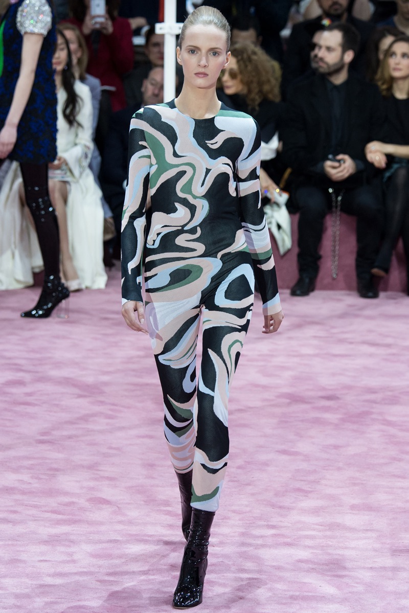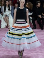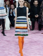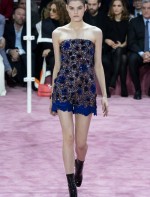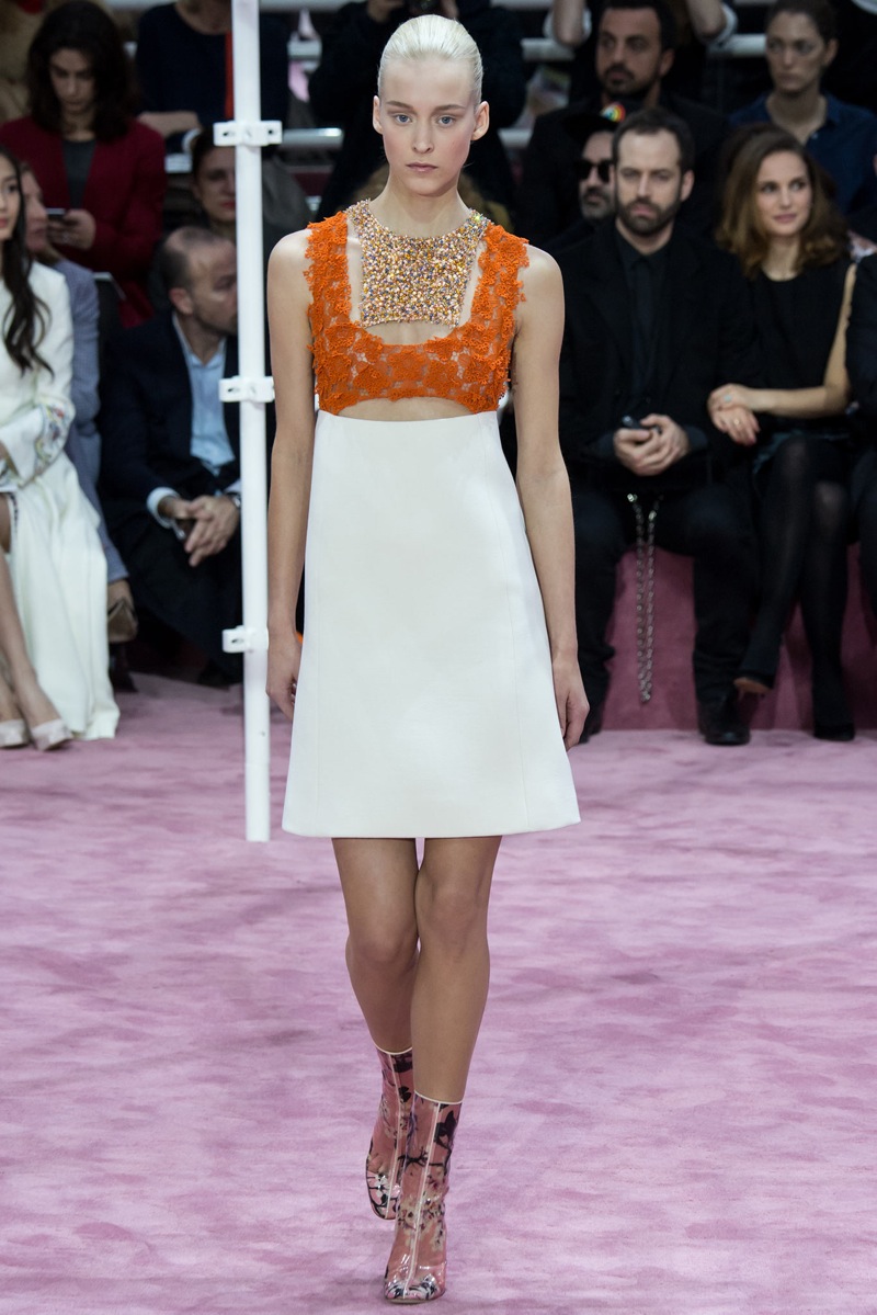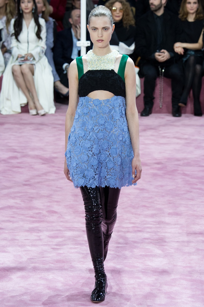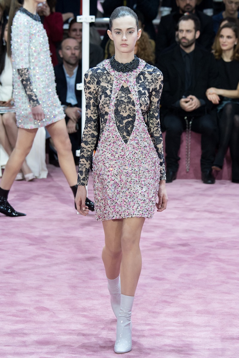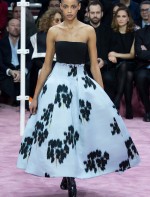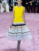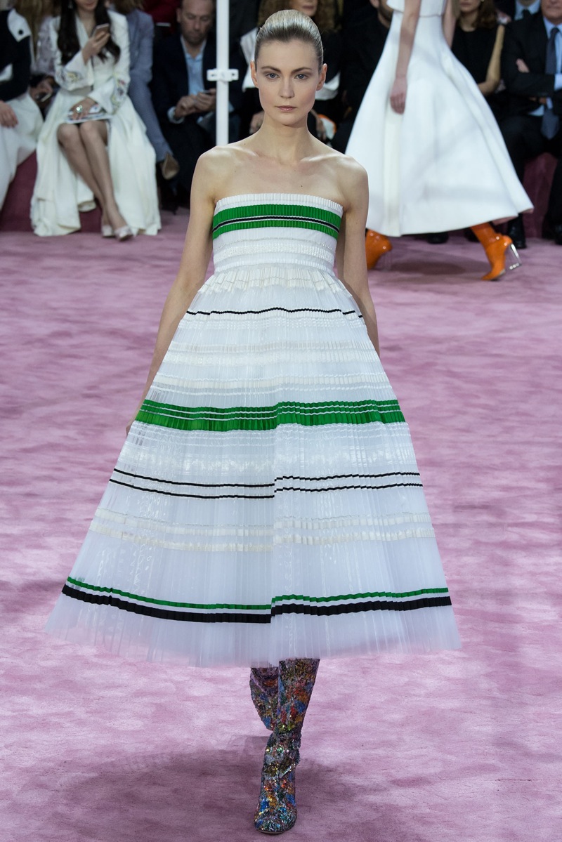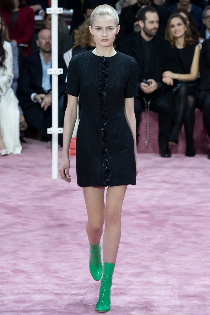 Alguém me explica o que são essas botas maravilhosas? Raf Simons só pode ser um gênio. Só ele mesmo para usar plástico na coleção Couture e fazer dar certo! Já no primeiro look do desfile Raf já nos deixa de boca aberta com seu casaco de vinil bordado ( não sei como também ) com uma pegada anos 50,60 e 70 ele mistura saias, vestidos e casacos compridos com listas, floral e muito brilho! Check it out: