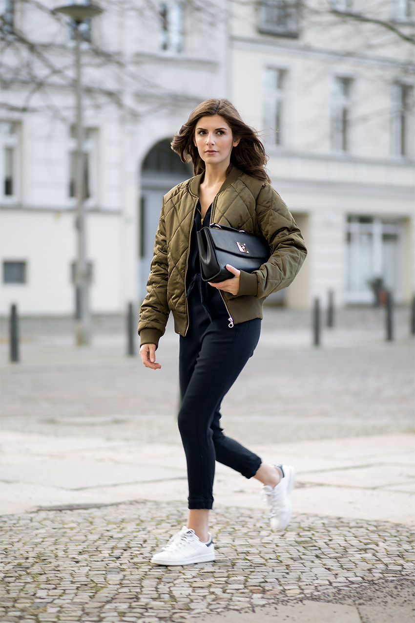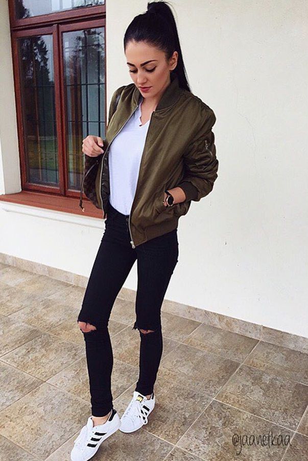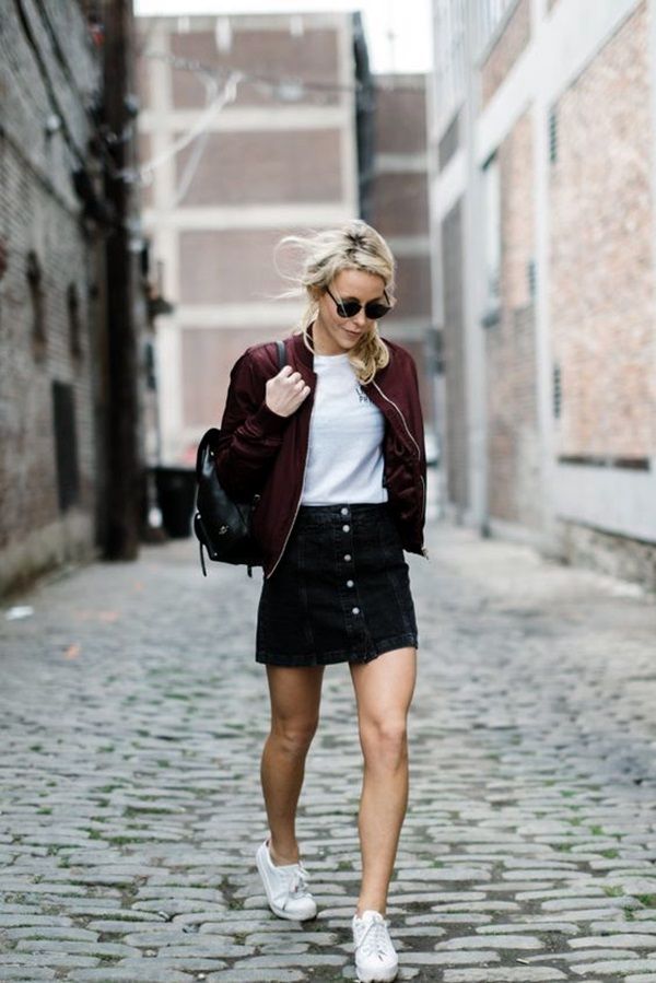 As jaquetas bomber também são ideais para composições mais despojadas. Aquelas com modelo mais oversized funcionam muito bem com comprimentos curtos – seja saia, short ou macaquinho. Nos pés, vale a pena investir em tênis, oxford, alpargatas e sandálias rasteirinhas.