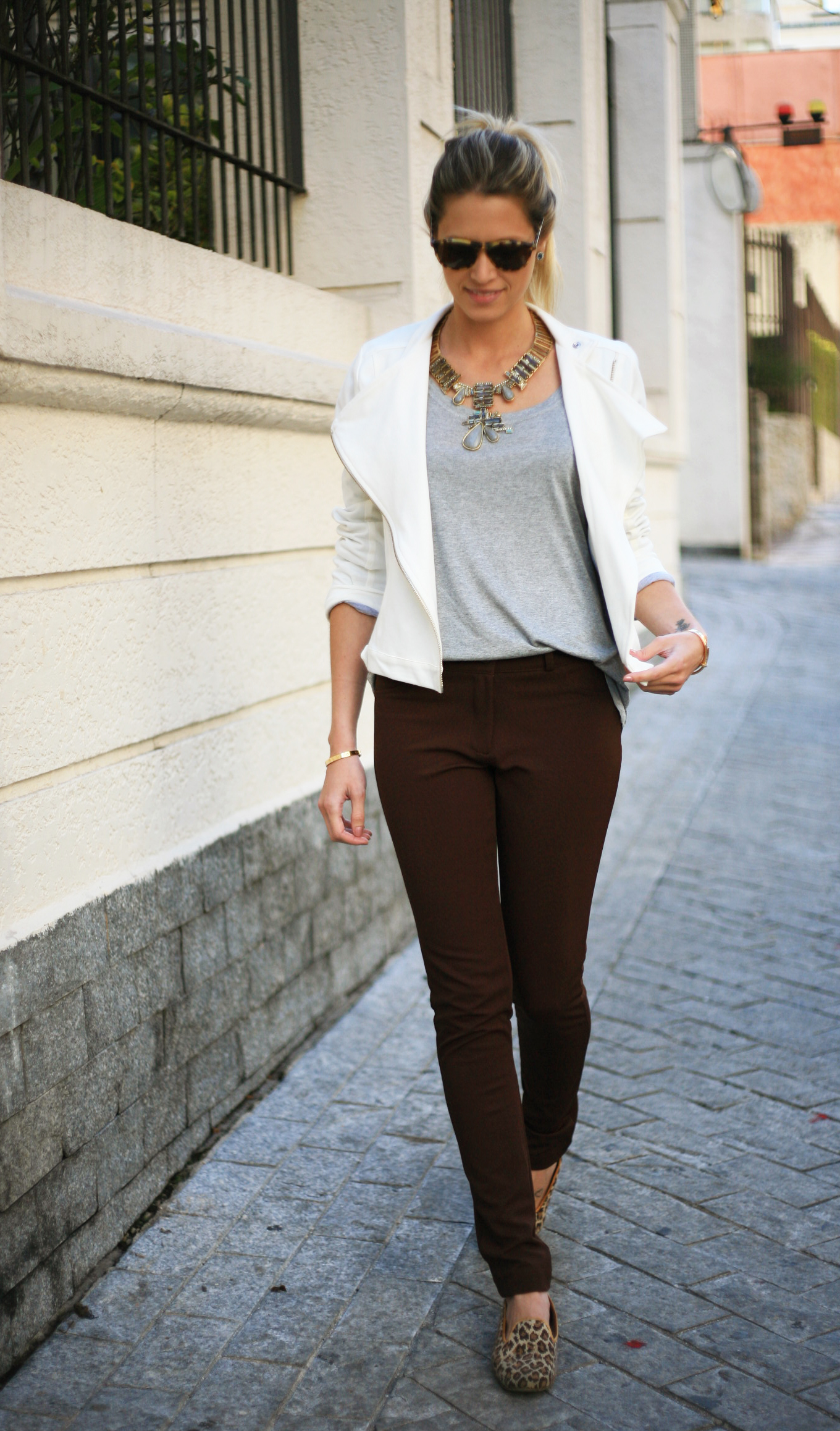 Estou usando Jaqueta biker off-white R$ 298,00, calça marrom R$189,00, t-shirt cinza R$69,00: