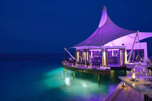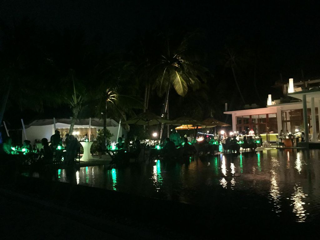 Lá nas Maldivas não se costuma sair do seu hotel para jantar ou fazer passeios..cada hotel fica quase 1h (de aviãozinho!) de distância do outro e não tem muita diferença de programas. Cada um tem seus próprios restaurantes com comidas variadas justamente pra você não precisar se locomover. Jantamos a maioria das noites no restaurante principal chamado Epicure, que fica perto da piscina. Cada noite eles faziam um jantar temático, como jantar japônes, comida típica italiana e etc.