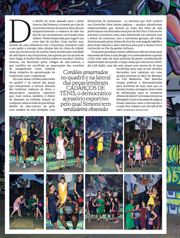 Oba! Finalmente posso contar aqui sobre um editorial incrível que fiz para a Vogue Brasil! Eu, Diana Krepinsky, Betina de Luca, Lelê Saddi, Giovanna Meneghel, Lala Rudge e Ana Piva de Albuquerque Palaia posamos ao lado dos jogadores Nenê Hilário e Leandrinho Barbosa vestindo peças do inverno da Dior combinadas a tênis da coleção de alta-costura e bolsas Lady Dior Mini!