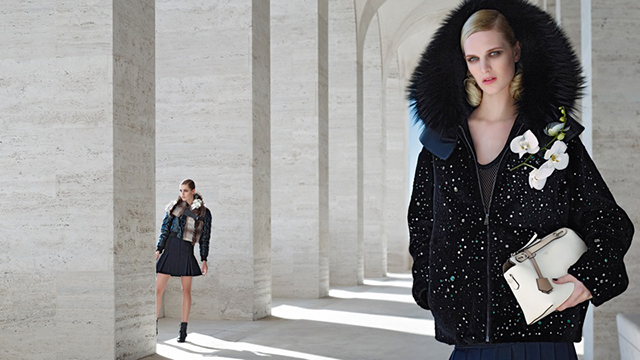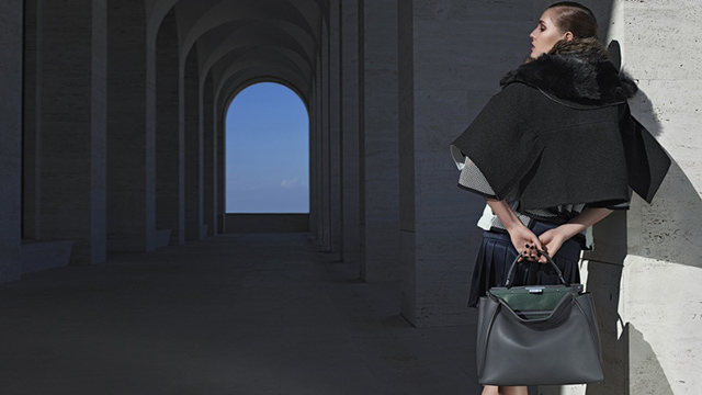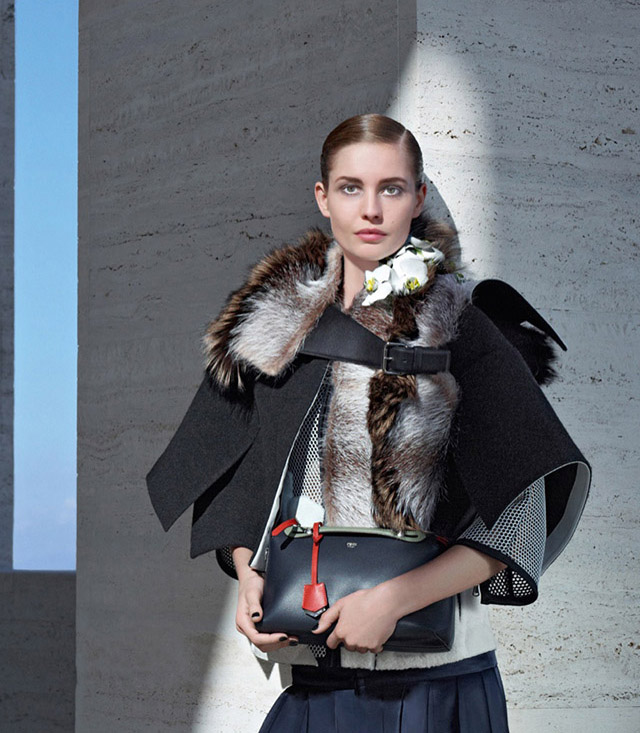 Fotografada no Palazzo della Civiltà Italiana, Roma, por Karl Lagerfeld, a nova campanha de Outono/Inverno da Fendi traz as modelos Nadja Bender e Ashleigh Good vestidas em muitos bordados, pele e couro.