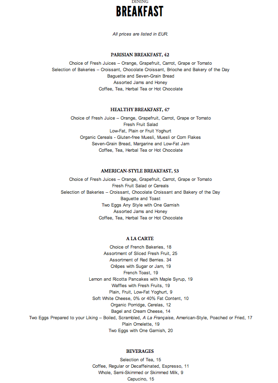 O La Gallerie é uma espécie de lounge chiquérrimo com pinturas e móveis antigos, sem contar com um piano maravilhoso que toca sem parar músicas lindas enquanto você aproveita um menu mais em conta e não menos delicioso do que os outros restaurantes do hotel. Além de ser uma delícia (fomos lá tomar um chá da tarde e comer o melhor club sandwich que existe!) lá é o melhor lugar para espiar as fashionistas. O café da manhã também é imperdível. Olha só o menu: