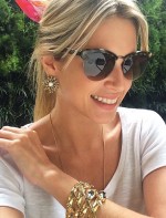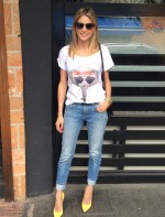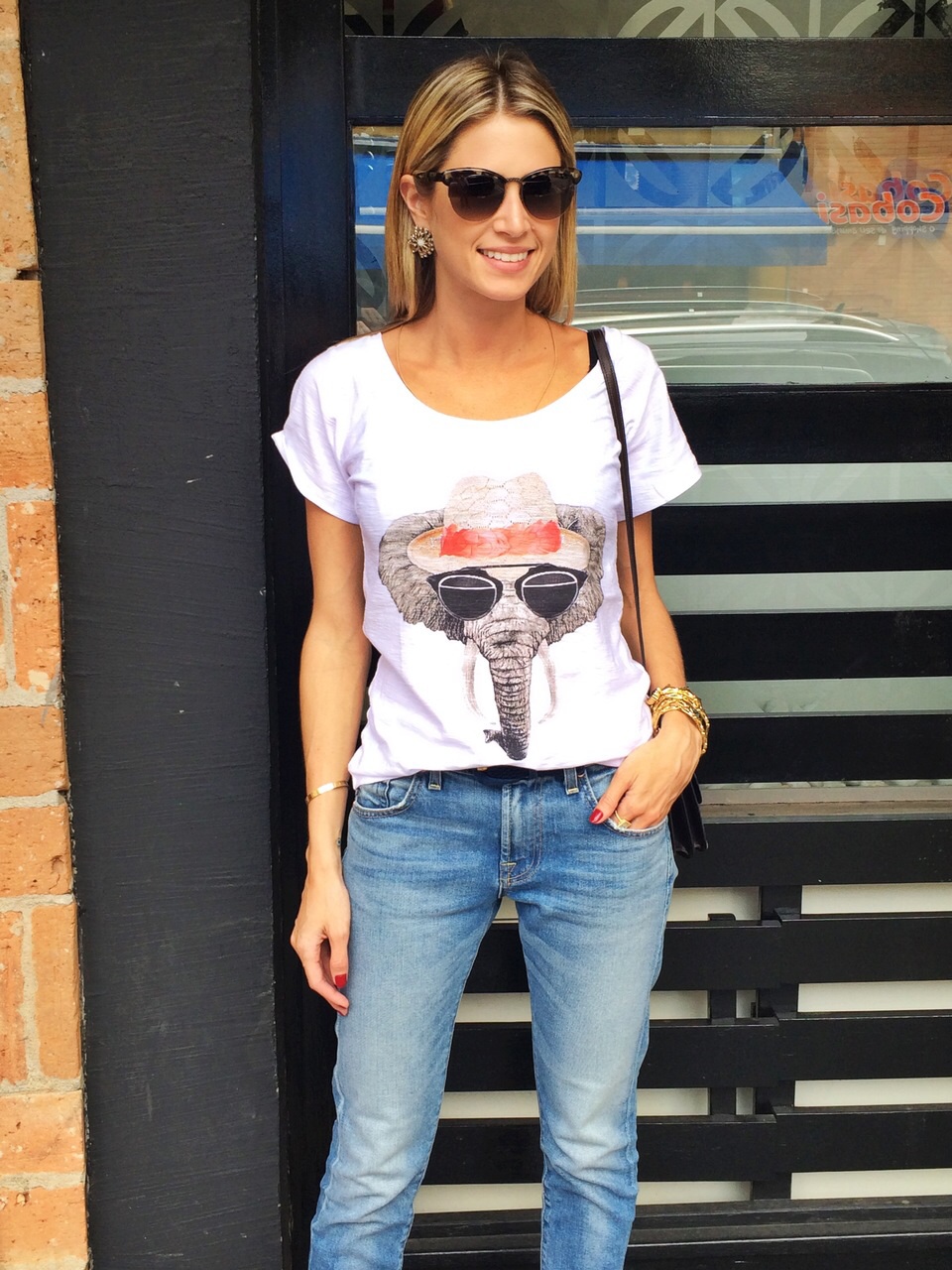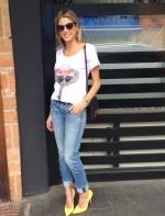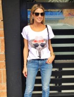 Look relax com camiseta So Lovely Shirt, calça 7 Jeans for All Mankind, scarpin Schutz, bolsa Hermés, pulseira e brinco Camila Klein e óculos Bottega Veneta.