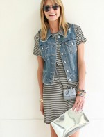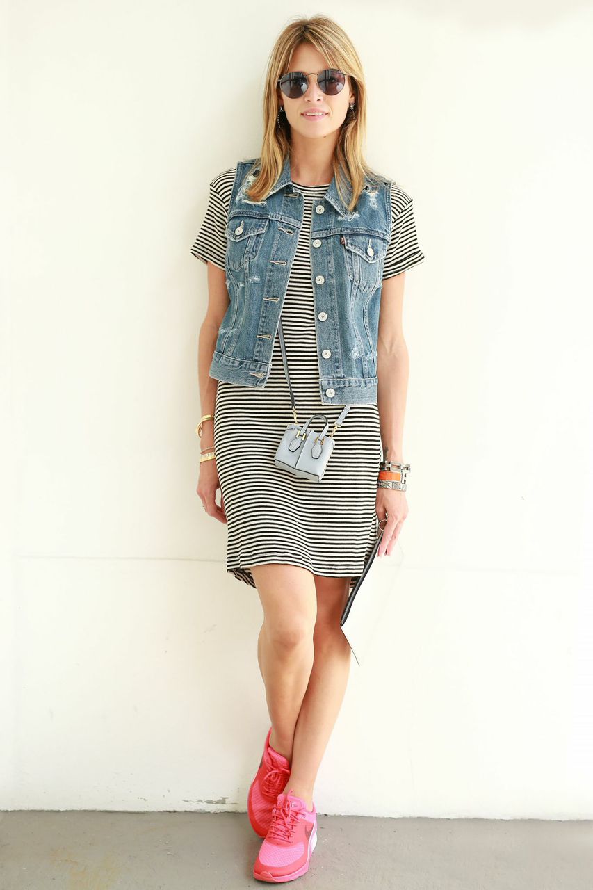 Look com vestido Brandy Melville, colete jeans Levis, tênis Nike, bolsas Tod’s e Celine.