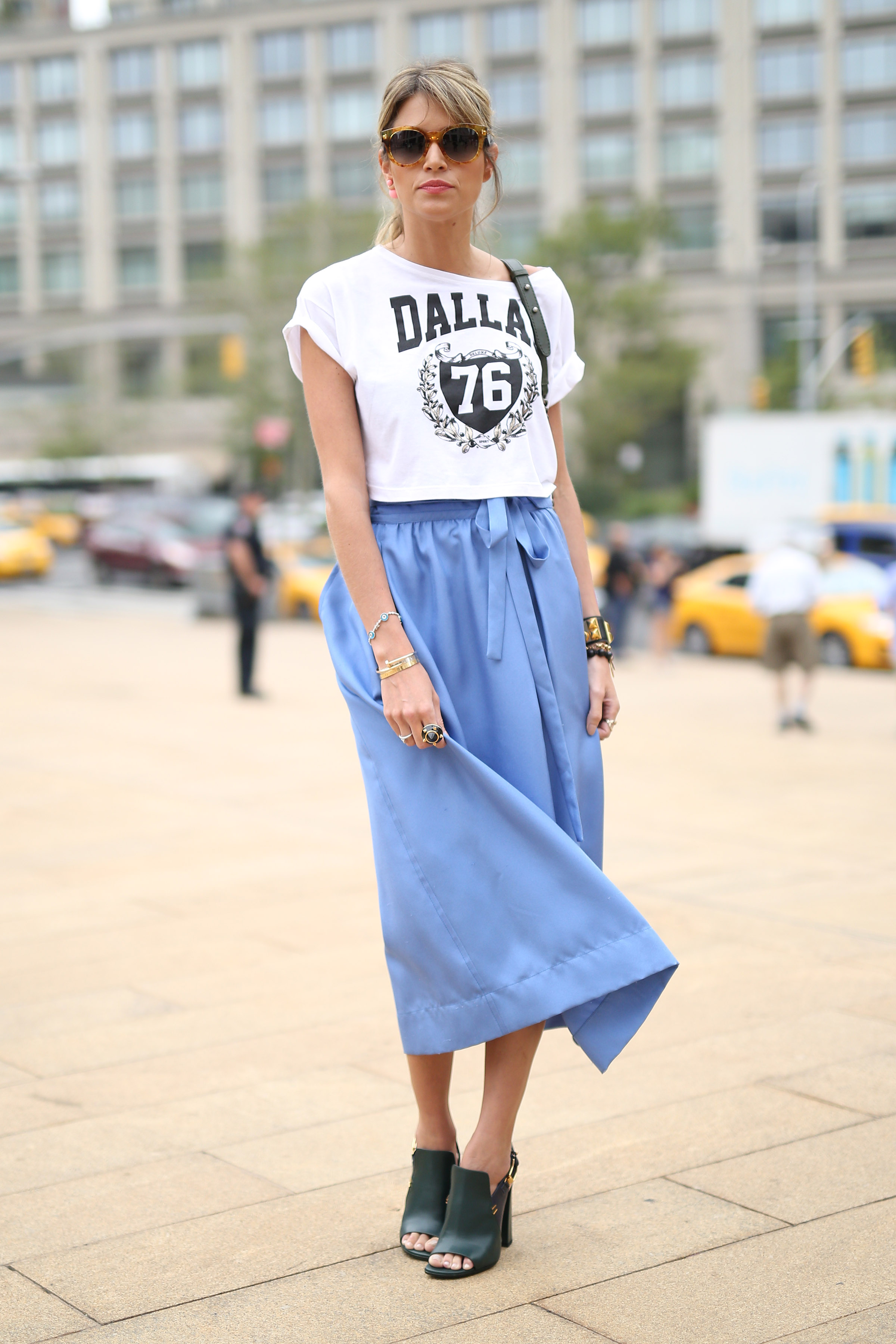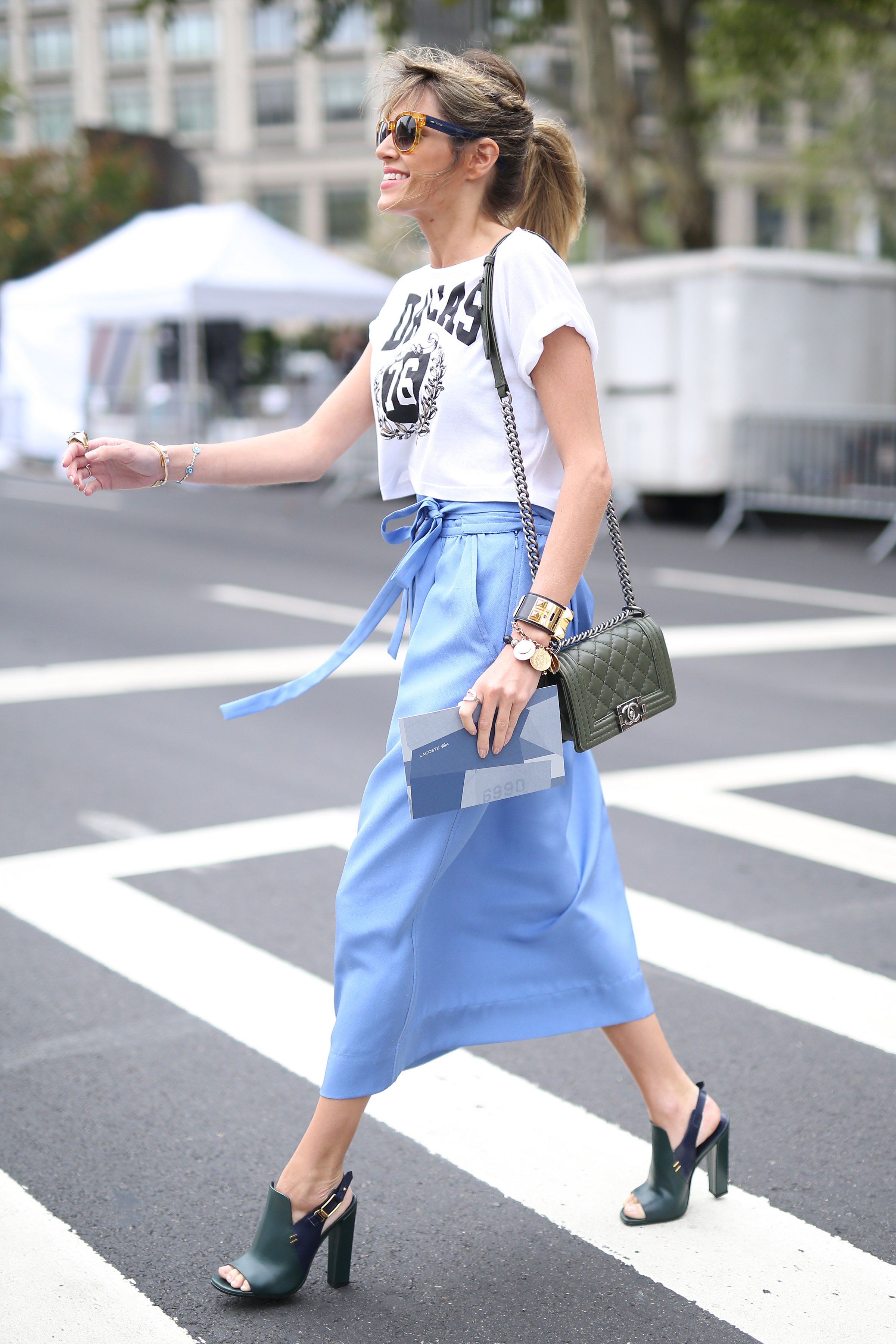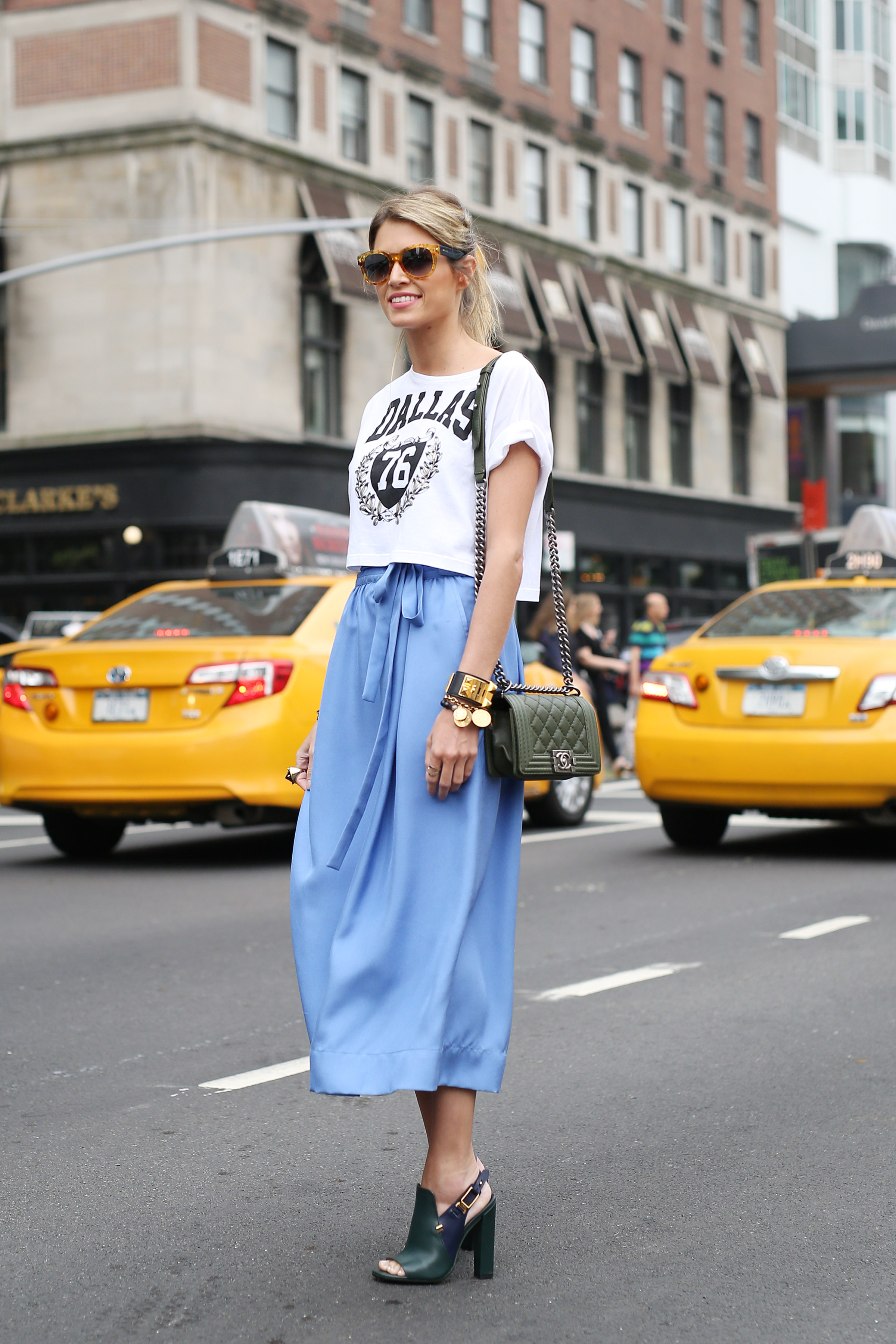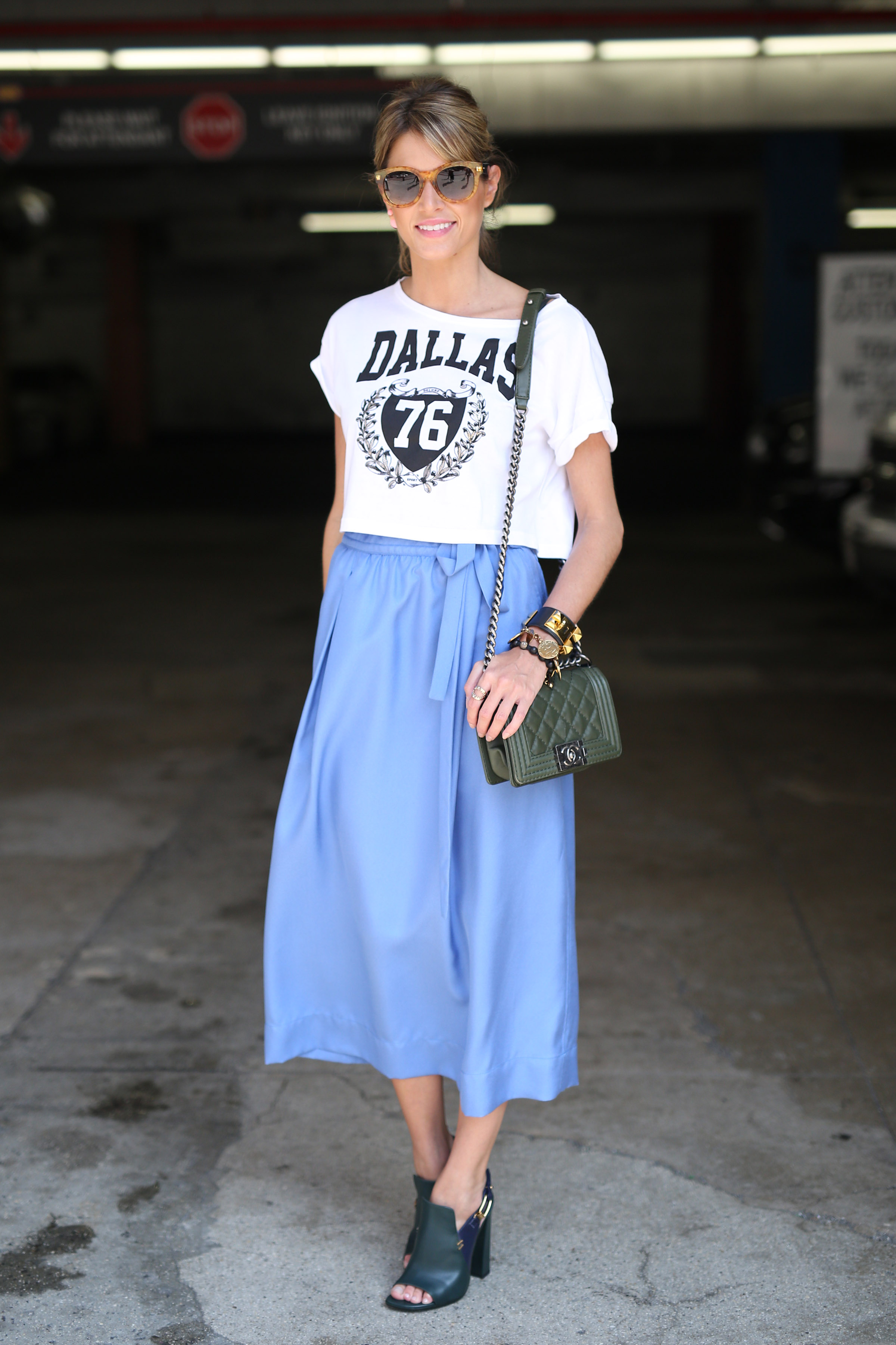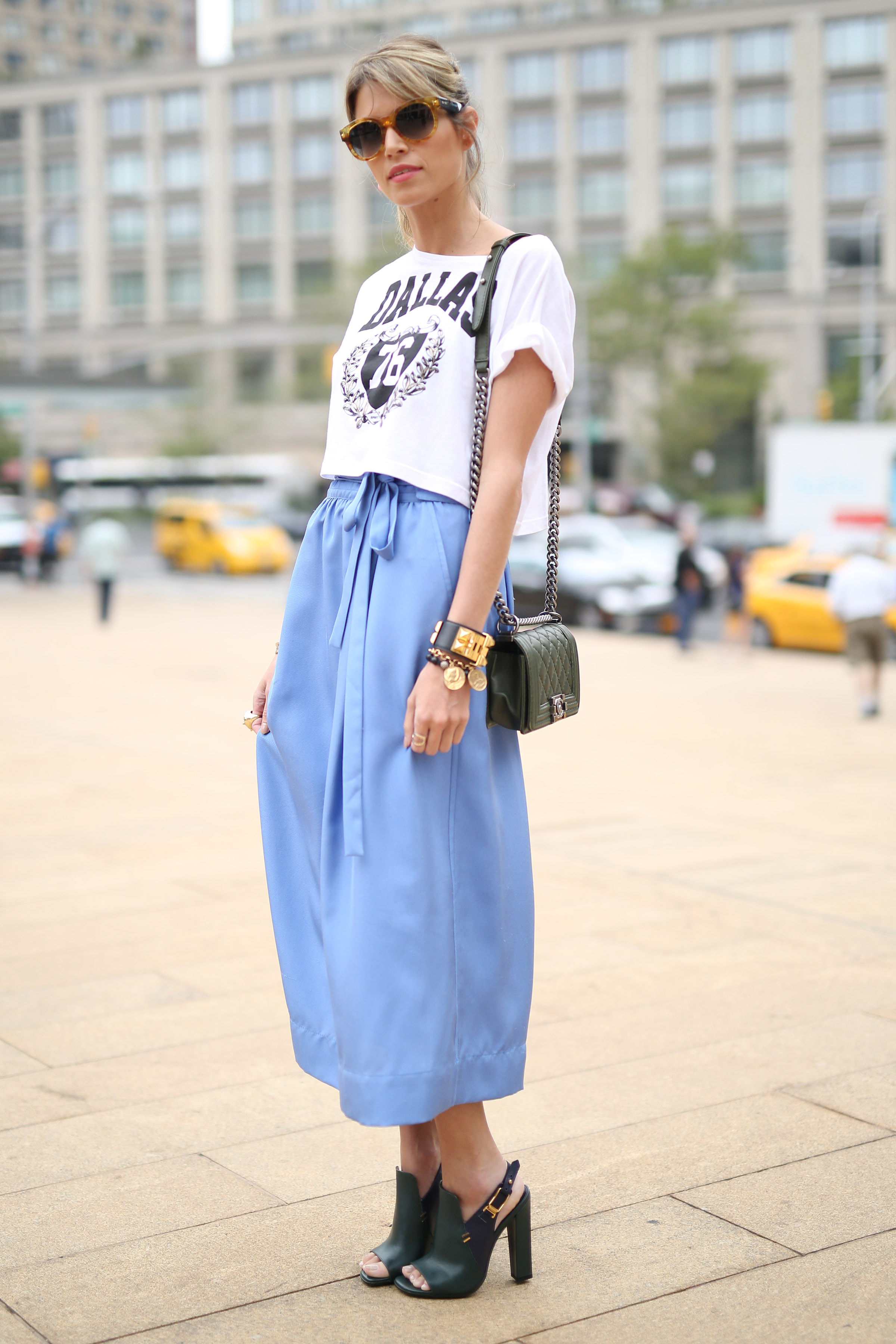 Look com saia Jill Stuart, top Riachuelo, sapato Tod’s, bolsa Chanel e óculos Fendi!
