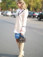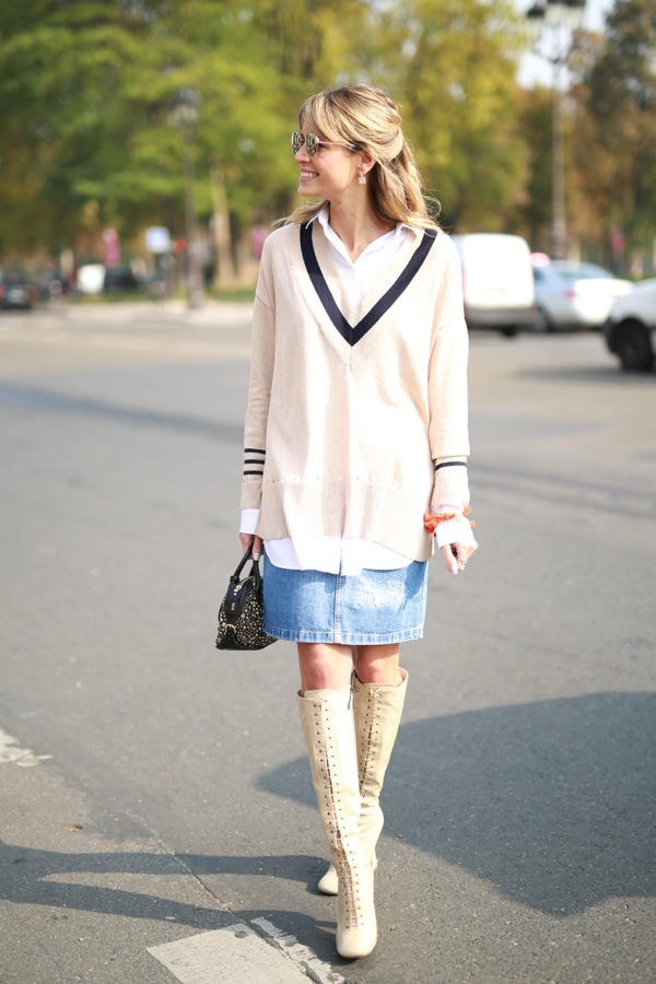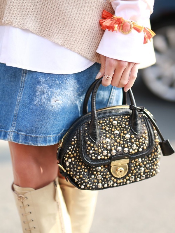Look com camisa T by Alexander Wang, malha Cris Barros, saia Maje, bota Miu Miu, bolsa Ferragamo.