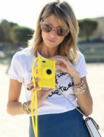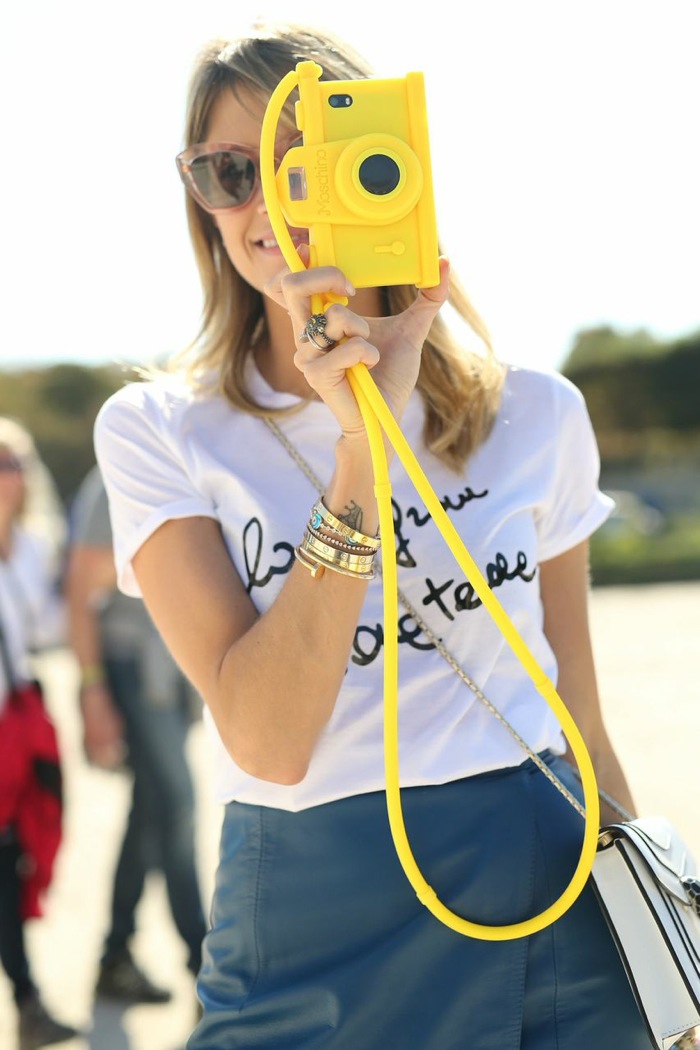 Look com camiseta Versace, saia Lilly Sarti, bolsa Bulgari, sapato Schutz, Iphone Case Moschino, óculos Miu Miu, Aneis Carla Amorim.