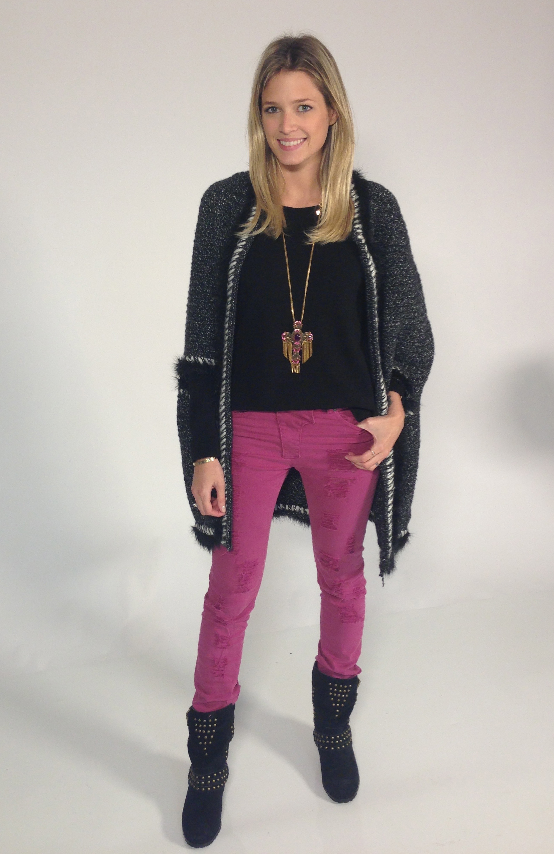 Ontem fiz uma sessão de fotos com o Shop2gether e tirei uma foto do meu look para vocês. Estou usando jeans pink e malha preta Lilly Sarti, colar T. Arrigoni (vício!), poncho Chanel e botinha My Shoes (vício 2!). Gostaram?