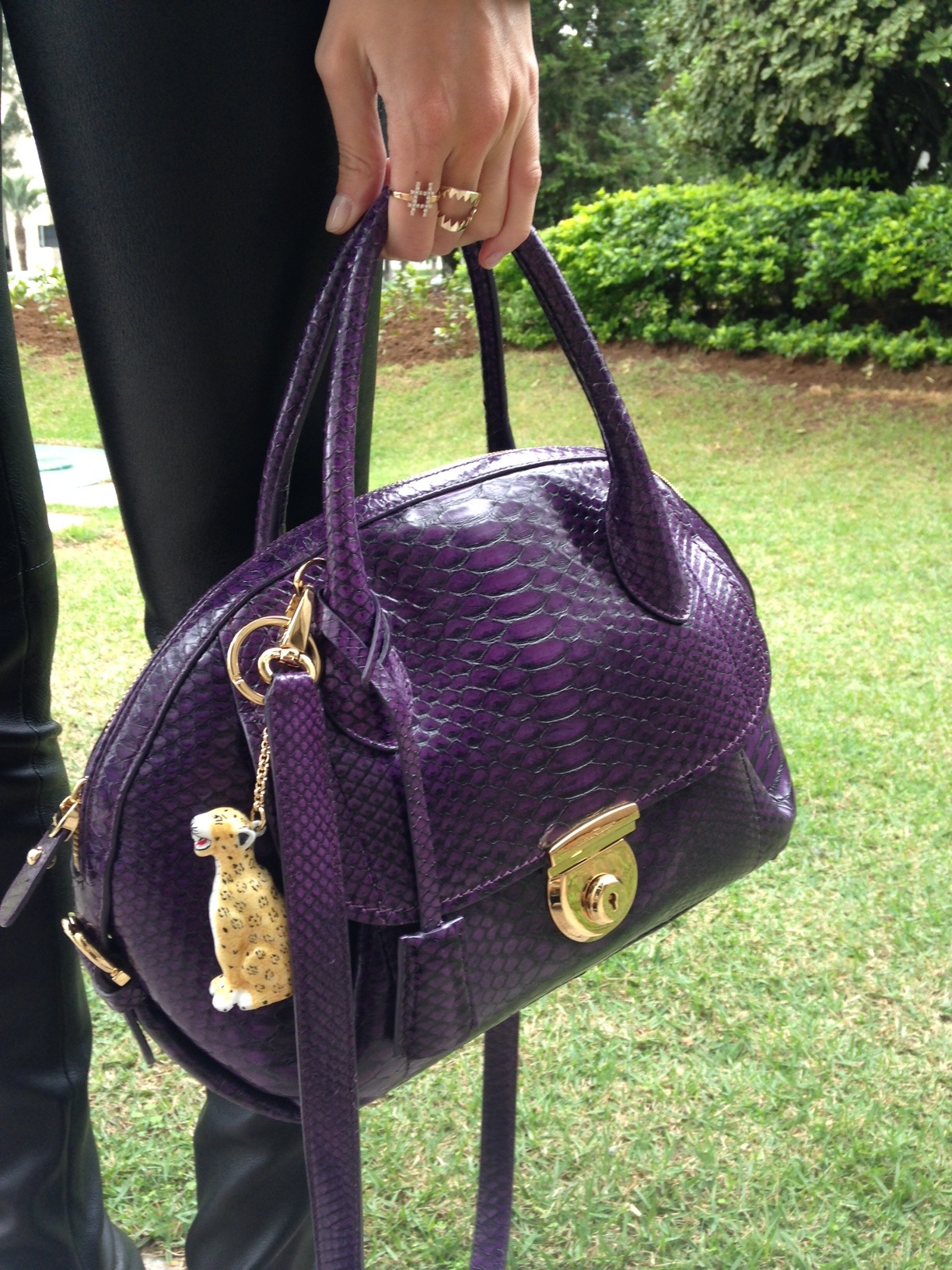 Detalhe da bolsa Ferragamo, com o charm fofo de leopardo da Charlotte Olympia