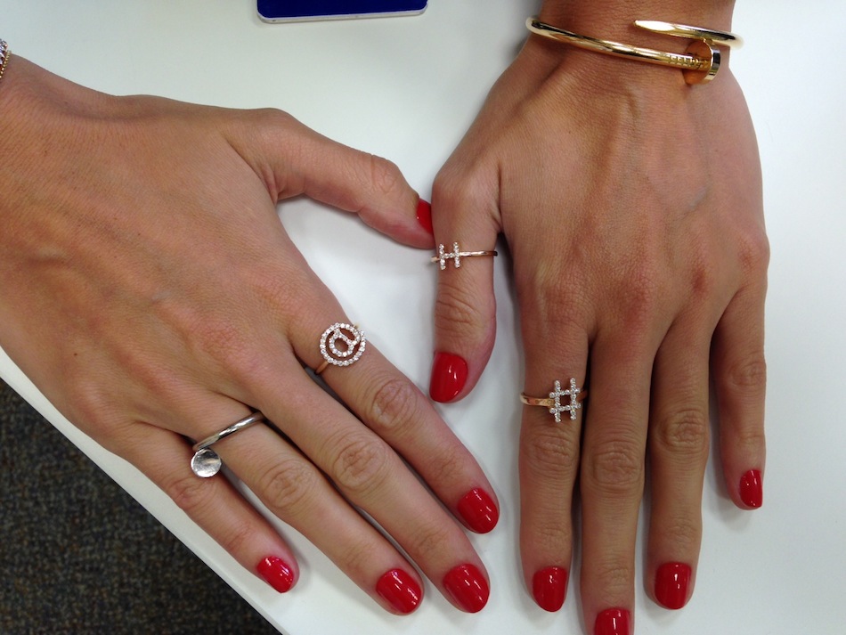 Get the Look: Rings! Um hashtag #, um arroba @ e um H em brilhantes! Muito fofos, não é mesmo? Agora não tiro mais! Publicado em 16/12/2013 Tags: aneis, bling, brilhante, jewelry, rings 1 comentário
