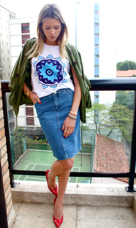T shirt Mandala, com saia jeans e jaqueta militar.