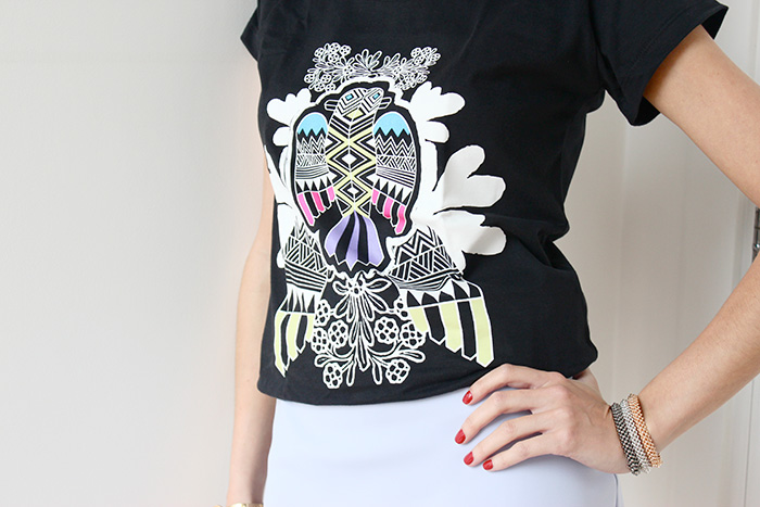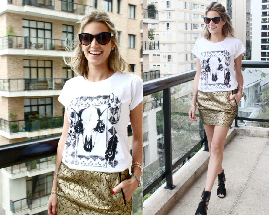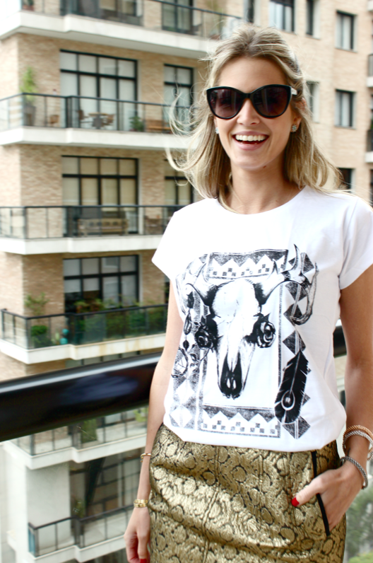 T- shirt Tribal, com saia arrumada e detalhe do sapato My Shoes e das pulseiras Carla Amorim.