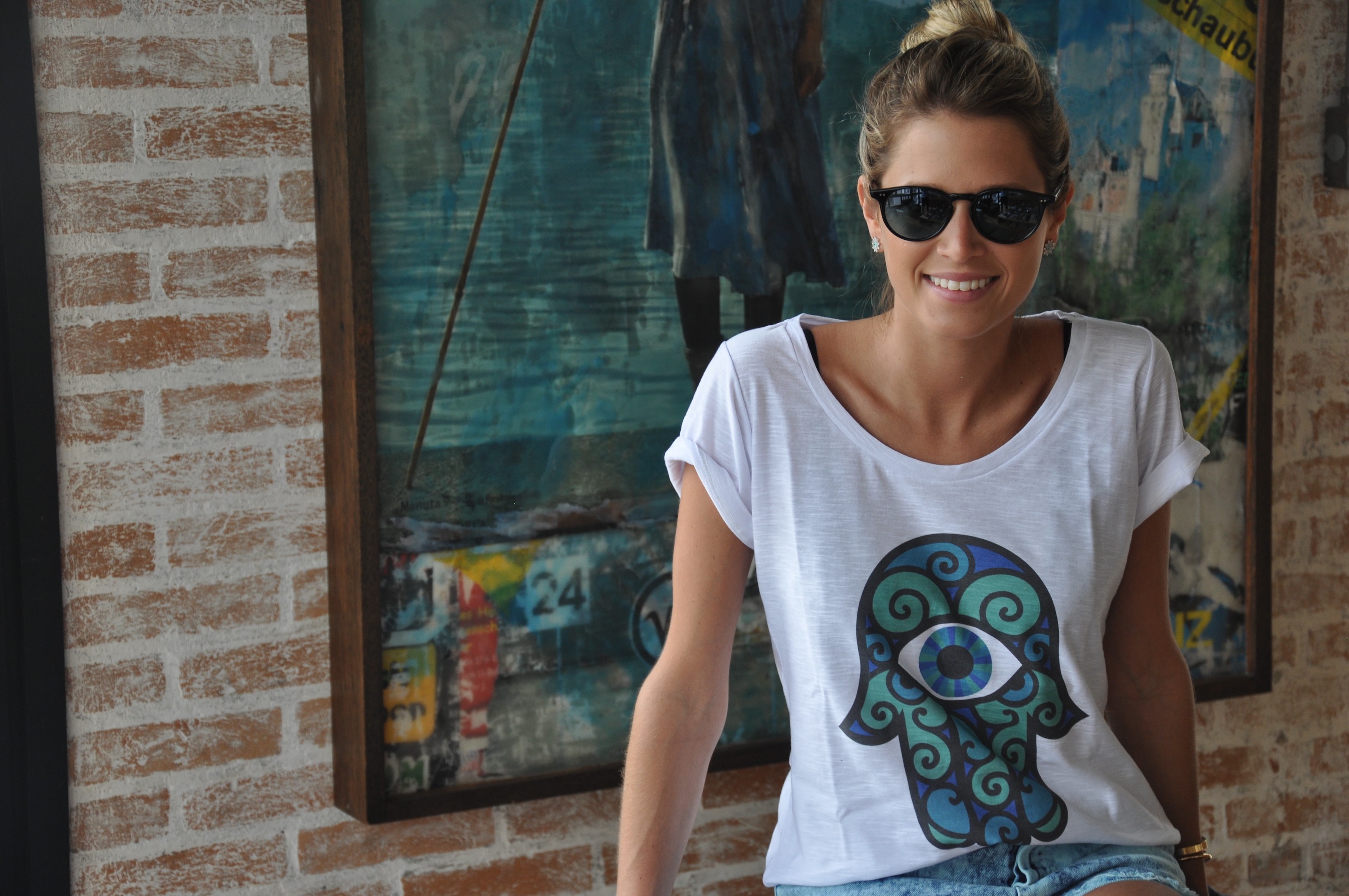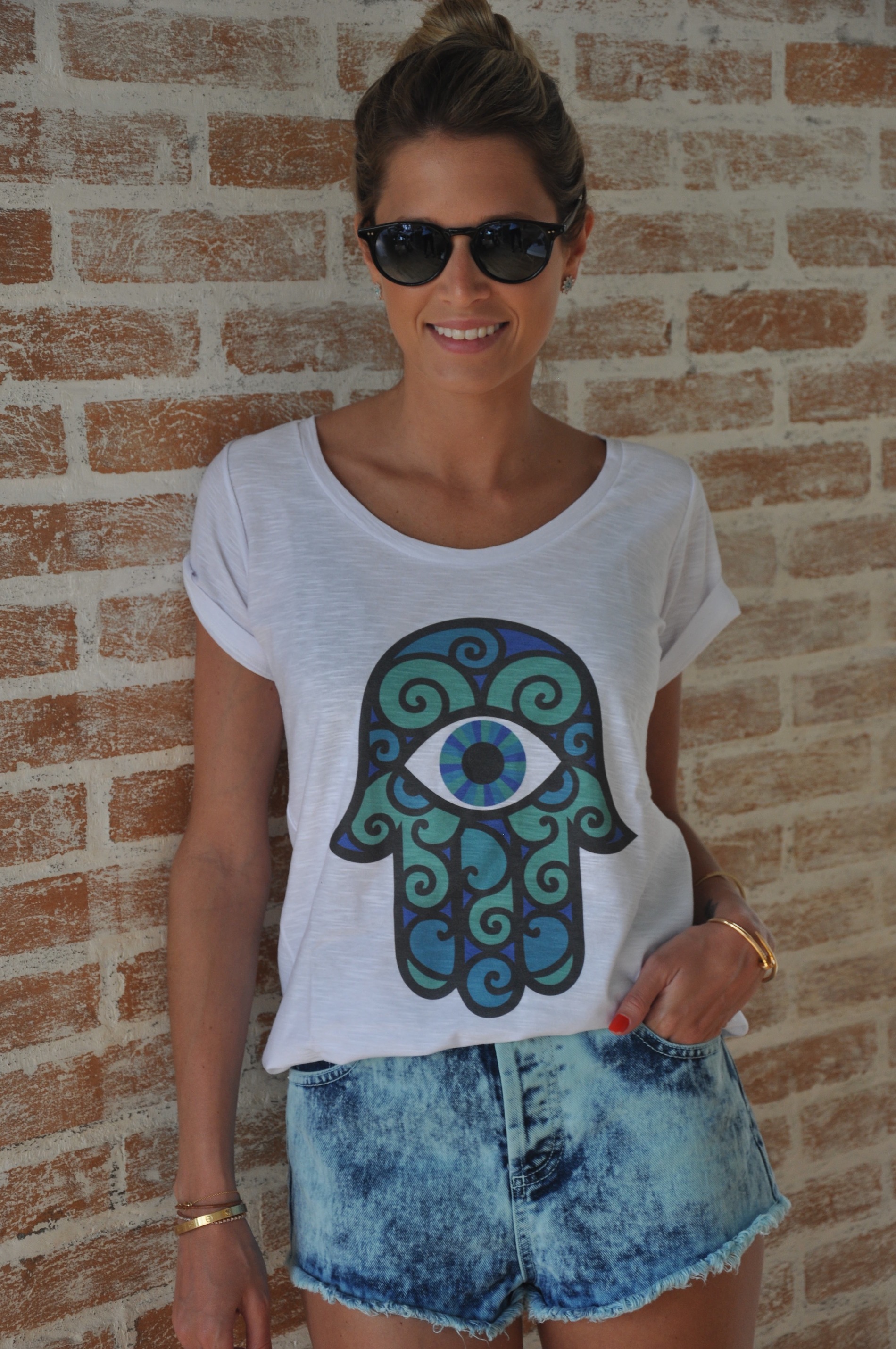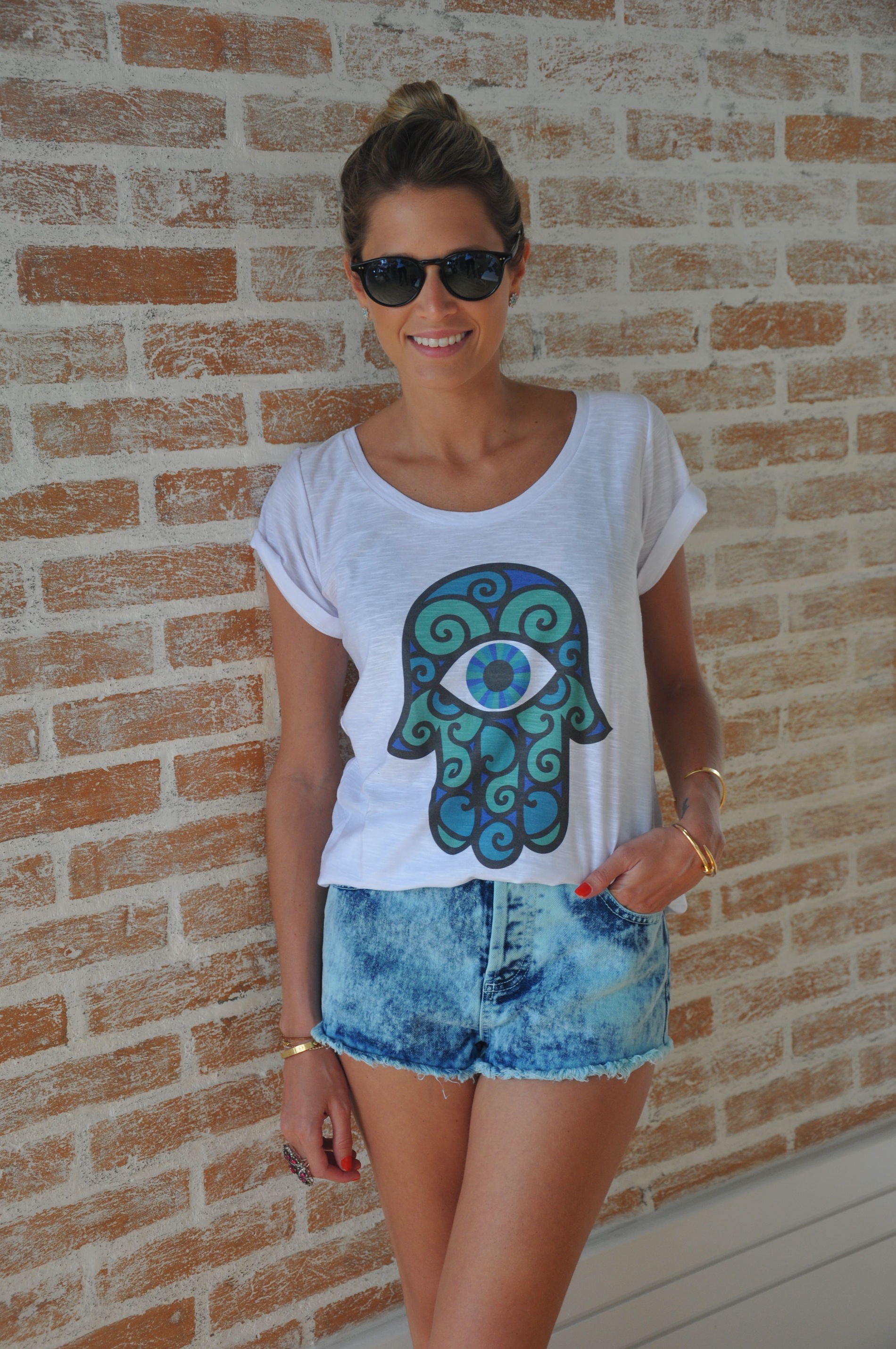 Camiseta So Lovely Shirt de hamsa ou mão de fátima (amei muito!) com shorts jeans da Topshop, loafers Charles Philip e brincos Carla Amorim. Gostaram?