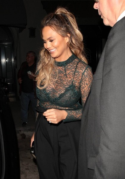 Chrissy Teigen aparece com look um dos seus looks mais lindos após anunciar a gravidez, com um top super transparente e chique, ao sair para jantar com seu marido John Legend no Craig’s Restaurant em West Hollywood.