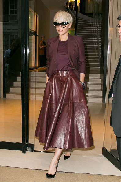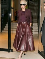 Direto de Paris, ela exibiu saia de couro longa + camiseta + blazer em tons de roxo (puxando para o Marsala – a cor de 2015 eleita pela Pantone) e óculos escuros.