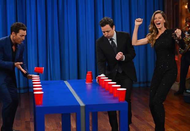 Mas o programa não para por aí! Gisele e Matthew se juntam com Jimmy e o comediante Steve Higgins para uma disputa de?”flip cup”! Uma brincadeira super comum nos EUA aonde um toma a cerveja do copo e o outro tem que virar! Só vendo o programa para entender. PLAY!