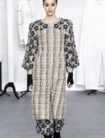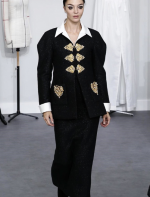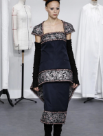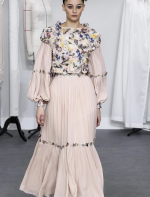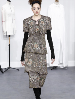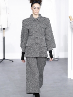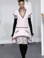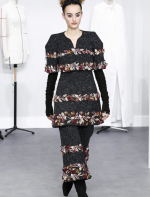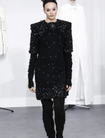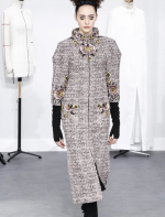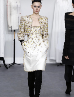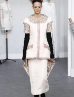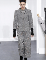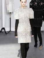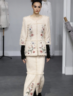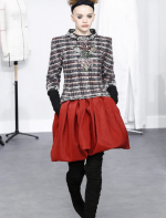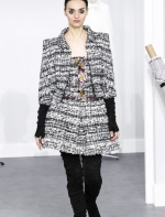 A coleção contou com muito tweed bordado, saias, blazers e vestidos maravilhosos! Para dar o ar invernal na coleção, usou botas acima do joelho pretas de camurça e luvas.
