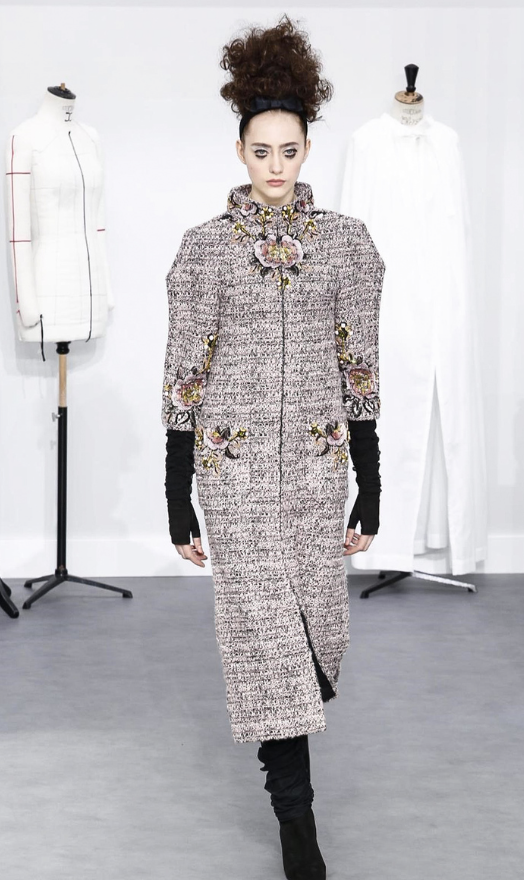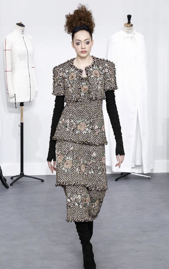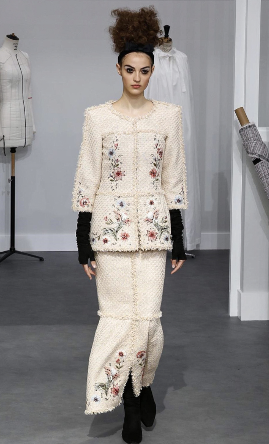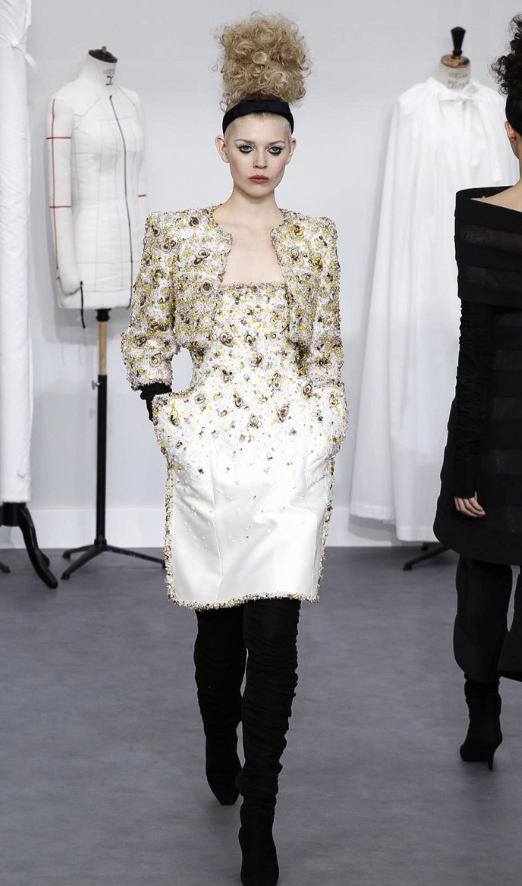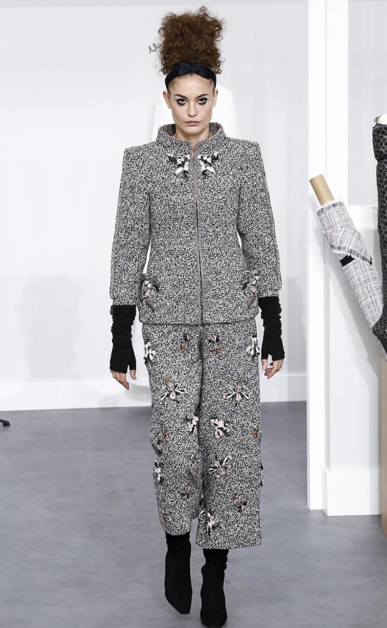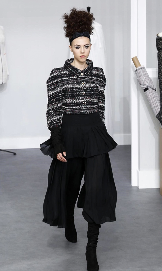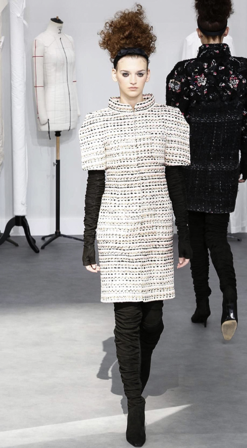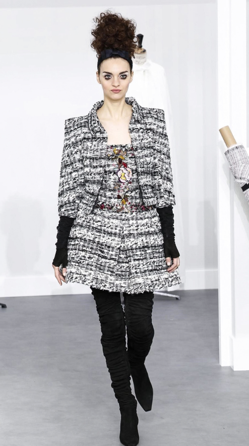A coleção contou com muito tweed bordado, saias, blazers e vestidos maravilhosos! Para dar o ar invernal na coleção, usou botas acima do joelho pretas de camurça e luvas.
