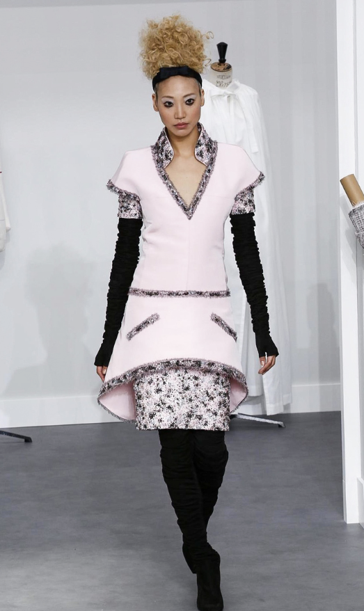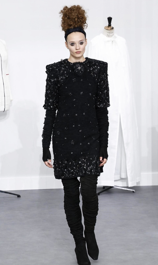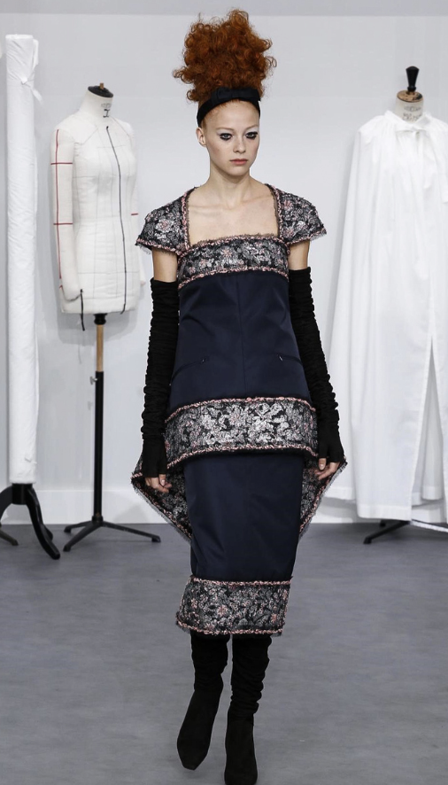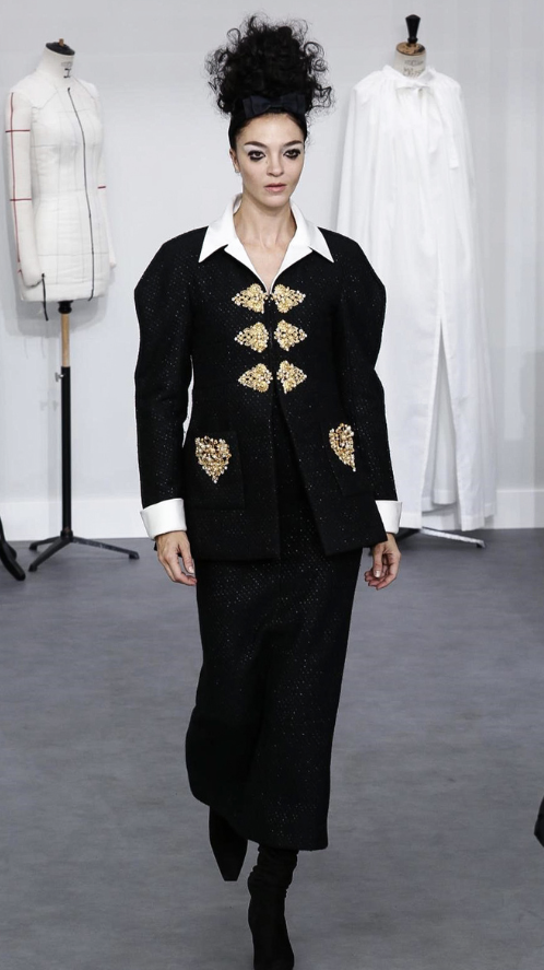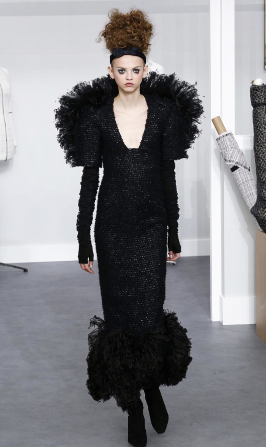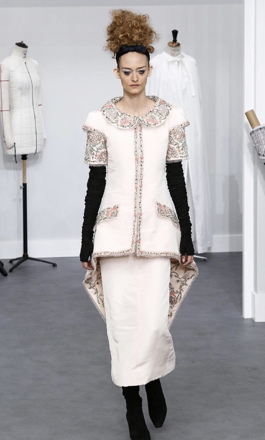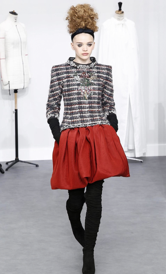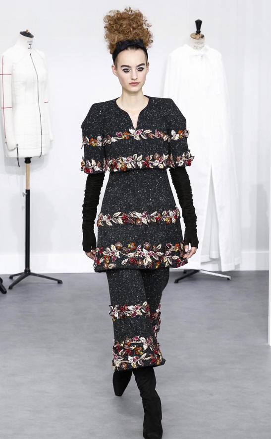 A coleção contou com muito tweed bordado, saias, blazers e vestidos maravilhosos! Para dar o ar invernal na coleção, usou botas acima do joelho pretas de camurça e luvas.