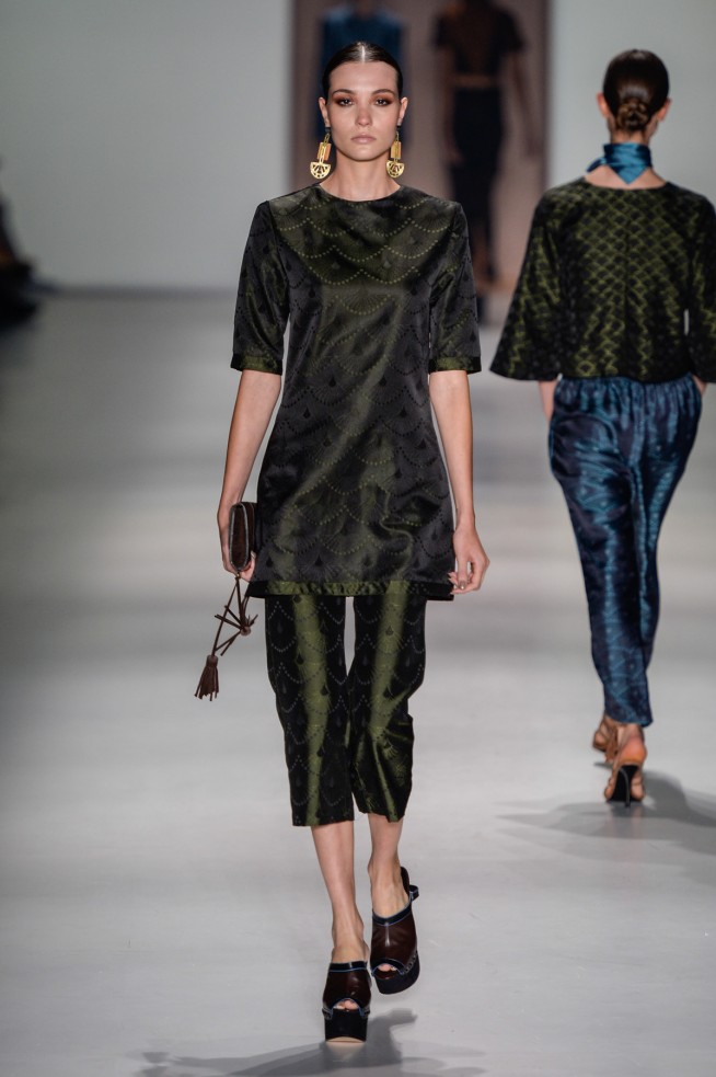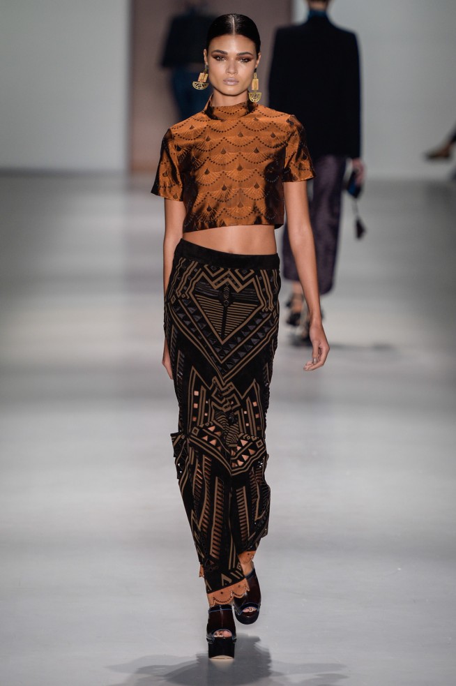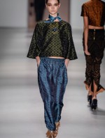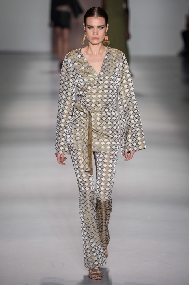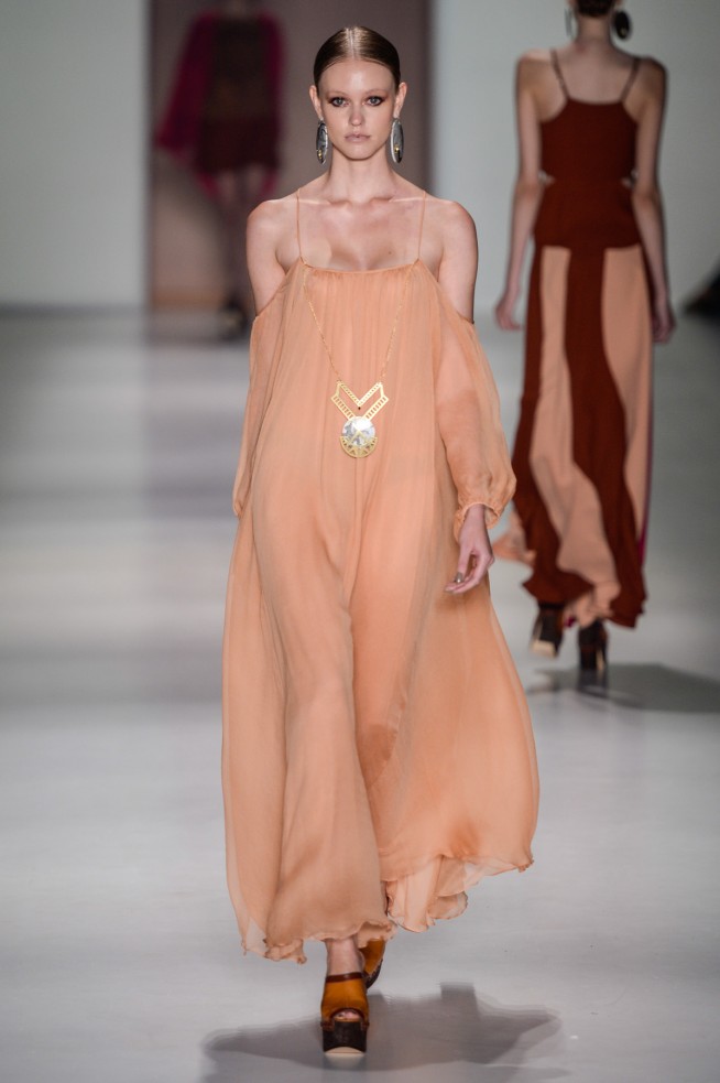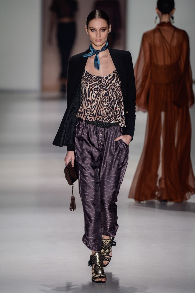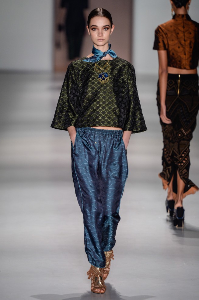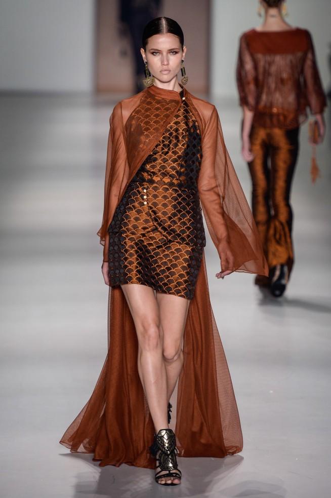 A passarela mostrou influências do lado glamouroso da década de 1970 com um toque de exotismo oriental.
