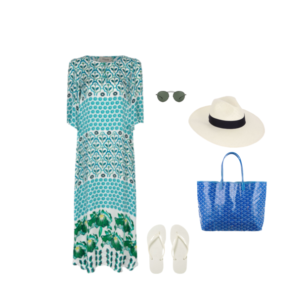 -Saída de praia Temperley London; – Chinelo Havainas; – Bolsa Goyard; – Oculos Mykita + Maison Margiela; – Chapéu Borsalino