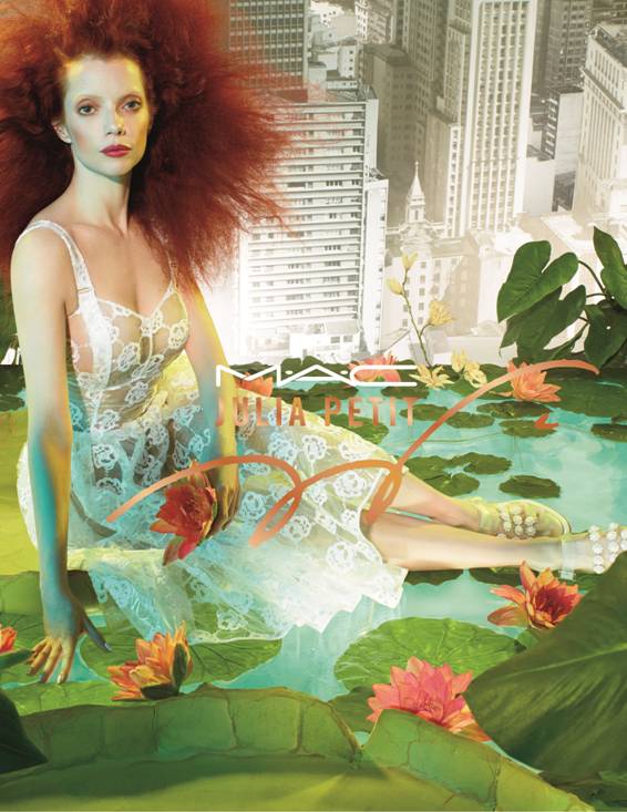 Julia Petit desenvolveu uma coleção de produtos de maquiagem em parceria com a M.A.C, que começa a chegar amanhã nas lojas do Brasil. A grande inspiração para os tons das paletas é a união dos encantos naturais com a paisagem urbana, por isso a imagem da vitória-régia e de prédios de metrópoles aparecem na campanha.