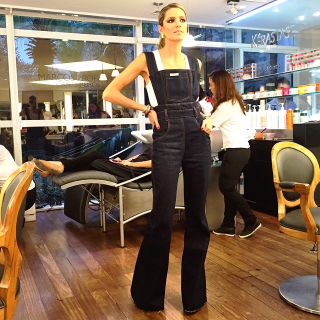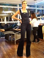 O macacão jeans (que lembra uma jardineira) está na moda! O modelo da vez é de denim tradicional e longo, com modelagem ajustada.