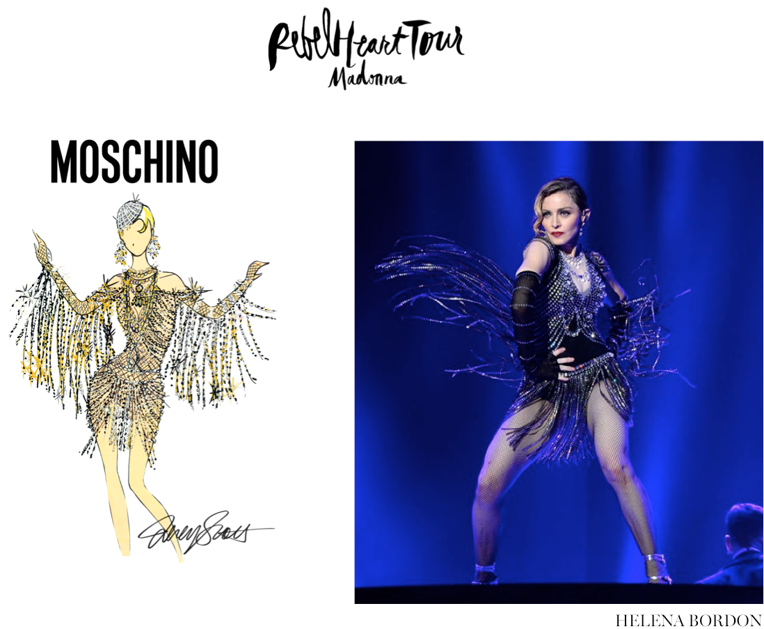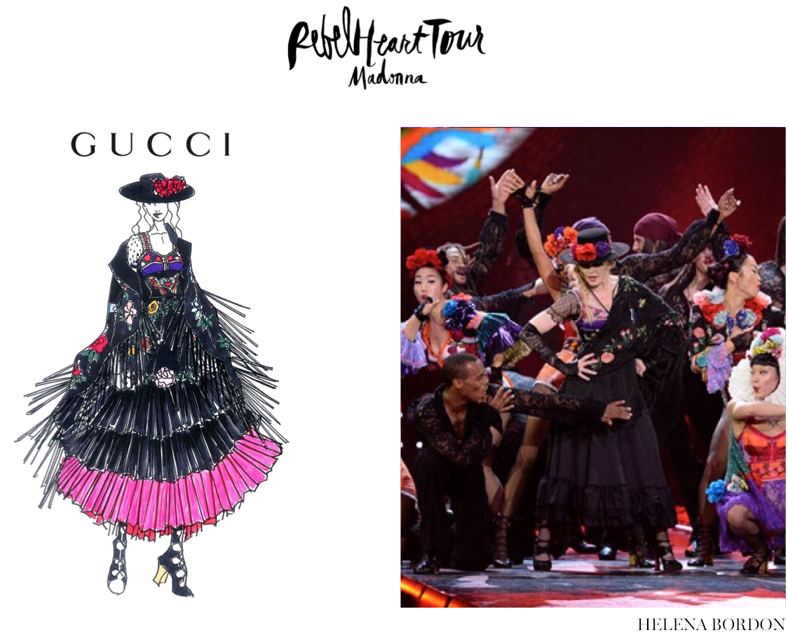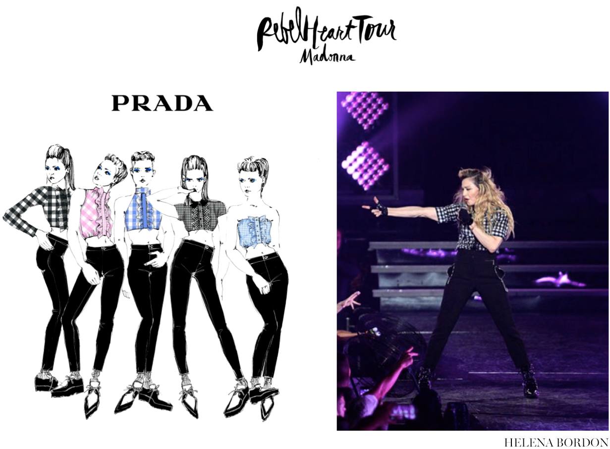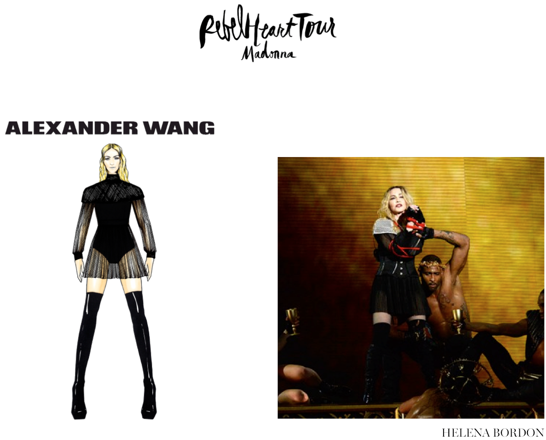 Como já haviamos anunciado aqui no site, a nova turnê mundial de Madonna, chamada Rebel Heart tour, está repleta de looks assinados por diversas marcas e designers amigos da rainha do pop! A turnê, que começou em Montreal, no Canadá, passou ontem por Nova York e levou o Madison Square Garden à loucura! Separamos alguns dos croquis dos looks usados por Madonna e comparamos com a versão final. Tem modelos da Gucci, Moschino, Alexander Wang, Prada e muitos outros. Além de muitos acessórios e sapatos Miu Miu, um mais lindo e poderoso que o outro. Bom, se tratando de Madonna não poderíamos esperar menos. Adoramos! Confira abaixo alguns dos looks vistos até agora: Captura de Tela 2015-09-18 às 13.57.39
