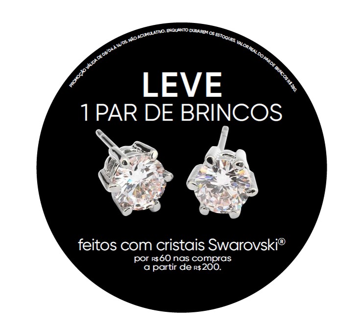 Nas compras acima de R$200 em quaisquer produtos da loja, você pode levar um par de brincos feito com cristais da Swarovski e completar seu presente por apenas R$60, compondo o presente com a sofisticação que sua mãe merece.