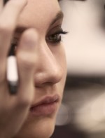 O batom nude é o Burberry Kisses, Nude Beige 01. Nos olhos, foram usadas as sombras cremosas Charcoal 114 (mais escura) e a Mink 102. Para criar esse efeito lindo e esfumado na linha d’água, a grife apostou nos lápis Efortless Kohl Poppy Black 02 e Strom Green 06.