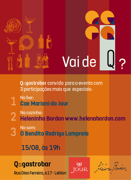 Essa festinha vai marcar a volta do projeto ?Vai de Q??, e o Diógenes de Queiroz, meu amigo mais que querido, perguntou se eu não queria participar e de quebra lançar o site em terras cariocas. Não resisti, é claro! Além de receber os convidados, vou preparar uma receita especial de estrogonofe de filé, que eu amo e será servida para quem quiser jantar num dos lugares mais legais do Leblon. Tudo acontece a partir das 19 horas. Se estiver na cidade apareça. Show!