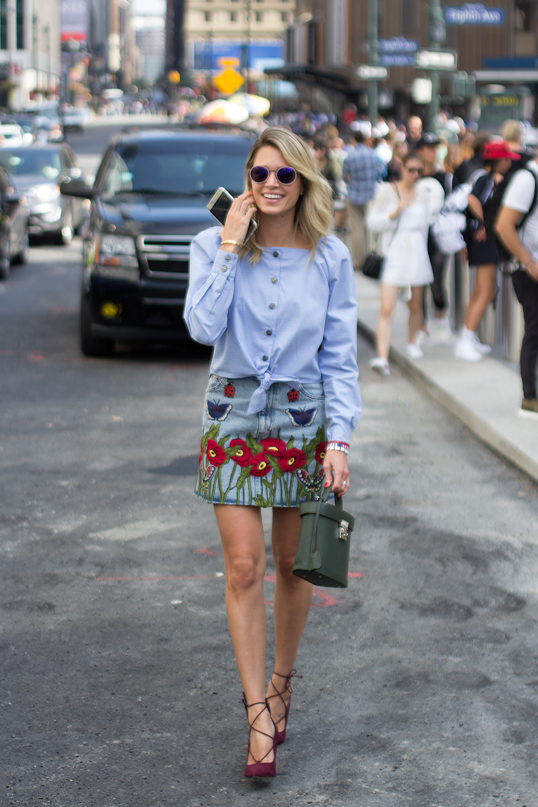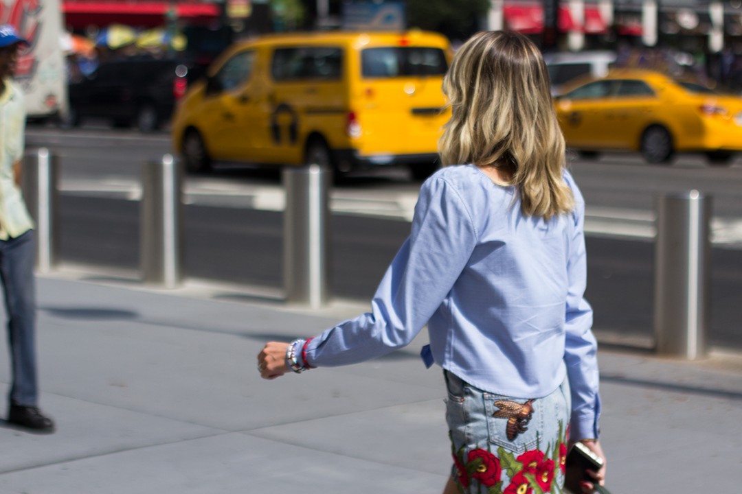 I love the colors! The way how knotted shirt is teamed with this denim skirt is simply AMAZING! The printed mini denim skirt looks girlish and sooo…sweet! Love the flowers! Sunglasses and strappy shoes >>-