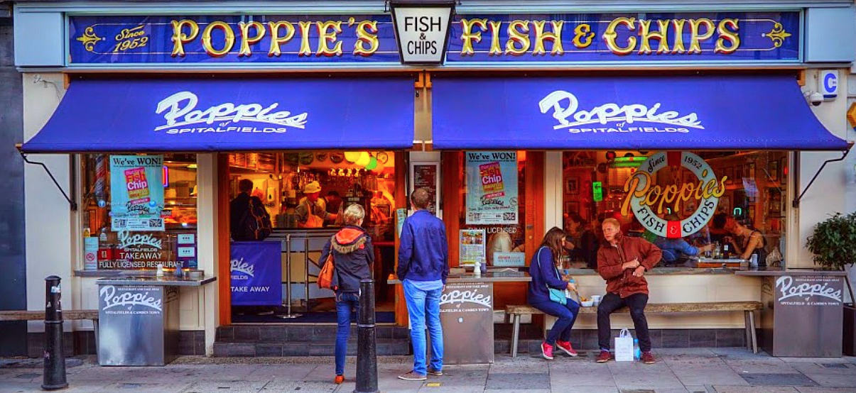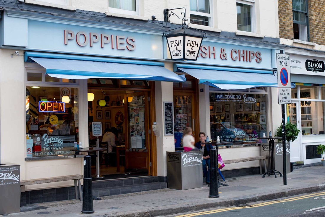 Qual o nome do lugar? Poppies! O restaurante já vale a visita pela decoração! Você se sente em um cenário dos anos 50, com todos os quadros e objetos de época, o uniforme que as garçonetes usam, faz o ambiente ser extremamente agradável. O Fish and Chips deles é uma tradição, e ainda é servido a moda antiga: no jornal. Claro que hoje o jornal é de mentira, e está mais para uma estampa em um papel apropriado. Você pode sentar e se deliciar, ou take away!