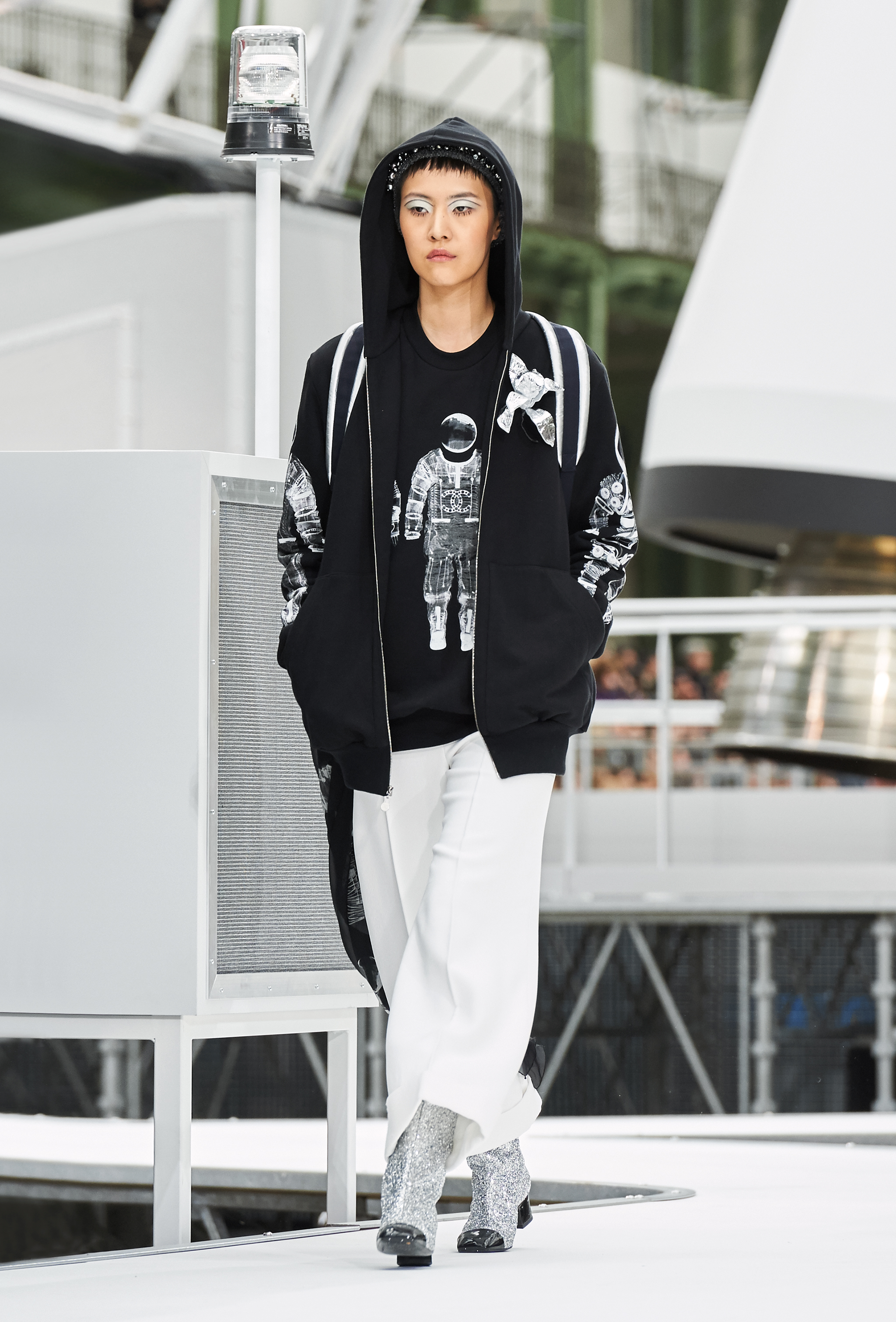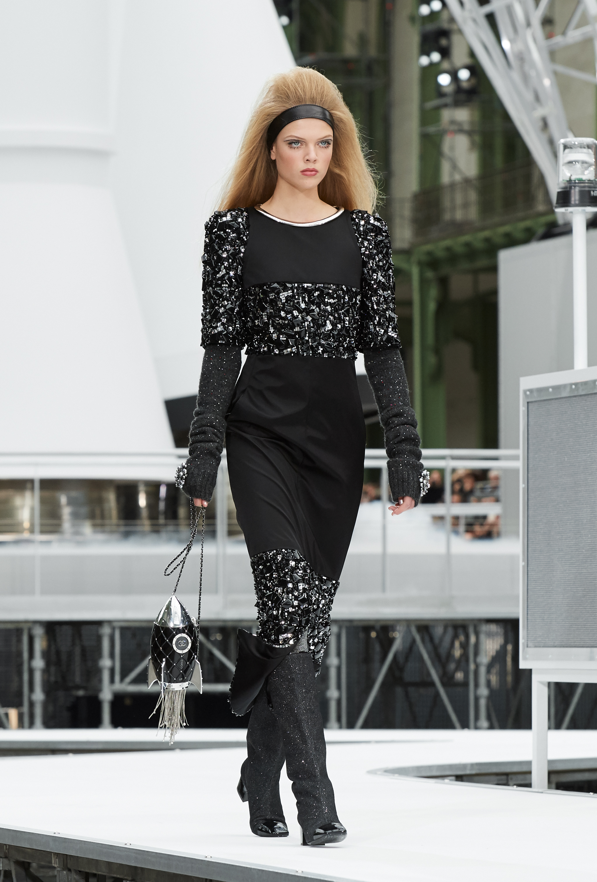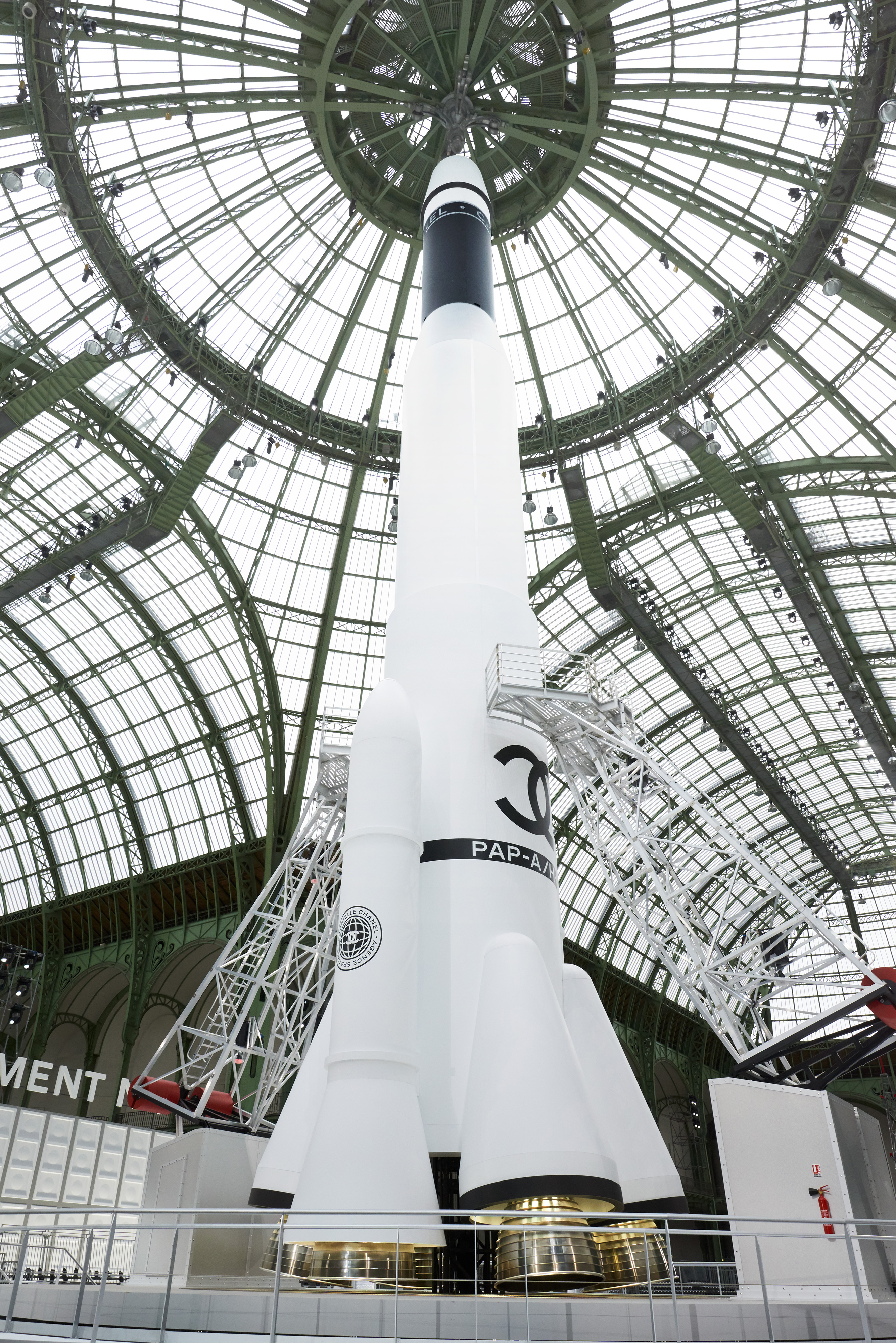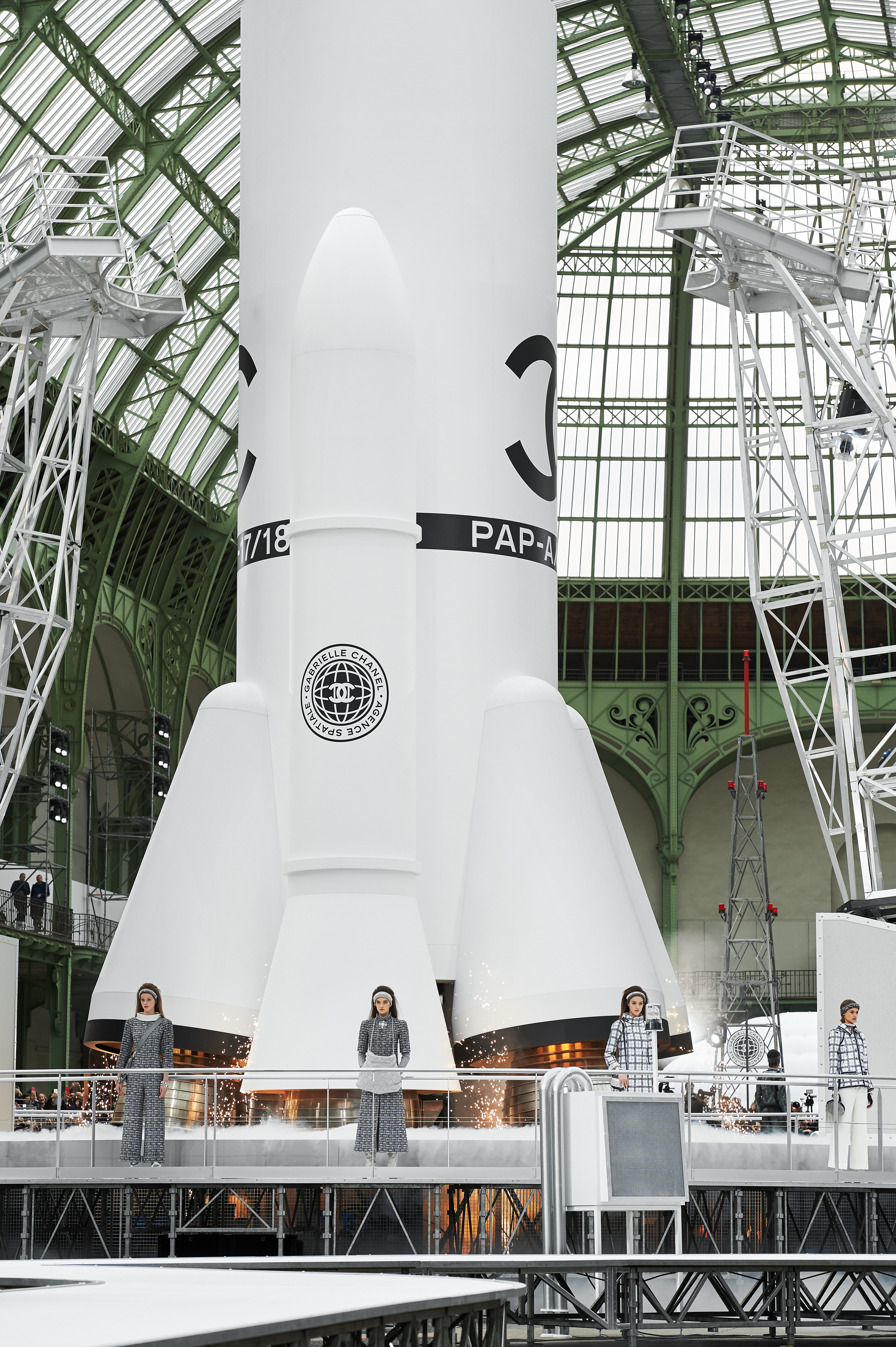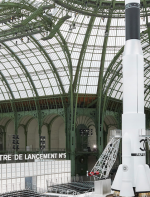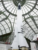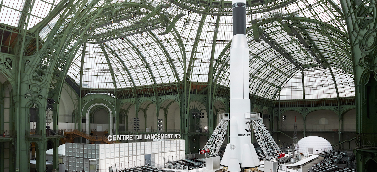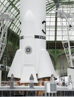 Um desfile que decolou para o espaço sideral teve uma pegada dos anos 60 e transformou o Grand Palais em uma base espacial com direito a um foguete em tamanho real, com 35 metros de altura, estilizado com logotipo da marca e instalado no centro da locação (e que se distanciando 10 metros do solo em direção ao teto de vidro do local).