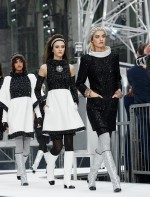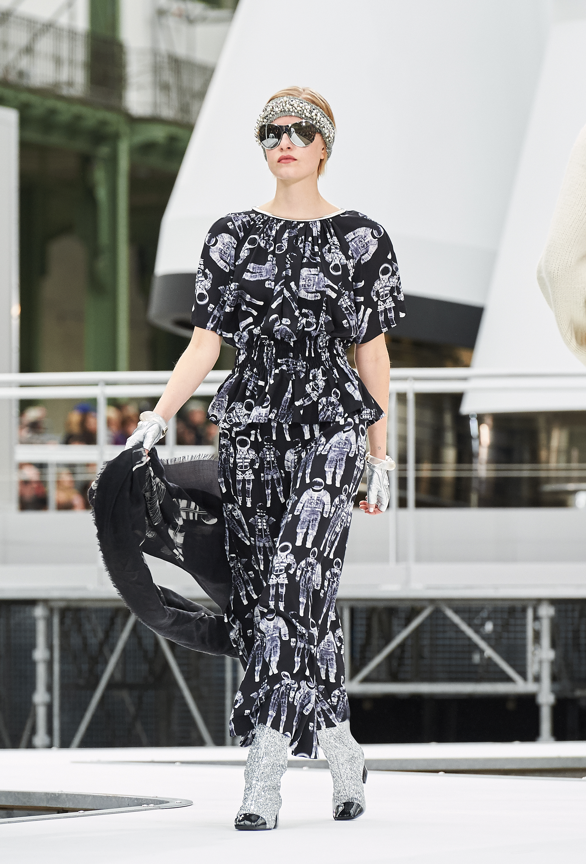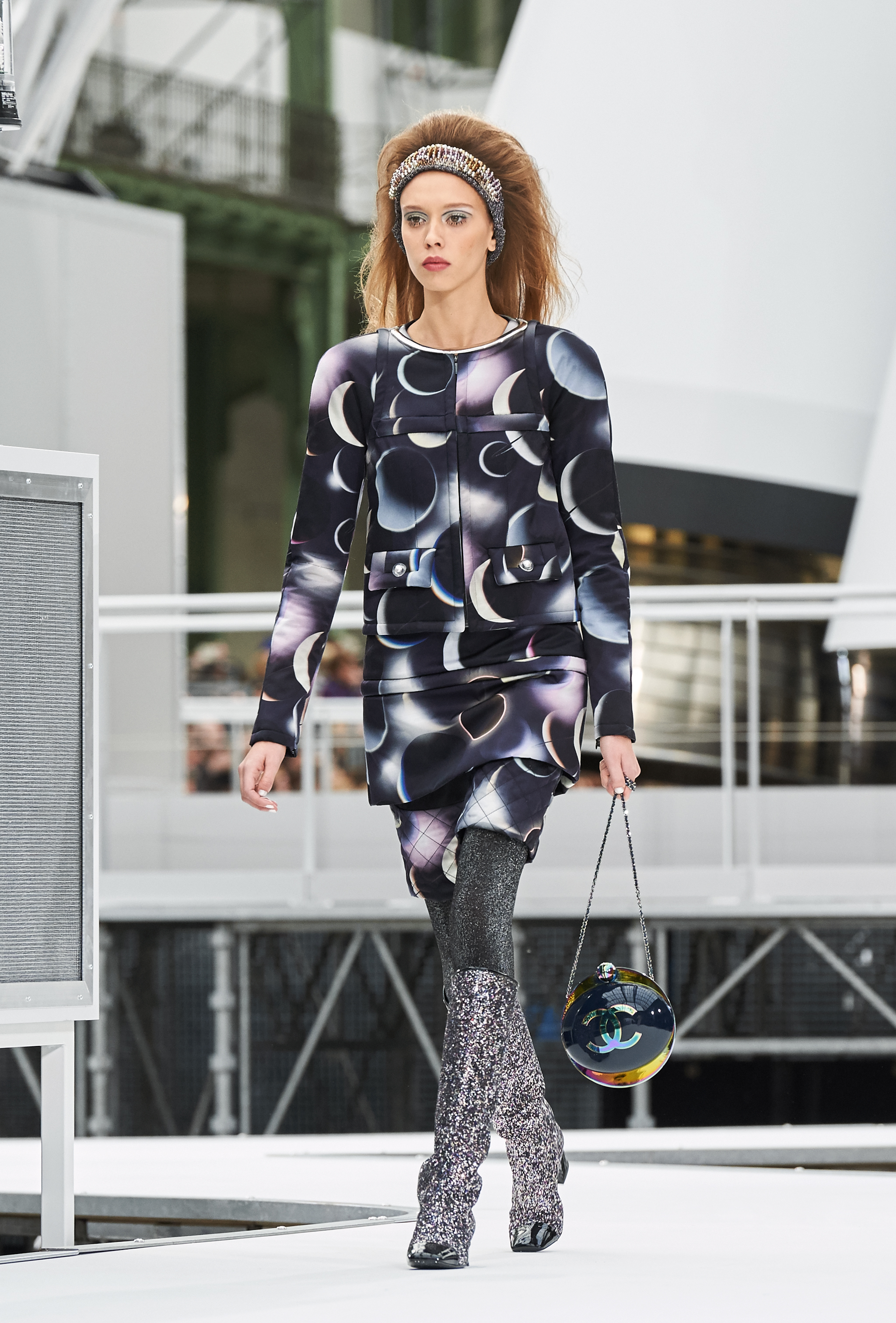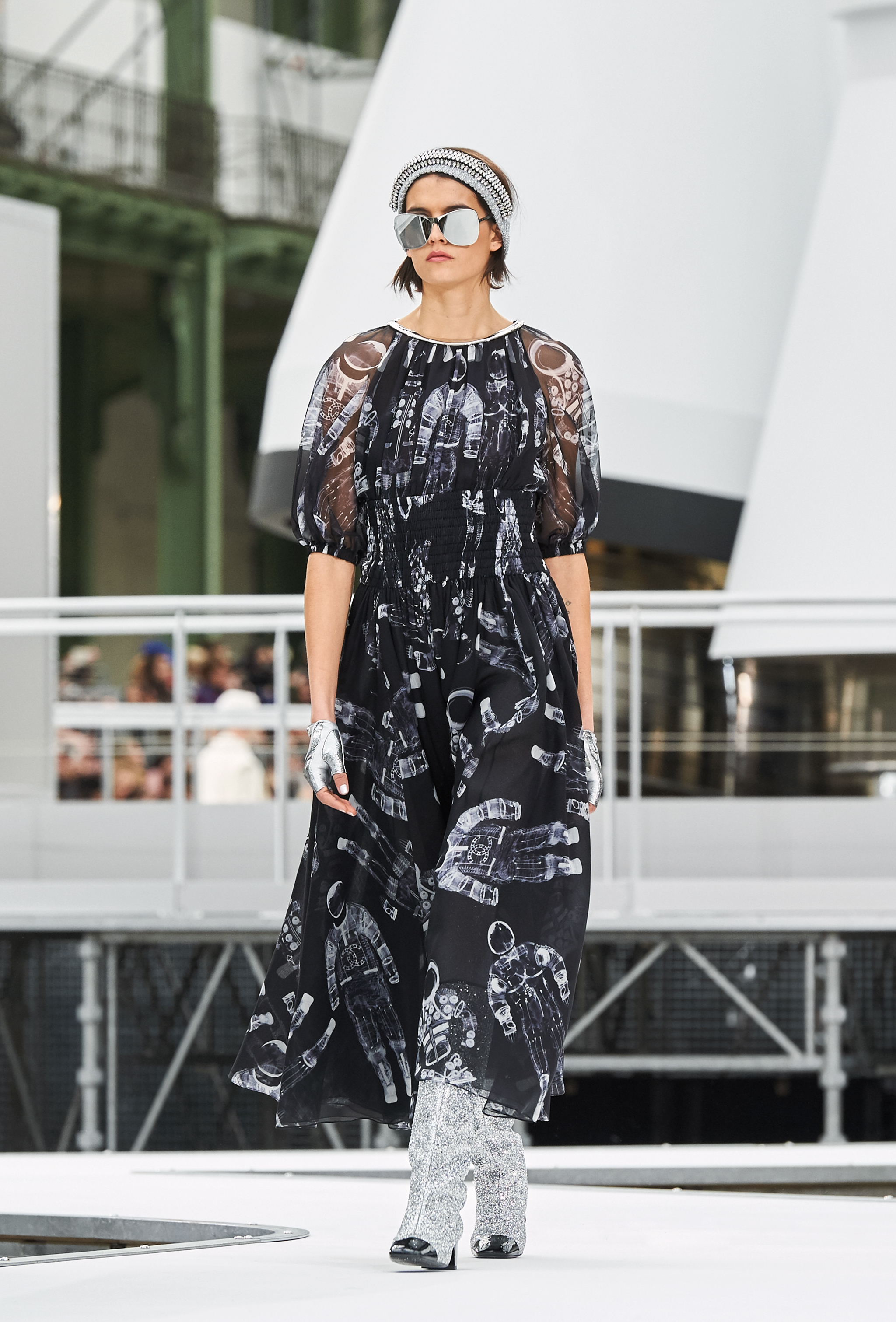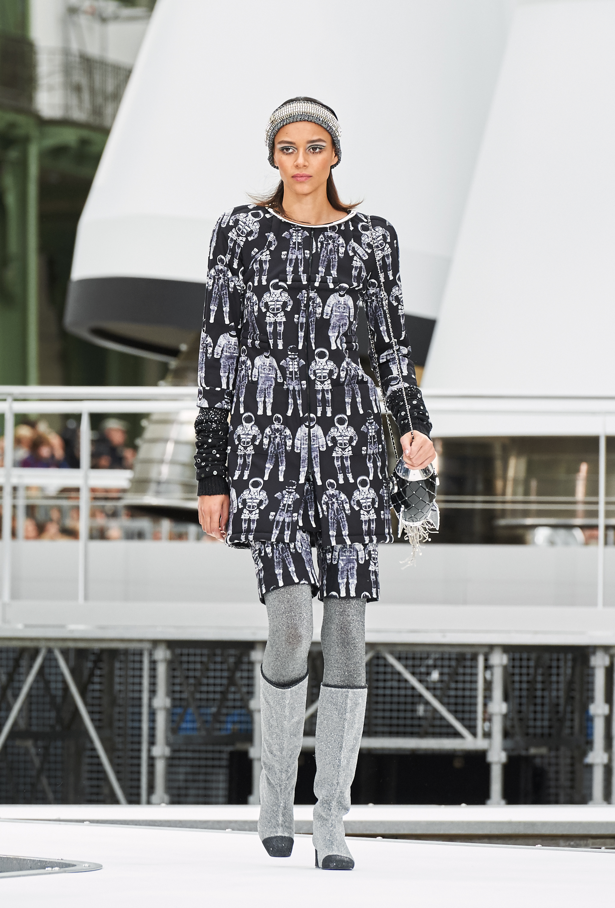 Um desfile que decolou para o espaço sideral teve uma pegada dos anos 60 e transformou o Grand Palais em uma base espacial com direito a um foguete em tamanho real, com 35 metros de altura, estilizado com logotipo da marca e instalado no centro da locação (e que se distanciando 10 metros do solo em direção ao teto de vidro do local).