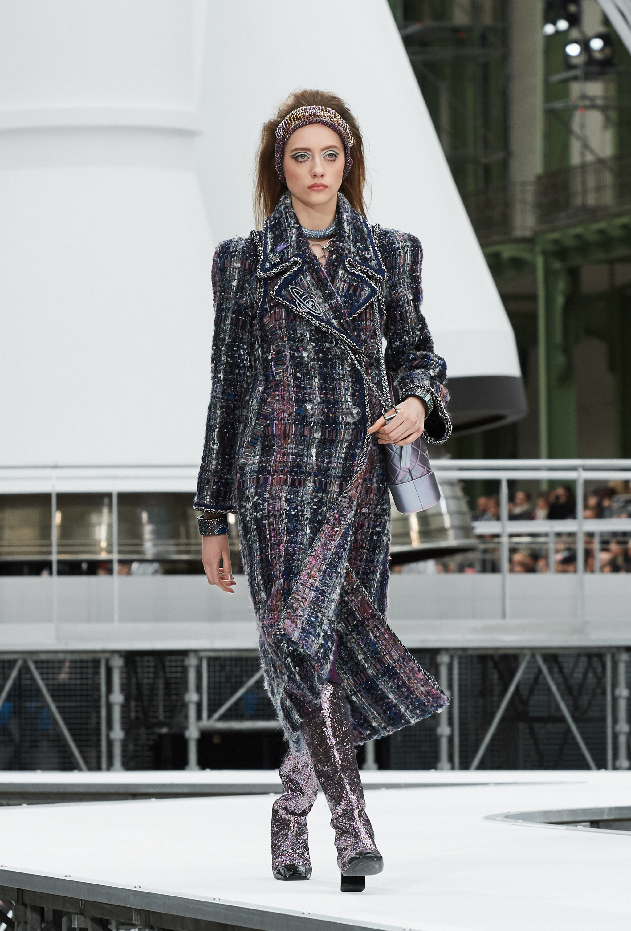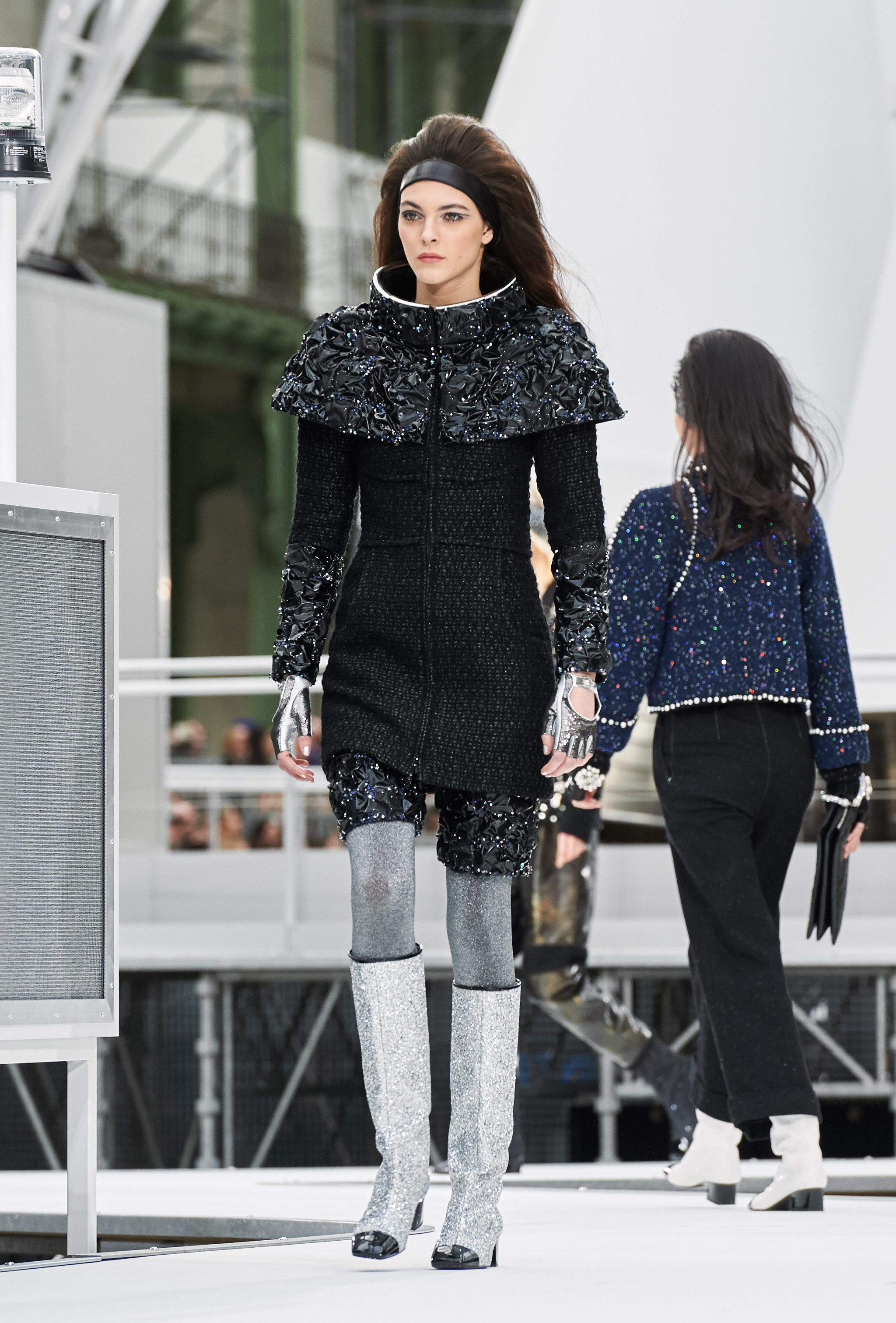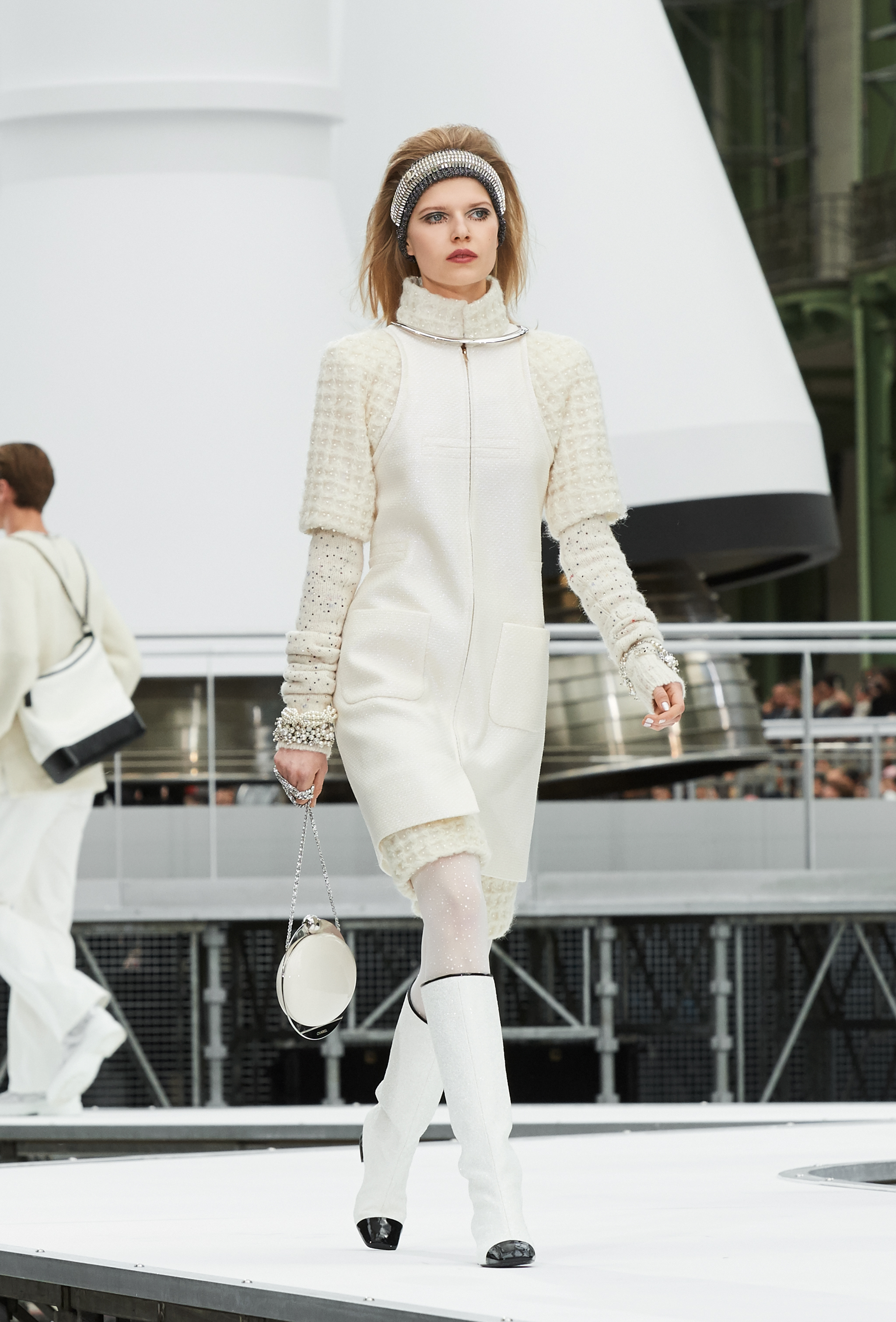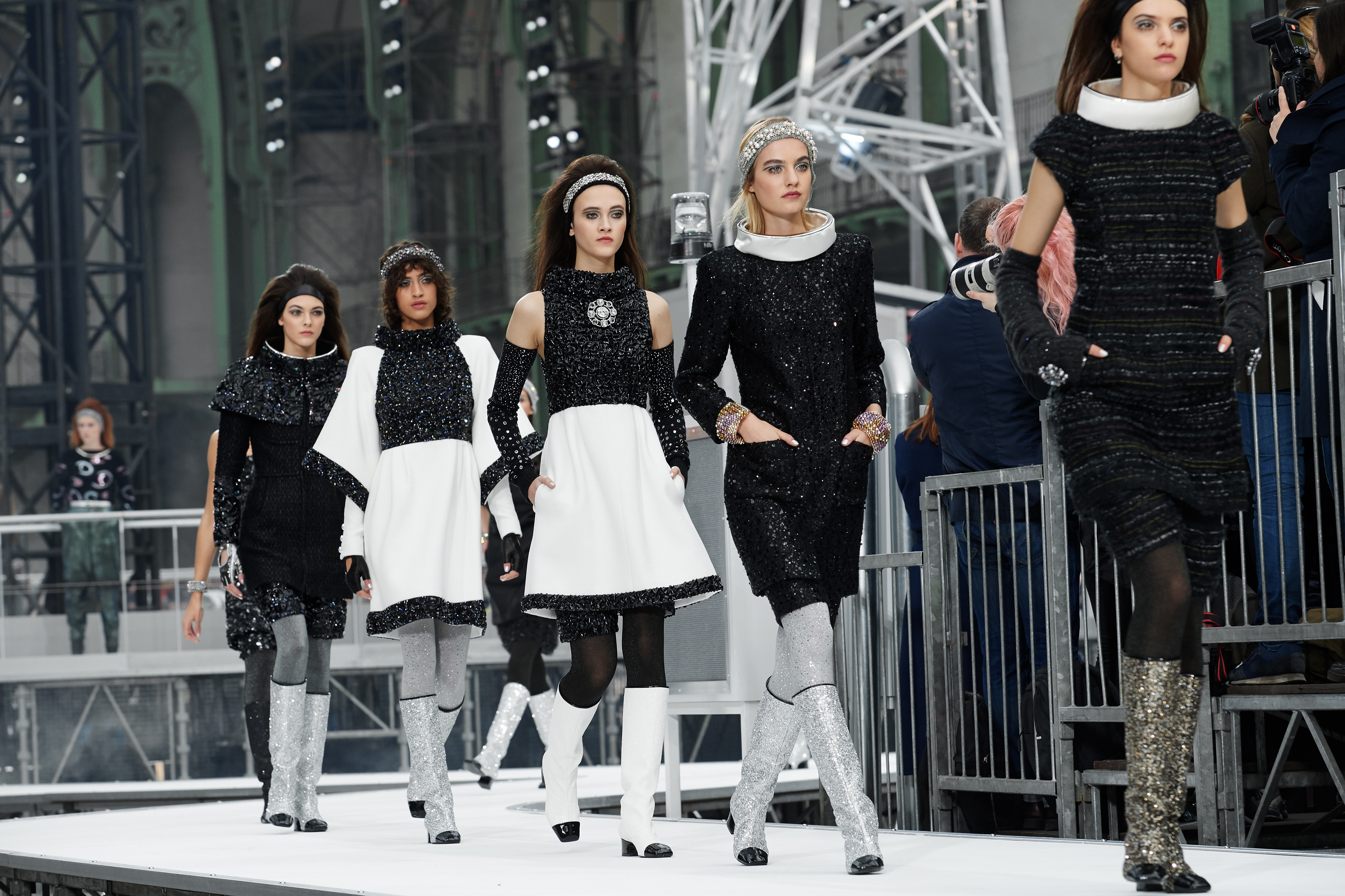 Um desfile que decolou para o espaço sideral teve uma pegada dos anos 60 e transformou o Grand Palais em uma base espacial com direito a um foguete em tamanho real, com 35 metros de altura, estilizado com logotipo da marca e instalado no centro da locação (e que se distanciando 10 metros do solo em direção ao teto de vidro do local).